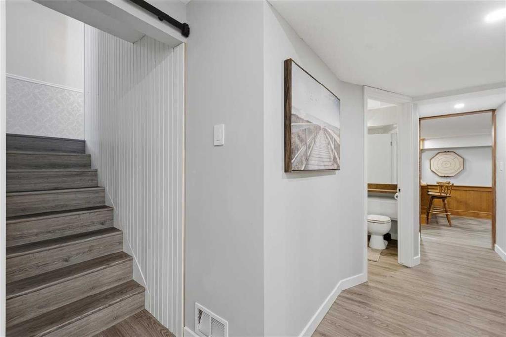 Upstairs, you’ll find four generously sized bedrooms, a full bathroom and a flex space. The lower level offers a truly unique primary bedroom. It’s private, spacious, and thoughtfully designed with built-in bookshelves, room for a reading nook, dual closets, and a large 5-piece ensuite featuring double sinks, a tiled shower, and a soaker tub.