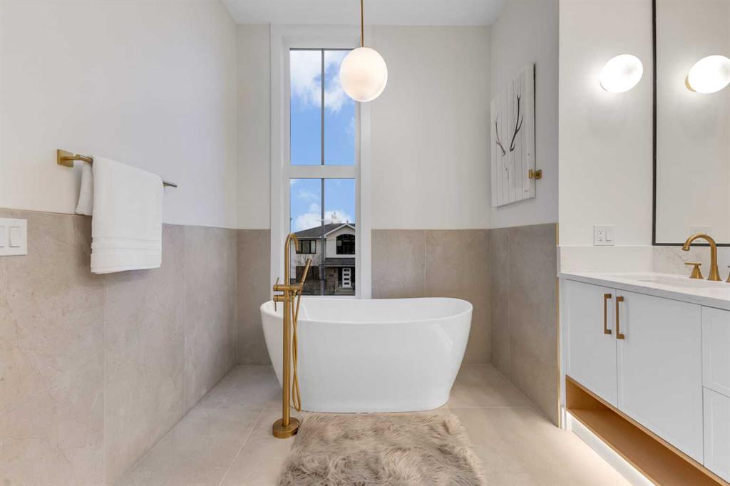 Upstairs, the primary retreat offers a luxurious escape with a recessed ceiling, two walk-in closets, and a spa-inspired ensuite complete with heated tile floors, dual sinks, quartz counters, a freestanding soaker tub, and a fully tiled glass shower. Two additional bedrooms, each with private ensuites, and a laundry room complete this level.