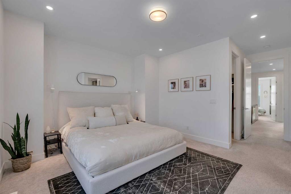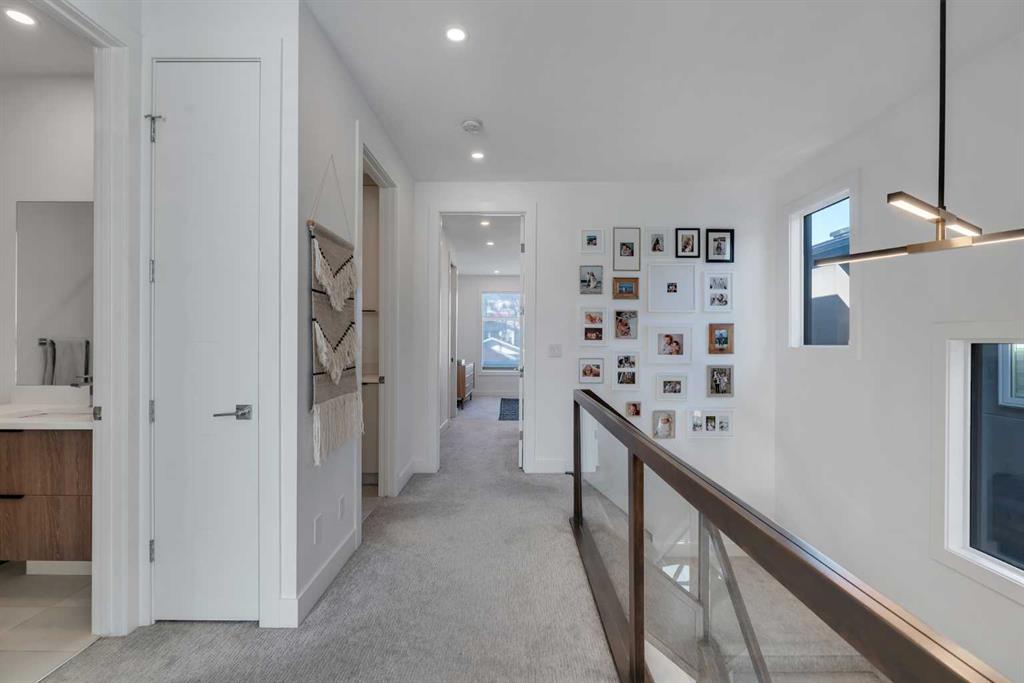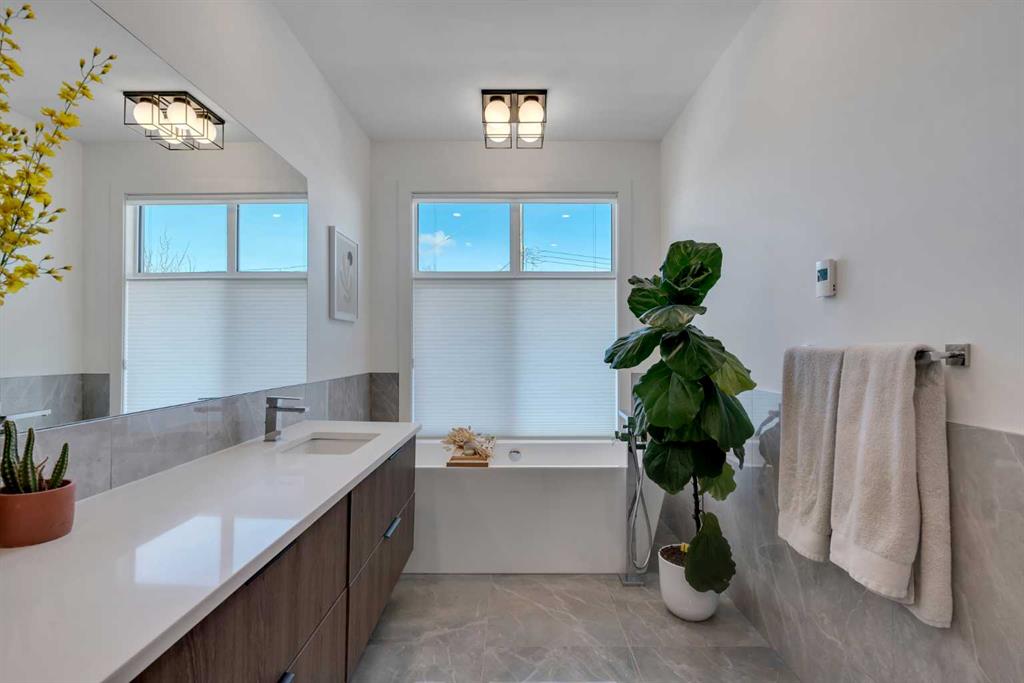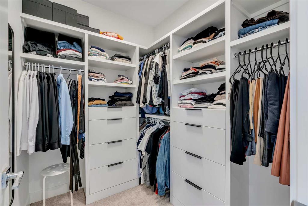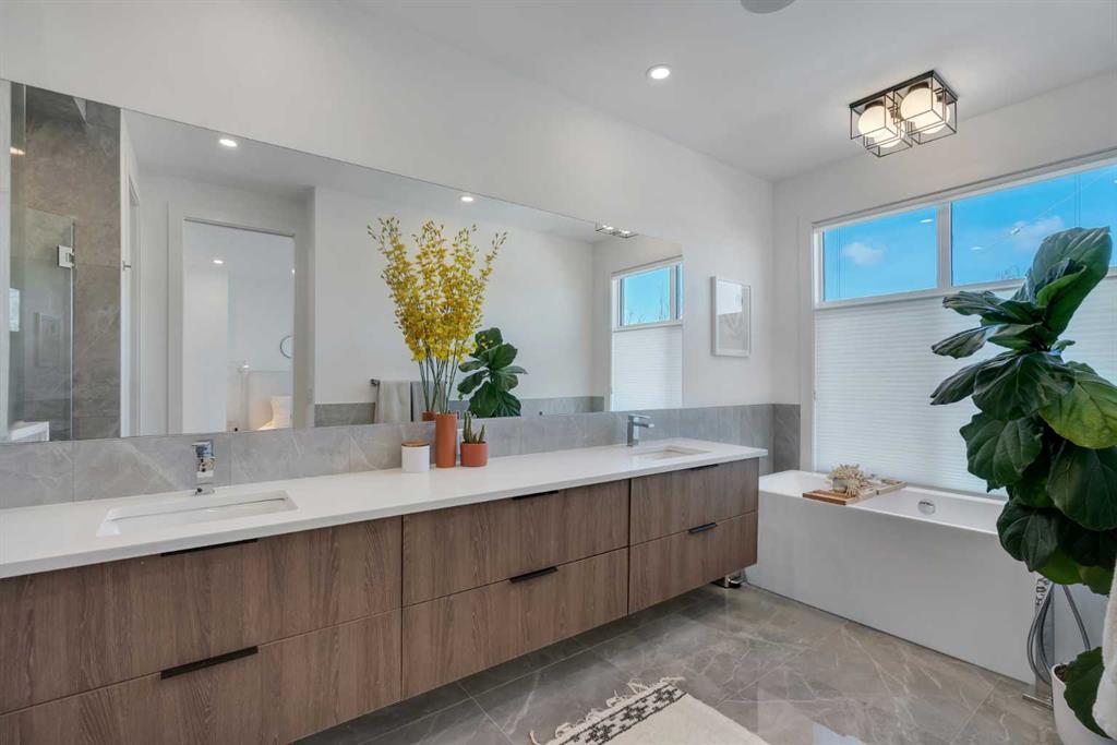 Upstairs boasts 3 spacious bedrooms, upper laundry with sink, a full 4-pc bathroom. The primary bedroom includes a walk-in custom closet with organizers, and a 5-pc spa-like ensuite featuring, heated tile floors, enclosed toilet area, a double vanity, oversized walk-in tiled shower. Skip the spa with upgraded rain shower fixtures, and a showstopping standalone soaker tub right in your own ensuite. Custom blackout window coverings in every bedroom and central AC throughout for those hot summer days.