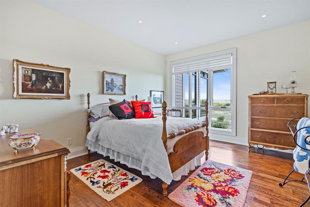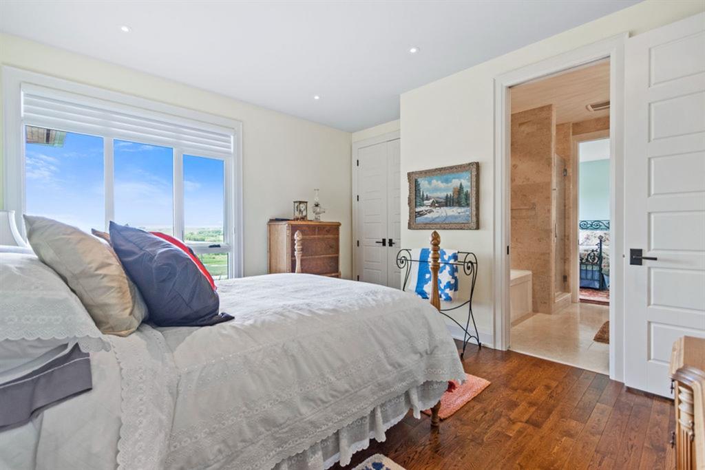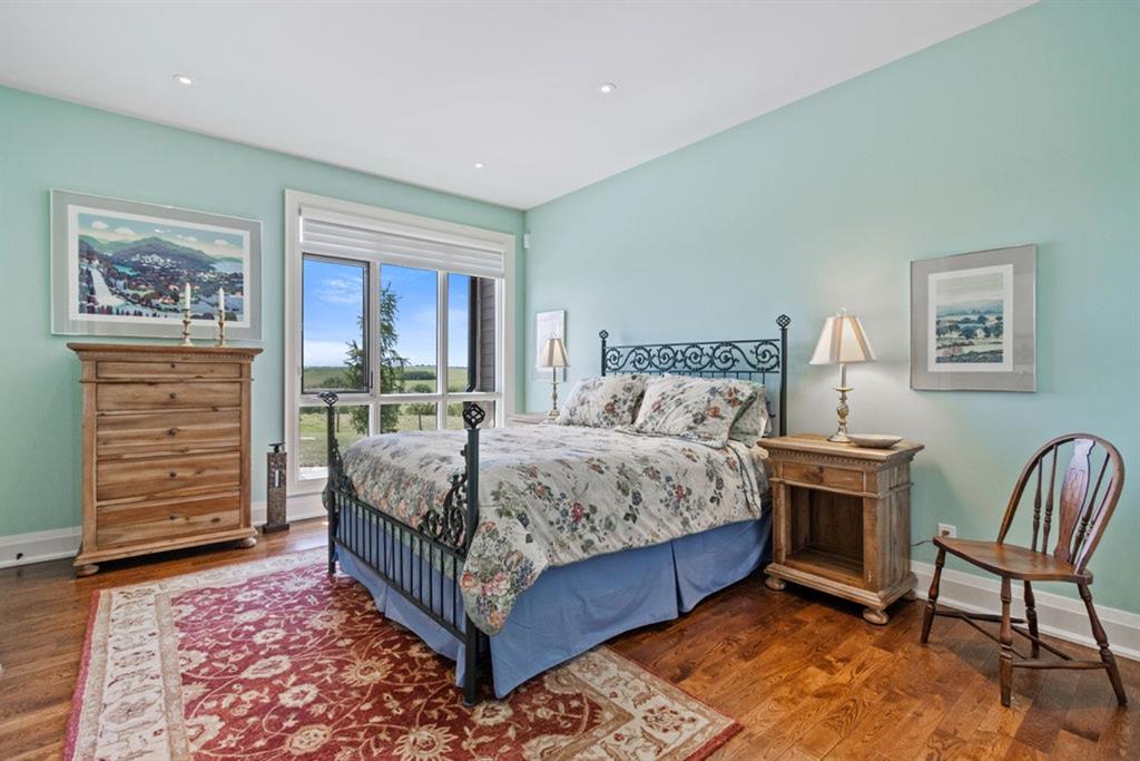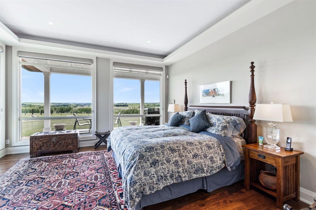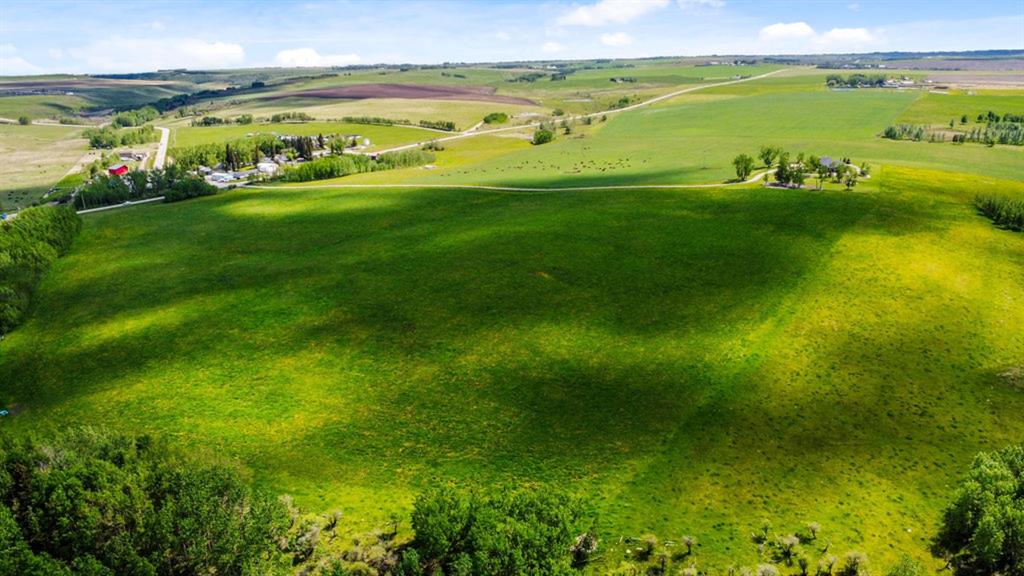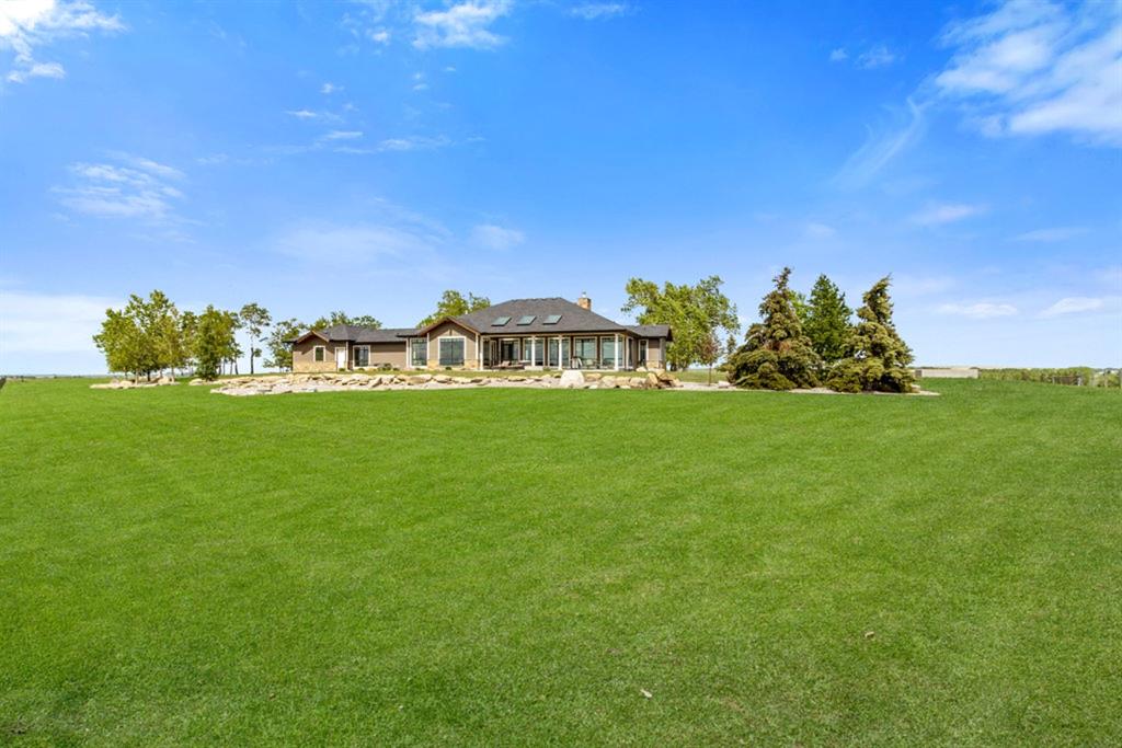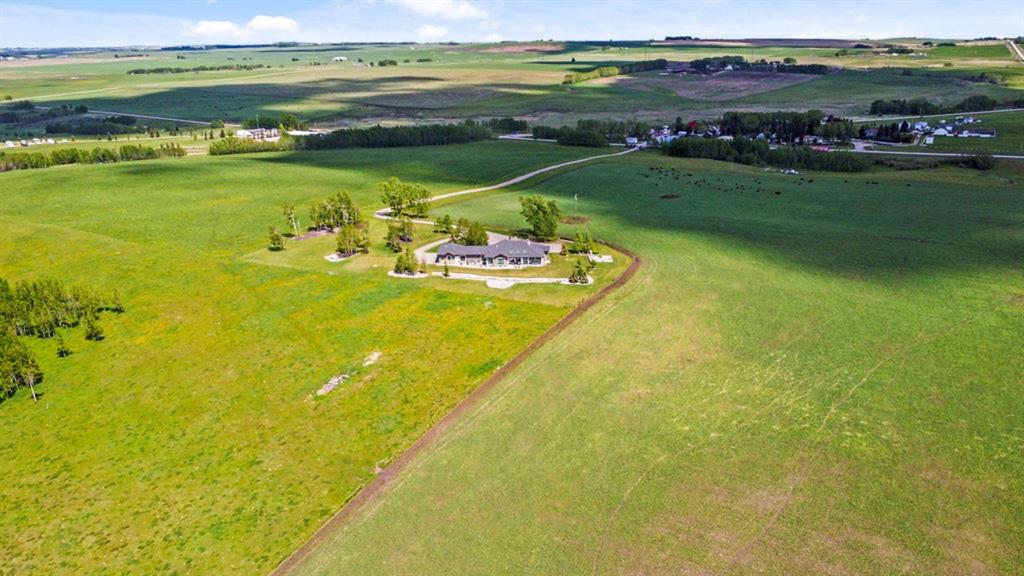 Stunning Custom Built Bungalow sitting atop the biggest hill on 122 acres with breathtaking views in all directions. Unobstructed mountain views to the west, golf course to the north, the friendly hamlet of madden east and south for miles! Enter from your gated private paved lane-way and find this architectural thing of beauty at the peak. This home is just shy of 4000 sq/ft on the main level and boasts another 2700sq/ft of developed space in the basement. The main floor has gleaming hardwood flooring throughout along with slate entry and heated tile flooring in all the bathrooms. Oversized low UV transmission windows with Hunter Douglas blinds throughout helps capture the most amazing landscapes. The executive chefs kitchen has stainless steel appliances including a Wolff gas stove, Sub Zero fridge, Dacor wall oven and microwave. All cabinetry milled by Legacy with soft close and upgraded shelving and storage. Huge center island with Cambrian Black satin granite is a classic focal point in this exquisite home. There are two dining areas for all sizes of gatherings and a huge living room with descending TV from the ceiling and natural gas fireplace. The large master bedroom comes with a 4 piece en-suite with modern tiled shower, his/her sinks in Bianco Rhino marble and a walk in California closet. Main floor is completed with two other bedrooms with California closets and Jack n Jill 4 piece bathrooms, an office, and den adjacent dining room. The second fireplace is found in the library or study for those that like to kick back with a glass of wine and enjoy a good book. Basement is finished with a huge family/ games room and tons of storage. The attached triple garage measures 38×22 it has a separate entry and big bright windows and upgraded wood doors. The west facing concrete patio is covered with skylights so you can enjoy it in all weather! The property is professionally landscaped with mature trees and raised garden boxes for the green thumb. Extra features include 2 independent furnaces and AC systems, in-floor heating, water softening system, instant hot water, in-wall Vacu flo, Sonos sound, Security system and more! Combination of pasture and grade A crop land with good perimeter fencing. Rare opportunity to own a beautiful parcel of land this size commutable to Calgary with an equally magnificent home to match!