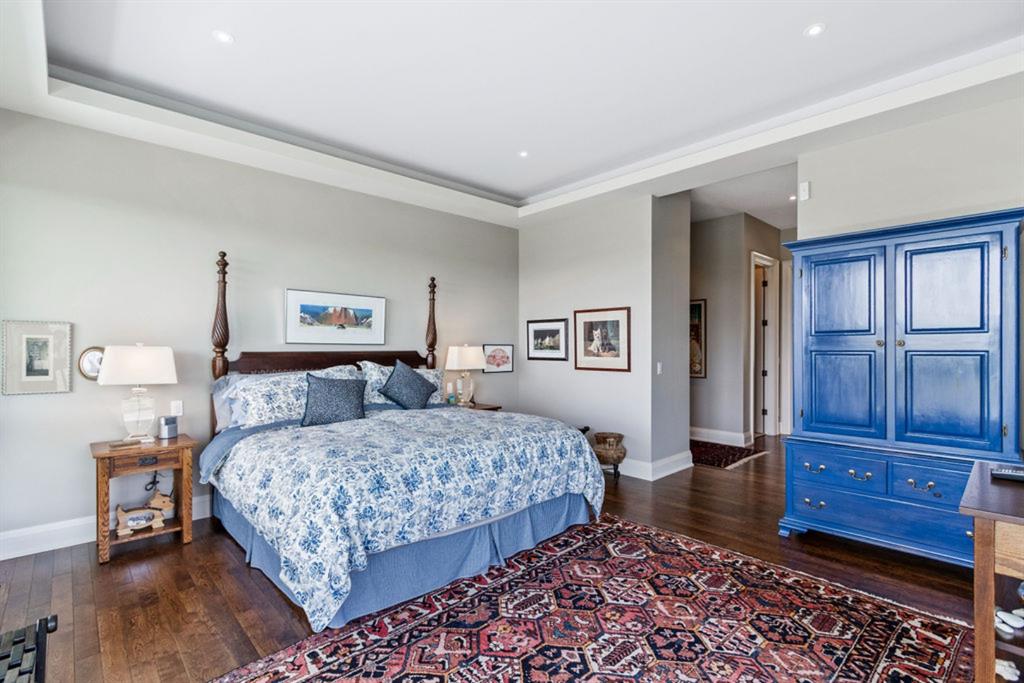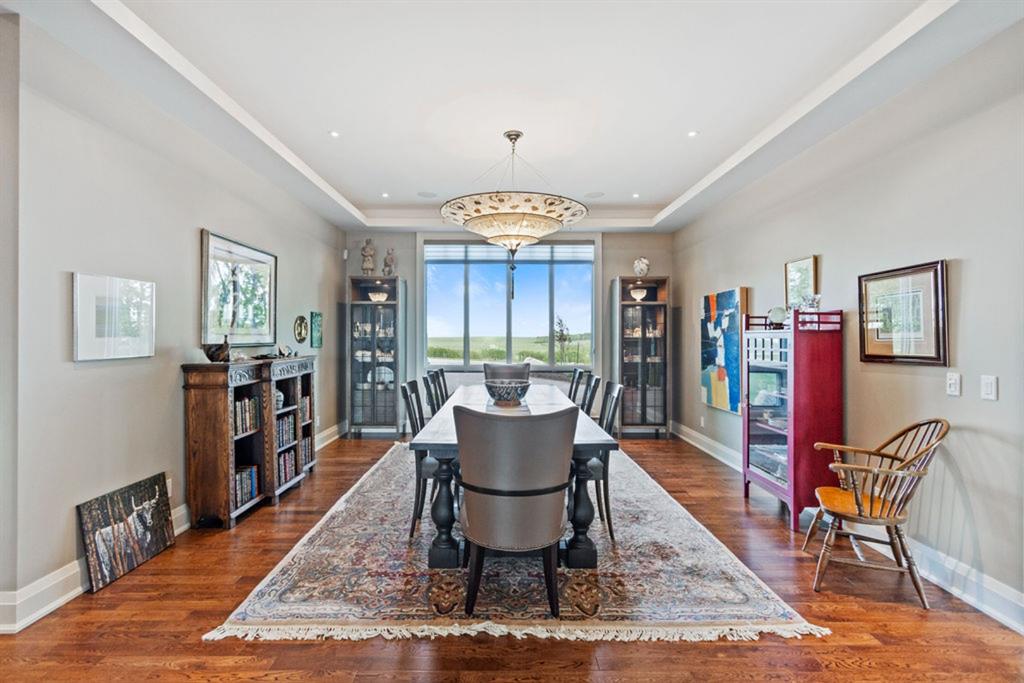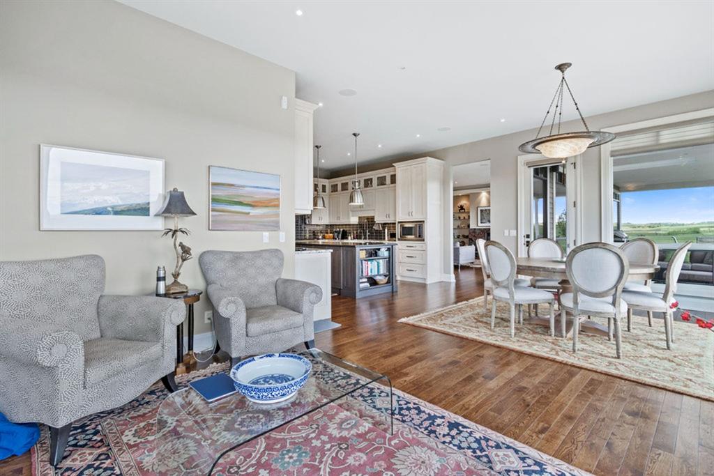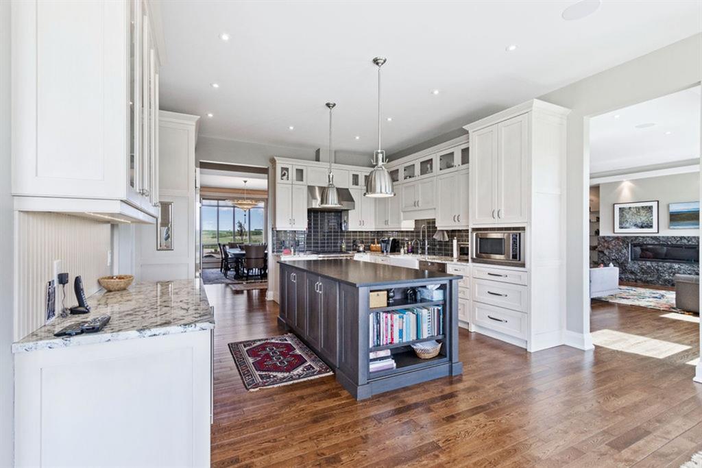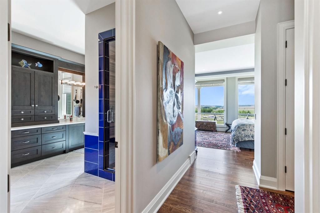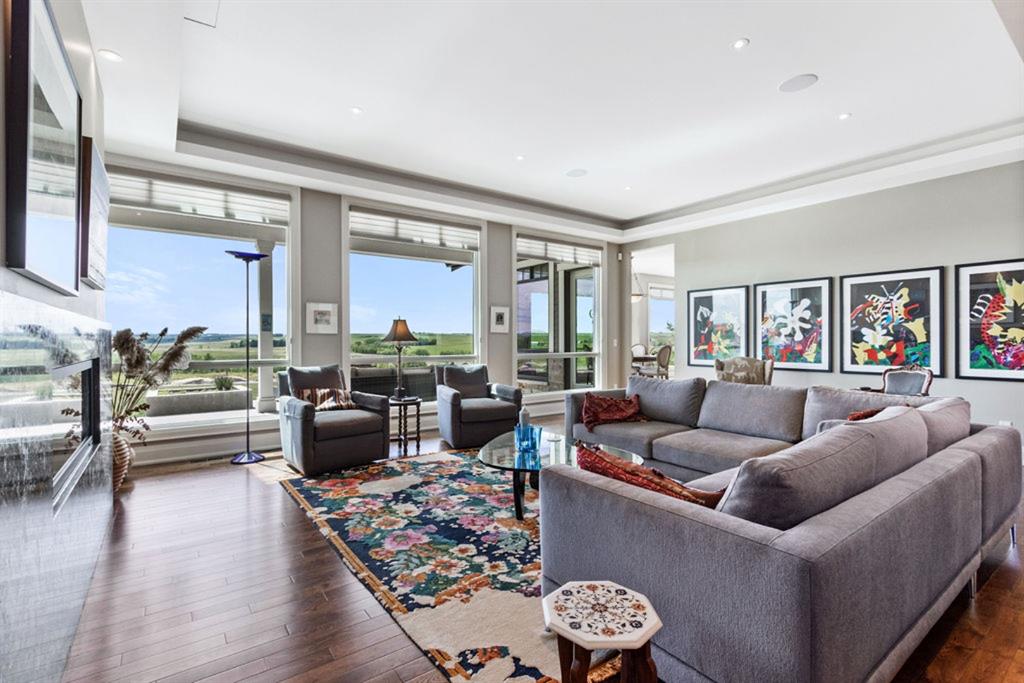 Stunning Custom Built Bungalow sitting atop the biggest hill on 122 acres with breathtaking views in all directions. Unobstructed mountain views to the west, golf course to the north, the friendly hamlet of madden east and south for miles! Enter from your gated private paved lane-way and find this architectural thing of beauty at the peak. This home is just shy of 4000 sq/ft on the main level and boasts another 2700sq/ft of developed space in the basement. The main floor has gleaming hardwood flooring throughout along with slate entry and heated tile flooring in all the bathrooms. Oversized low UV transmission windows with Hunter Douglas blinds throughout helps capture the most amazing landscapes. The executive chefs kitchen has stainless steel appliances including a Wolff gas stove, Sub Zero fridge, Dacor wall oven and microwave. All cabinetry milled by Legacy with soft close and upgraded shelving and storage. Huge center island with Cambrian Black satin granite is a classic focal point in this exquisite home. There are two dining areas for all sizes of gatherings and a huge living room with descending TV from the ceiling and natural gas fireplace. The large master bedroom comes with a 4 piece en-suite with modern tiled shower, his/her sinks in Bianco Rhino marble and a walk in California closet. Main floor is completed with two other bedrooms with California closets and Jack n Jill 4 piece bathrooms, an office, and den adjacent dining room. The second fireplace is found in the library or study for those that like to kick back with a glass of wine and enjoy a good book. Basement is finished with a huge family/ games room and tons of storage. The attached triple garage measures 38×22 it has a separate entry and big bright windows and upgraded wood doors. The west facing concrete patio is covered with skylights so you can enjoy it in all weather! The property is professionally landscaped with mature trees and raised garden boxes for the green thumb. Extra features include 2 independent furnaces and AC systems, in-floor heating, water softening system, instant hot water, in-wall Vacu flo, Sonos sound, Security system and more! Combination of pasture and grade A crop land with good perimeter fencing. Rare opportunity to own a beautiful parcel of land this size commutable to Calgary with an equally magnificent home to match!