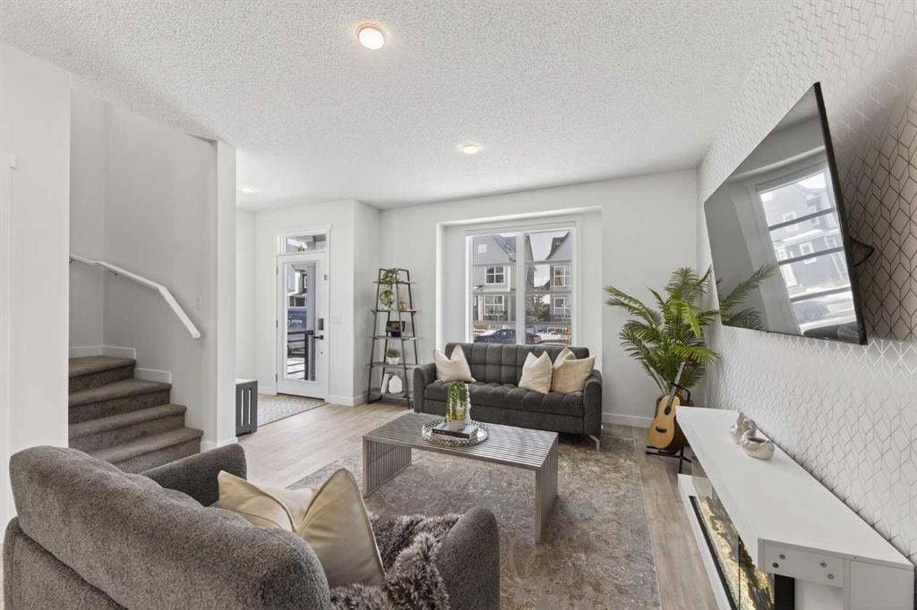 End-unit townhouse with double garage and modern finishes – this is the one you’ve been waiting for! Bright, open-concept main floor featuring wide-plank flooring, large windows, and a spacious living room with a sleek feature wall.
