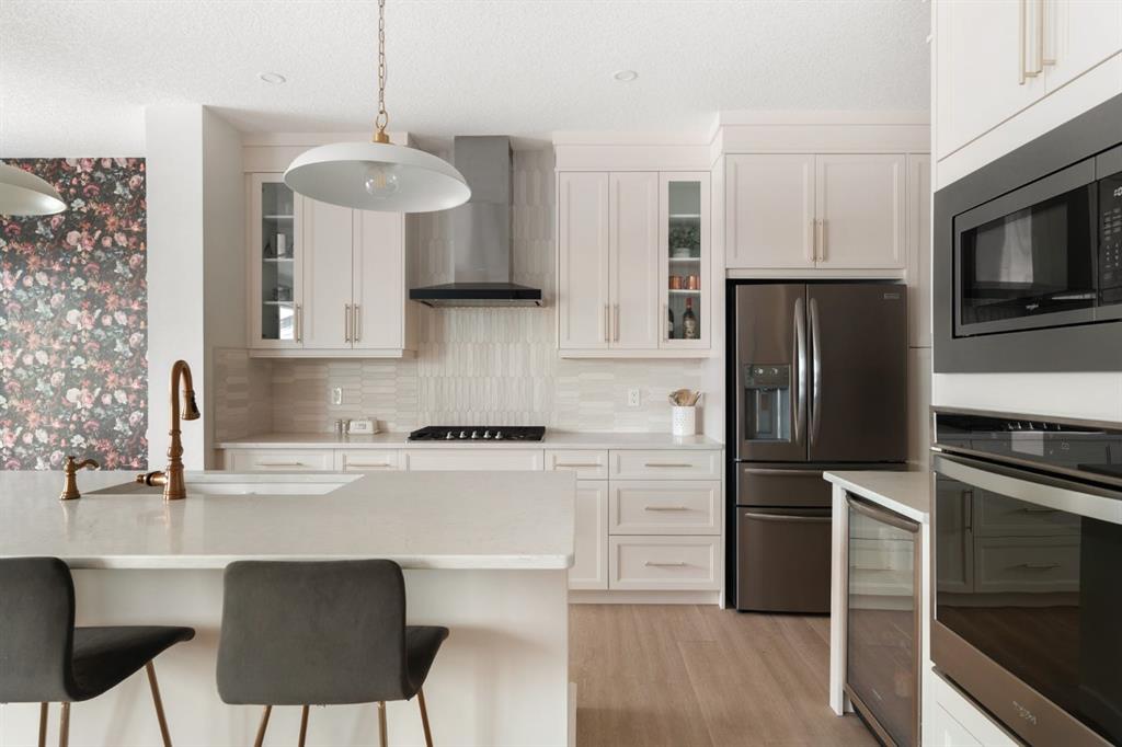 Welcome to this stunning, fully finished walkout home in the highly sought-after community of Cranston’s Riverstone, offering over 3,450 sq ft of thoughtfully designed living space and exceptional upgrades throughout. From the moment you step inside, you’re greeted by a spacious front entrance and a striking open-to-below staircase that sets the tone for this elegant home. Luxury vinyl plank flooring flows through the main floor, featuring a versatile formal dining room with a sophisticated double tray ceiling—perfect for entertaining or easily used as a home office or flex space. Large windows flood the entire main level with natural light, creating a bright and inviting atmosphere. The heart of the home is the open-concept living area, highlighted by a beautiful gas fireplace with white brick surround and classic mantel. The adjacent dining area flows seamlessly into the chef-inspired kitchen, complete with a large central island, extended-height cabinetry, quartz countertops and upgraded stainless steel appliances including a gas cooktop, range hood, wall oven, and built-in microwave. A bar fridge and dedicated coffee bar nook add both function and luxury, while ample cabinetry provides exceptional pantry storage. A well-designed mudroom with built-ins and a stylish designer half bath complete the main floor. Custom lighting throughout the home adds a modern, elevated touch. Upstairs, the elegant open spindle and oak staircase leads to a spacious bonus room perfect for family movie nights. The upper level laundry room is both practical and stylish, featuring designer tile flooring and abundant linen storage. Two generously sized bedrooms are situated at the front of the home and share a well appointed 4-piece bathroom. The primary retreat is a true sanctuary, featuring a moody, sophisticated ambiance accented by a statement chandelier. The luxurious 5-piece ensuite includes dual sinks, a soaker tub, makeup vanity and an oversized fully tiled shower, along with a massive walk-in closet. The professionally finished walkout basement, completed by the builder, offers incredible additional living space with a large open recreation area, a fourth bedroom, a full 4-piece bathroom, as well as extensive storage. Step outside to enjoy the beautifully designed outdoor spaces. The upper fun span deck features durable finishes and sleek glass railing, with stairs leading to the lower level. The private patio below is already equipped with hookups and drainage for a future hot tub. The large northwest-facing backyard provides plenty of afternoon sun and includes a charming storage shed. This home also comes equipped with air conditioning and a water softener. Ideally located, this home offers views of Cranbrook Pond and the Bow River and is just steps from a playground, surrounded by scenic walking paths and natural reserve areas. With easy access to Deerfoot Trail, as well as nearby schools and shopping, this location perfectly balances convenience and nature.