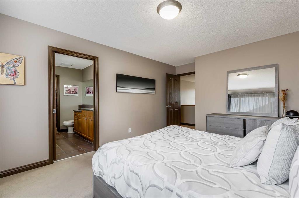 The primary bedroom is perfectly proportioned and offers a relaxing ensuite with a large soaker tub, separate shower, 6’ vanity, and a spacious walk-in closet. Two additional bedrooms are larger than expected and share easy access to the main bath.