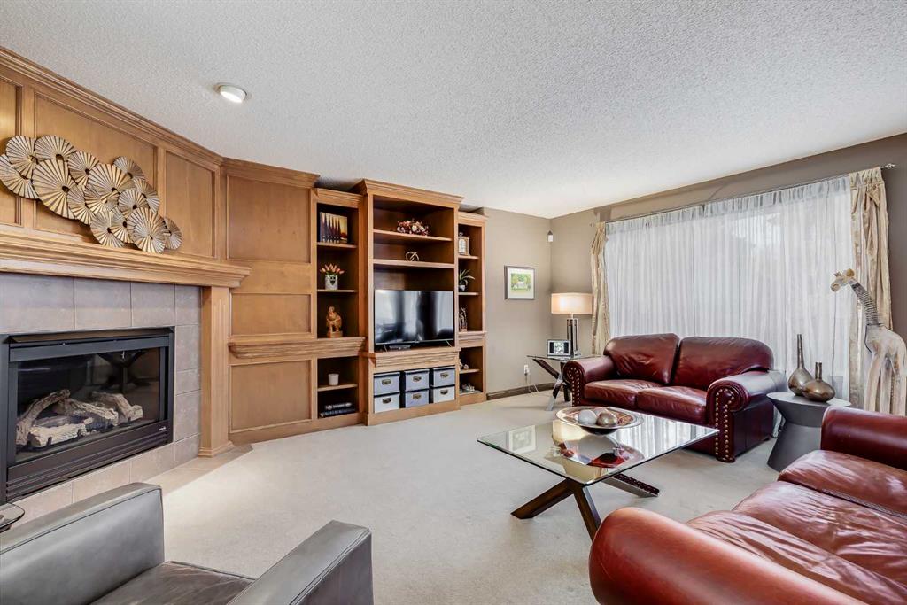 The main floor unfolds into a wide-open layout designed for connection and comfort. Rich walnut-stained maple cabinetry anchors the kitchen, complemented by a central island with raised eating bar, corner pantry, and an abundance of prep and storage space. Whether hosting friends or enjoying quiet family dinners, the space feels warm, functional, and inviting. The adjacent living room features a stunning built-in maple bookcase and entertainment centre surrounding a corner fireplace with ceramic tile surround — a true focal point that adds both character and comfort.