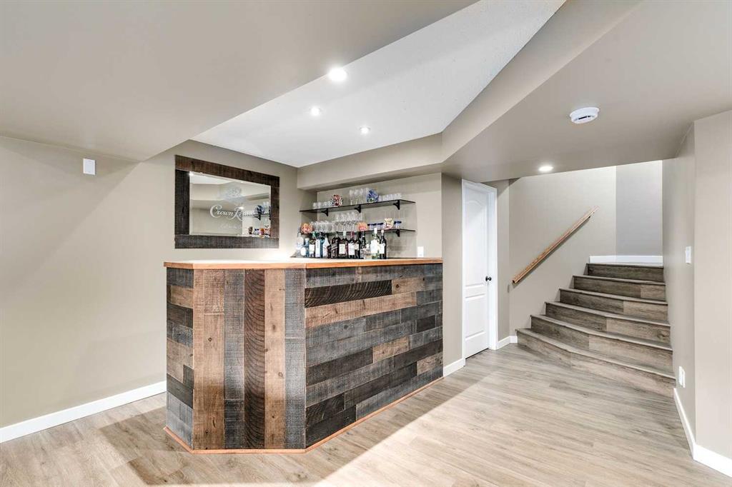 The fully finished basement provides excellent additional living space with a large rec room featuring a rustic wet bar, a fourth bedroom, a three-piece bathroom with in-floor heating, and abundant storage.