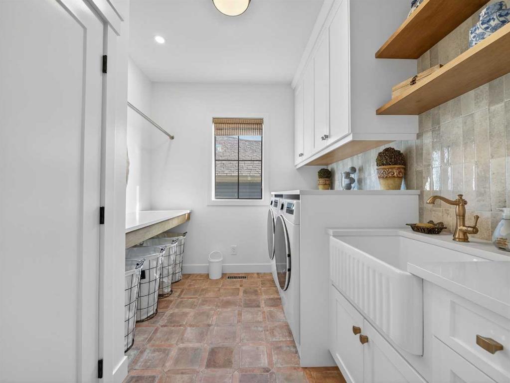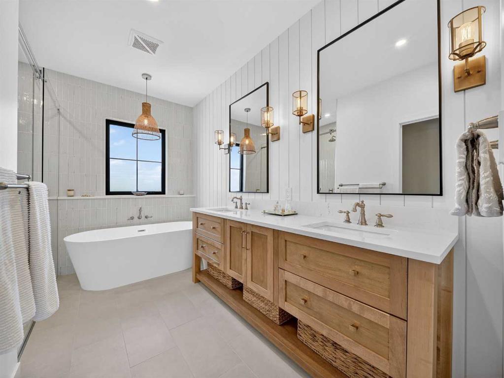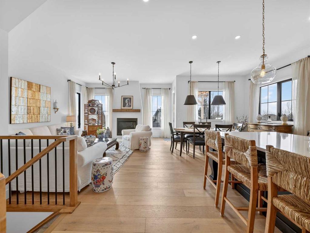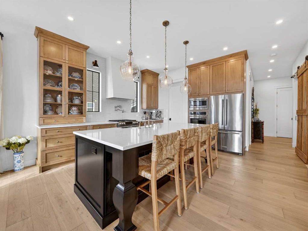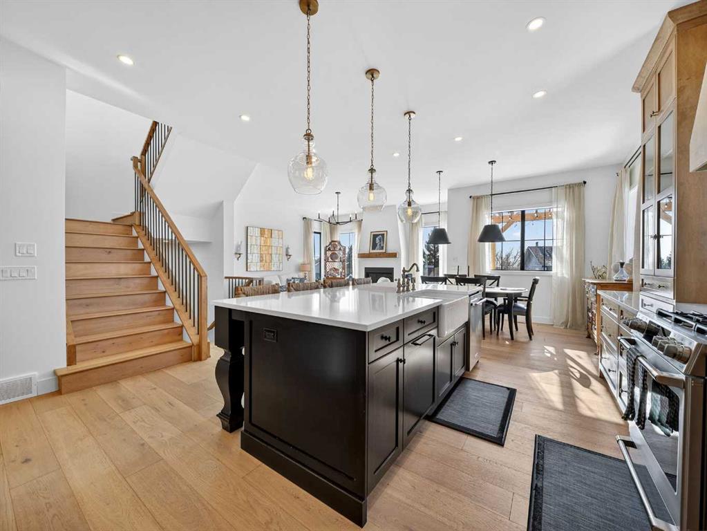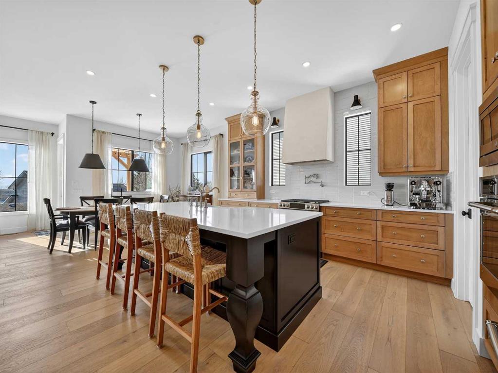 Welcome to an extraordinary custom-built farmhouse in the prestigious community of Wedderburn in Okotoks — a residence where refined craftsmanship meets timeless country elegance. From the moment you arrive, the home’s striking curb appeal, architectural charm, and warm, inviting presence create an unforgettable first impression. A gracious and spacious foyer welcomes you inside, immediately setting the tone for the thoughtful design carried throughout. Just off the entry, a beautifully appointed office offers both functionality and sophistication, complete with bespoke built-in cabinetry and a custom desk. As you continue into the heart of the home, the breathtaking kitchen unfolds in true European Tuscan farmhouse style. Floor-to-ceiling custom maple cabinetry, rich in detail and warmth, is perfectly complemented by white oak flooring that flows seamlessly throughout the main level. A generous central island anchors the space, while a statement custom hood fan, built-in appliances, and exquisite imported tile elevate the design. Expansive windows capture sweeping west-facing mountain views and southern vistas overlooking Okotoks. The adjoining dining and living areas are designed for both intimate evenings and elegant entertaining. A custom gas fireplace provides warmth and ambiance, while an abundance of windows invites natural light and frames the stunning landscape beyond. Completing the main floor is a thoughtfully designed mudroom featuring custom cabinetry and a pristine dog bath. Ascending to the upper level, you are welcomed by a stunning bonus room perfectly positioned to take full advantage of the south-facing views over Okotoks and the majestic Rocky Mountains to the west. Three spacious bedrooms offer comfort and refinement. The primary retreat is a sanctuary unto itself, showcasing a spa-inspired ensuite with dual vanities, a freestanding soaking tub, and an oversized custom walk-in shower. Two additional bedrooms share a beautifully appointed bathroom. The laundry room is exceptional — custom cabinetry and farmhouse sink create a space as beautiful as it is functional. The fully developed lower level elevates this home even further. In addition to a completely separate legal basement suite with its own private entrance, quartz countertops, stainless steel appliances, and stacking washer and dryer — the lower level also features an additional bedroom or multifunction room with a full private ensuite. Bright, airy, and finished to the same uncompromising standards as the upper levels, nothing has been overlooked. Outdoors, the property truly shines. Situated on one of the largest lots in Wedderburn, the expansive south-facing backyard offers endless opportunity for relaxation and recreation. A two-tiered deck with pergola creates the perfect setting for summer evenings, entertaining, and enjoying the open skies. Every detail of this residence has been meticulously curated, the epitome of luxury farmhouse living.