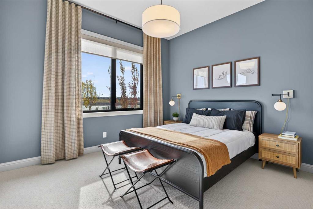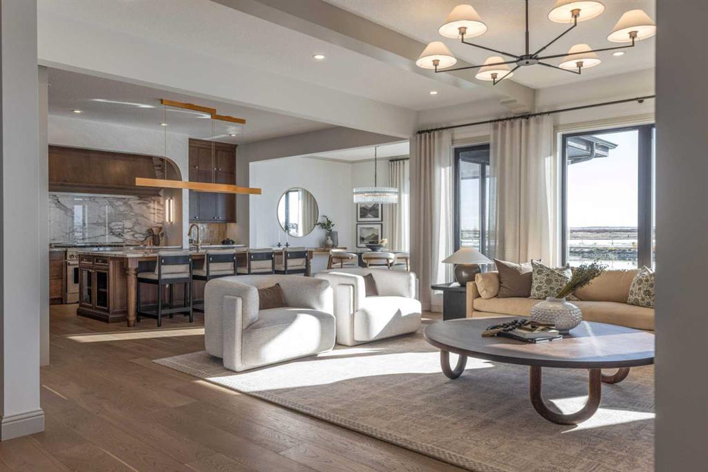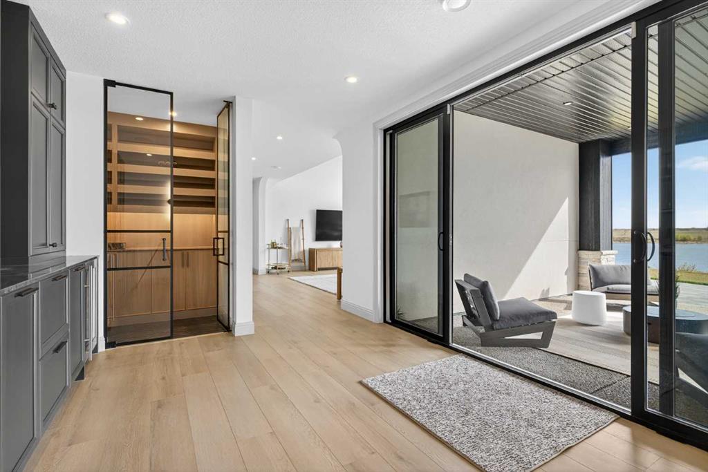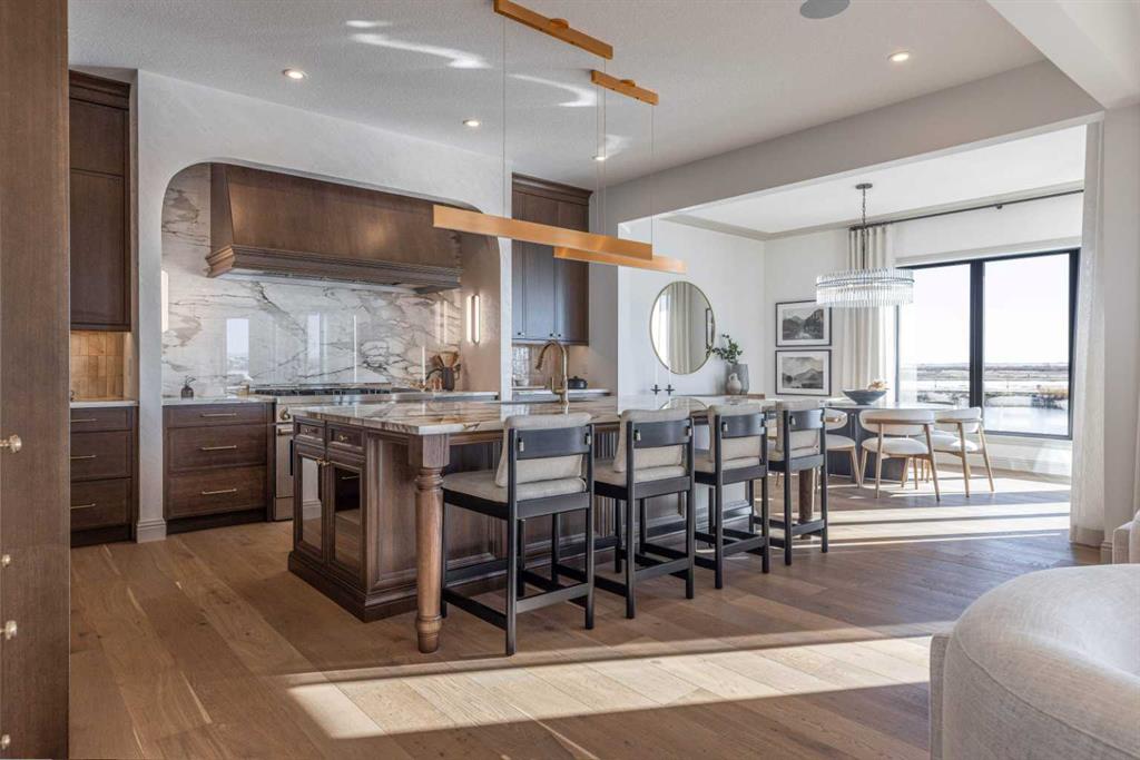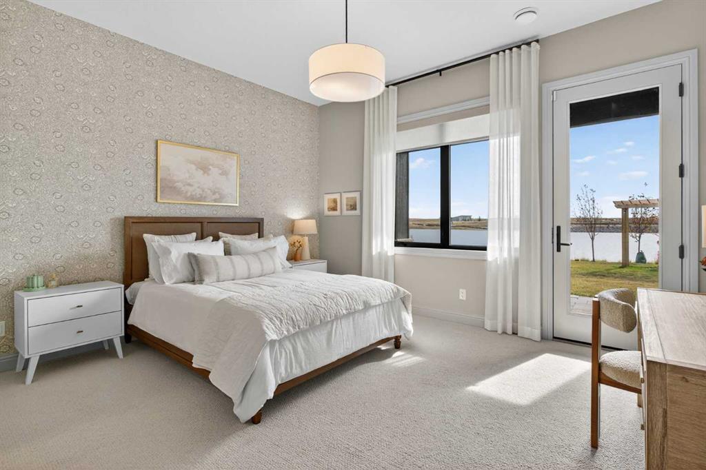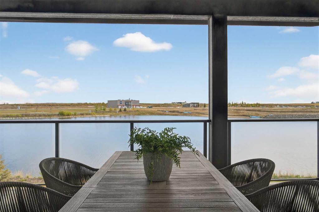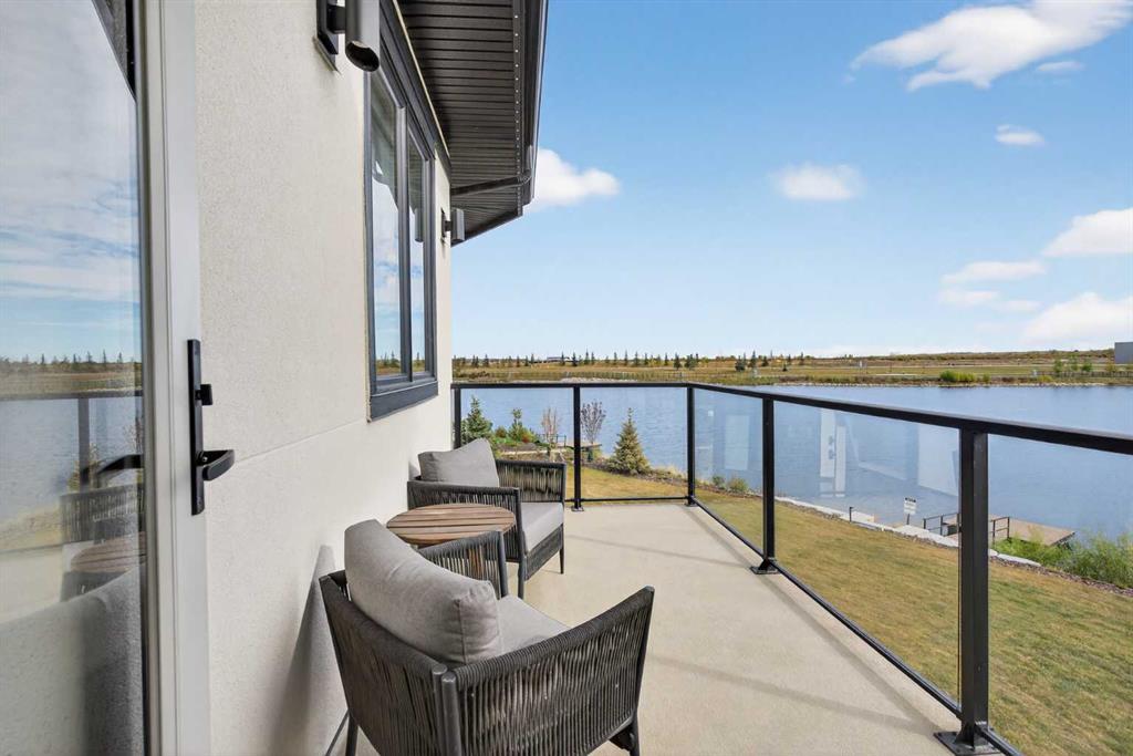 Exceptional opportunity to step into Harmony’s exclusive Lakeside lifestyle, in a uniquely crafted, walk-out Bungalow plus Bonus Loft – approximately 5000 sq.ft. of thoughtfully developed space. This spectacular home is ready for you now, at a price that cannot be matched by new builds on comparable lake front lots. Fully landscaped, the 0.34 Acre South-exposed plot includes a personal use dock. The iGuide Tour and Floor Plan Link, offers an enhanced experience, inside and out. This architectural masterpiece is structured across the width of the land by McDowell (built by Baywest Homes) to capture all surrounding water views, starting with full-height glass at the central foyer and lower courtyard, then additionally, from every principal room on all 3 levels. Both dominant floors are cleverly separated into sleeping suites and full bathrooms on one side, and common use areas on the other. Every space is tied together by stylish finishings that blend timeless elegance and a contemporary flair. Enjoy this retreat year-round, with 2 upper balcony decks (1 covered), and 4 direct exits to grade-level patio terraces (2 covered), plus beautiful pergola seating location by the water. The open Living and Dining spaces are set off by a striking Gourmet-quality eat-in Kitchen, with a massive Porcelain Island (seats 4 comfortably), a walk-through Butler’s Pantry (has a drawer Microwave and Beverage Cooler), a 6 burner Gas top Double-Range, Built-in Hood, paneled Fridge, Freezer and Dishwasher. The Primary Suite is a private space, with its own balcony, a vestibule Study/Dressing area, Walk-in Closet and 6 piece Ensuite completed by accessible flush-tiled shower. The upper Bonus Loft has its own 2-piece Bath and customized side-bar with another convenient chiller. The developed 1990 sq.ft. of the lower level has equally stunning water views, from a Rec/Theatre, Gym, Wet Bar/Wine Room gathering space, and two Bedrooms. Additional luxuries include a Sauna in the third full Bathroom, a 4-stop Elevator, elegant Powder Room, Locker-and-Bench Mud Room, wrapped cabinet Laundry with sink, and Triple Garage capacity, split for greater convenience, with a heated double bay. Numerous features are outlined in available brochures. Look for hidden gems, like second laundry hook ups, full sound and security, plus high end finishes with supplier names. The home is under Alberta New Home and Builder Warranties, to be transferred to new owners as applicable, not warranted by current owners.