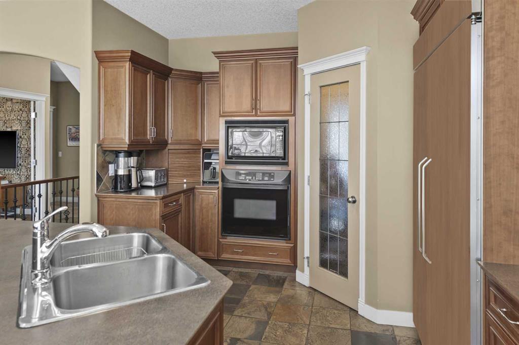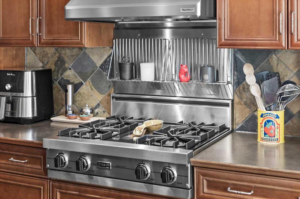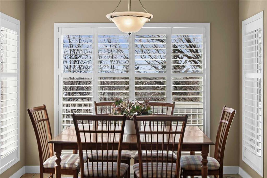The back of the home is where things open up beautifully. An almost entirely windowed rear wall floods the family room, dining nook, and kitchen with natural light, while garden doors lead to the upper deck – where winter reveals mountain and Canada Olympic Park views, and summer delivers those same COP views framed by the privacy of mature trees. Plantation shutters add a charming, tailored touch throughout. The kitchen centres around cherry cabinetry, a tiered island, and serious cooking credentials: a Viking gas range, newer oversized KitchenAid refrigerator (custom cabinet panels, on order, will match the cabinetry colour), KitchenAid oven, and newer microwave. A pantry with pass-through access to the dining room keeps everything connected and functional.