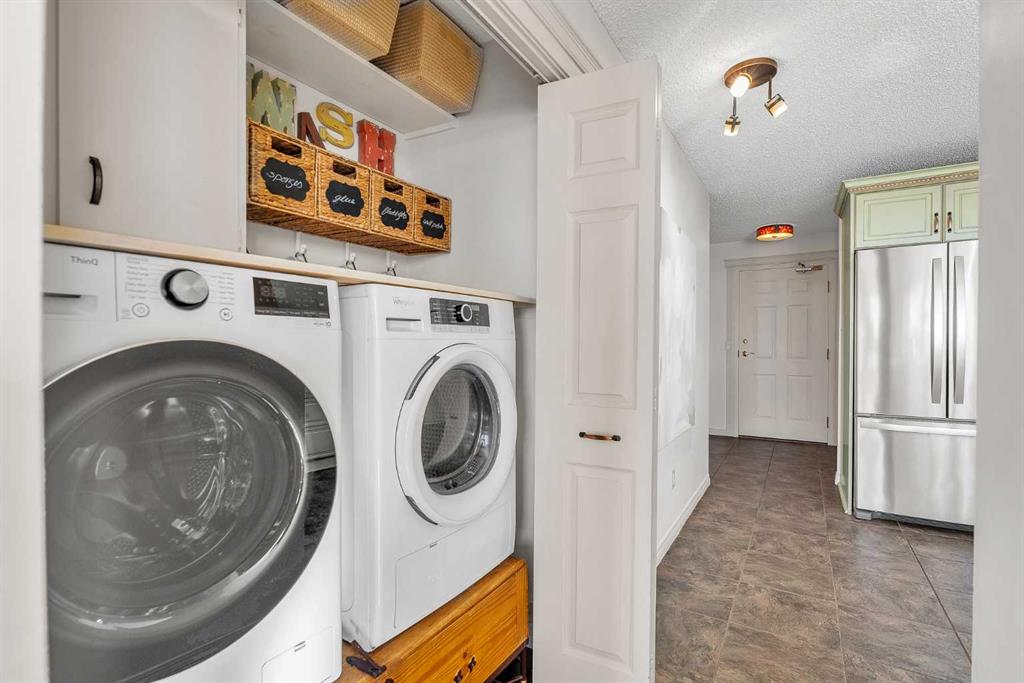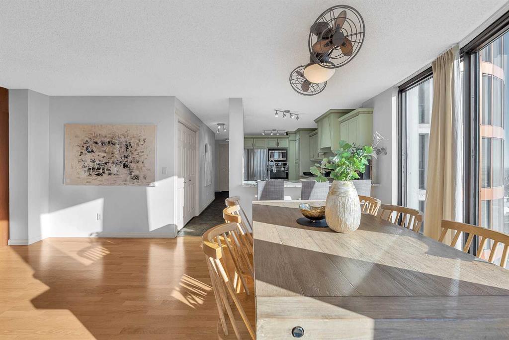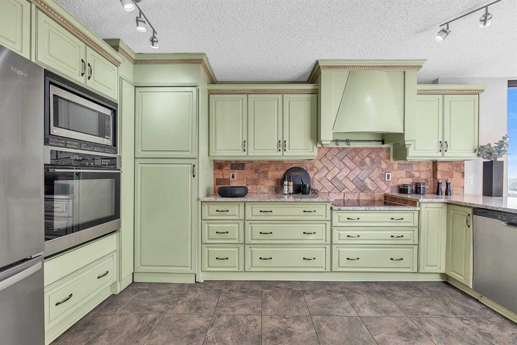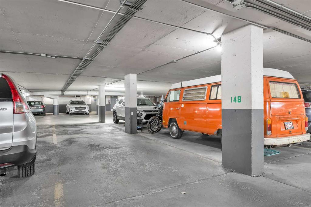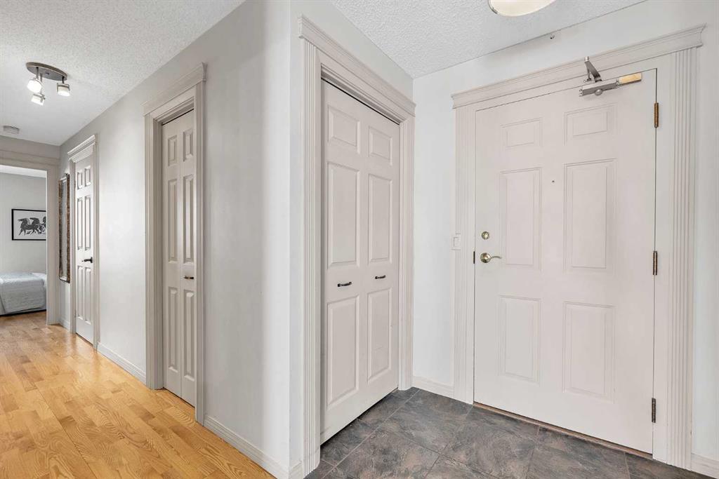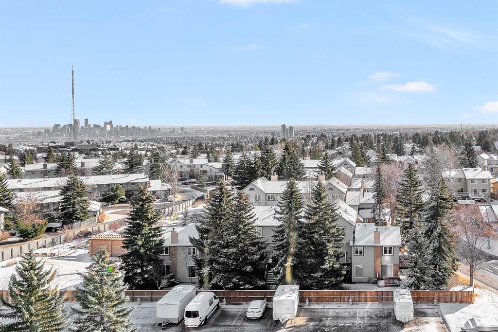 On the interior you will find a spacious french country inspired kitchen equipped with stainless steel appliances, granite countertops, a large corner pantry, and breakfast bar. Enjoy sitting at your dining table and watching the sun rise up behind the downtown skyline- the dining room leads out to the covered balcony where you can relax on a summmer evening and watch the sun set behind the Rocky Mountains. The adjacent nook area provides a great area for a buffet or a desk. Leading to the show- stopping living room with panoramic city and mountain views. . You’ll find both bedrooms to the front of the property and away from the living space, for comfort and privacy. The primary bedroom features a walk-in closet and and large ensuite bathroom with double vanity, and oversized shower. The second bedroom and full bathroom are perfect for guests. Additional conveniences include in-suite laundry with cabinetry and counter space, a large in-unit storage room, a linen closet, and an entry closet.