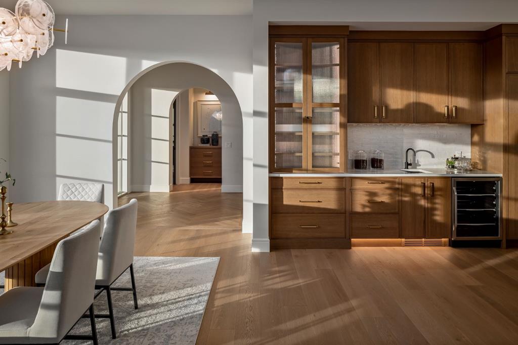 OPEN HOUSES Sat Feb 7th 12-3PM & Sun Feb 8th 1-4PM! Homes on this exclusive ridge rarely come to market, and this breathtaking two-storey estate is a shining example of elevated inner-city living. With 5,545.89 sq.ft. of exquisitely developed space, this 6 bedroom, 5.5 bath residence blends refined craftsmanship with functional luxury; set against a backdrop of sweeping valley and park views. Step inside to soaring ceilings, pristine engineered hardwood floors, and custom archway details that frame each thoughtfully designed space. The heart of the home begins in the sunlit dining area, perfect for hosting epic dinner parties, and highlighted by west-facing triple-glazed LUX windows. The adjacent chef’s kitchen impresses with stainless steel integrated appliances, including a Wolf gas cooktop, double wall ovens, classic white shaker cabinetry, and a hidden butler’s pantry for discreet prep and storage. The expansive great room invites relaxation with vaulted ceilings and a cozy microcement faced gas fireplace, opening directly to a sunny south-facing deck overlooking endless green space. A main floor guest suite (or executive office) with a private ensuite, a designer powder room, and a spacious mudroom with built-ins complete this level. The fully insulated triple car garage is EV-ready and lift-kit friendly, marrying form and function. Upstairs, a serene primary retreat features elegant vaulted ceilings, a custom walk-in closet, and a spa-inspired 5-piece ensuite with a soaker tub, dual vanities, and a glass shower with bench and niche. Three additional bedrooms (one with an ensuite), an upper laundry room with sink and storage, and a charming library nook provide comfort and convenience for the entire family. The fully developed basement is an entertainer’s dream: featuring a large media lounge, games area, wet bar with brick backsplash and undermount lighting, and a high calibre wine room that secretly accesses the highly systemized maintenance room. A versatile home gym, sixth bedroom with walk-in closet, and additional full bathroom on this level ensure guests feel at home. Noteworthy highlights include: Hydronic in-floor heat in the basement; 2 High-Efficiency furnaces & A/C units; built-in speakers throughout; and quartz countertops in all bathrooms. Located minutes from the University of Calgary, Foothills Hospital, and local shops and restaurants, this timeless home sits in a top-tier school catchment and offers quick access to major routes while maintaining a tranquil, park-like setting. A truly unique opportunity to own a well-appointed, move-in ready home in one of the city’s most prestigious enclaves.