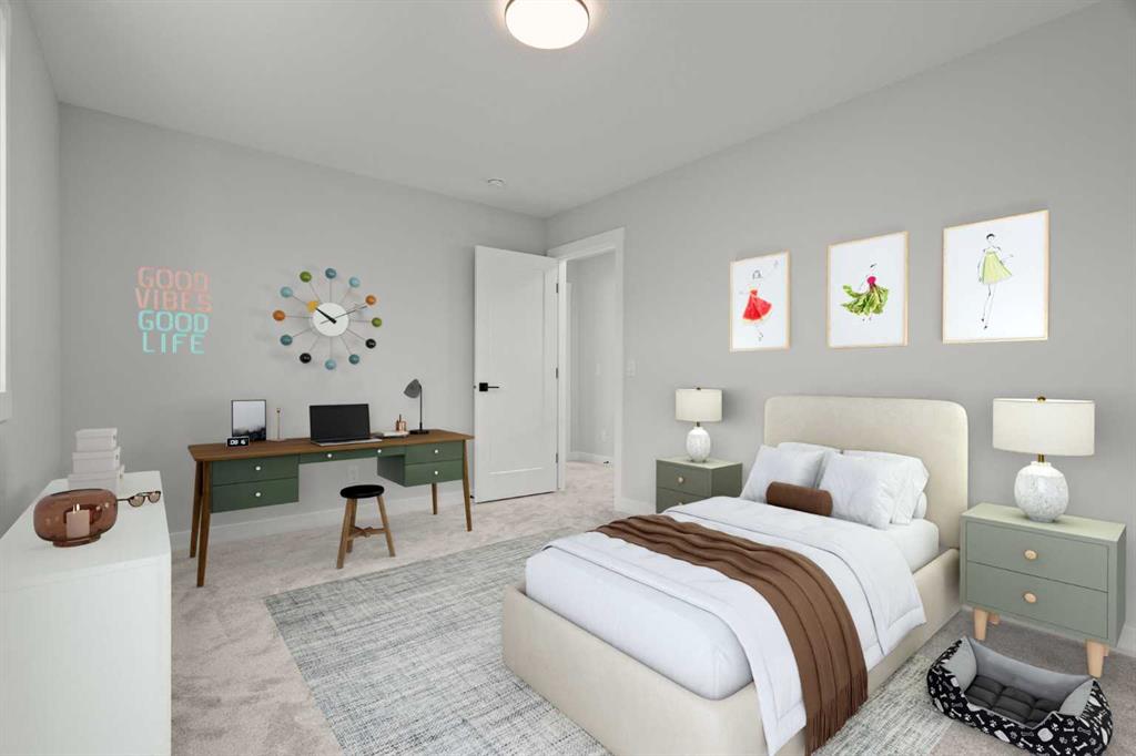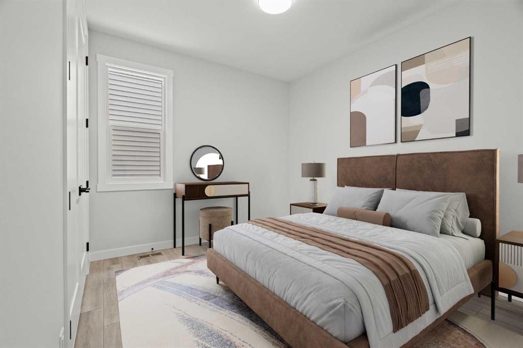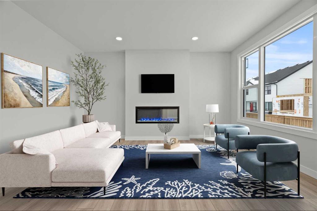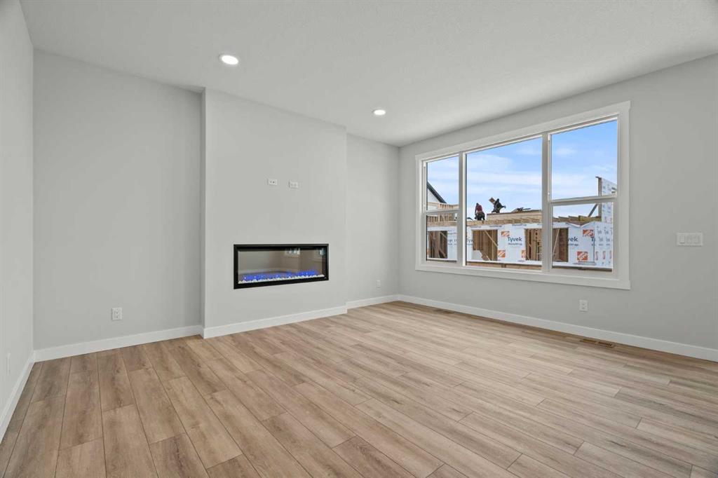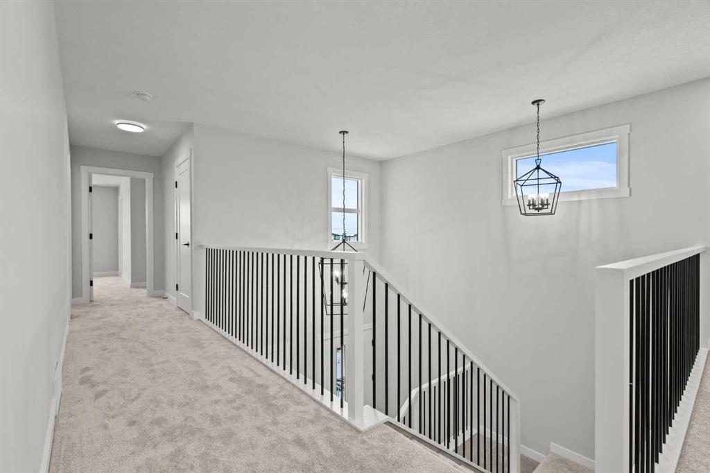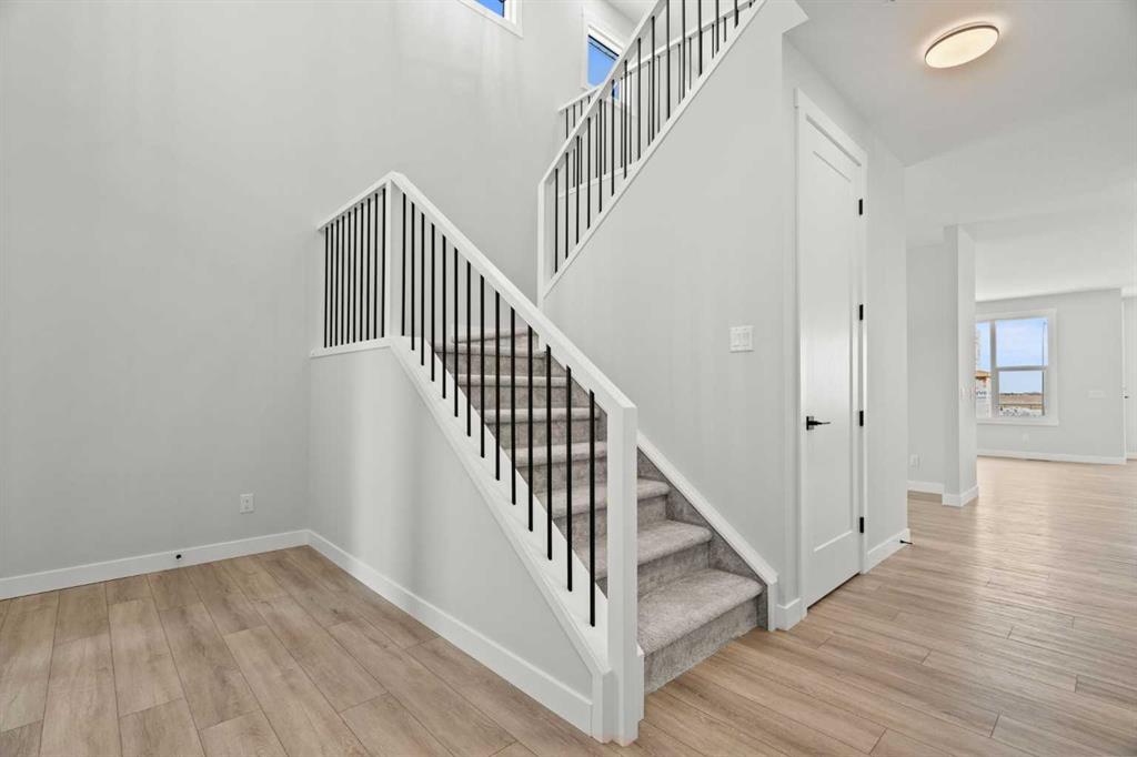 As with all Golden Homes builds, this home comes fully loaded with premium standards, including landscaping with full lot grading and loaming, sod to the side entry, and a front-yard tree; true 9′ ceilings on both the main floor and basement; tall 8′ doors on the main floor; a side entrance; a mosaic tile shower base; oversized triple-pane windows; matte black iron spindle railings and hardware; upgraded MDF shelving; upgraded carpet underlay; tankless hot water heater; smart home features and appliances; oversized quartz kitchen island; gas line to the deck; full-height painted kitchen cabinets; a complete HRV system; an electric fireplace; full-height wall tile in the ensuite shower; metal soft-close drawers; solar panel rough-in; tile flooring in all full bathrooms and laundry room; and gas line to deck.
