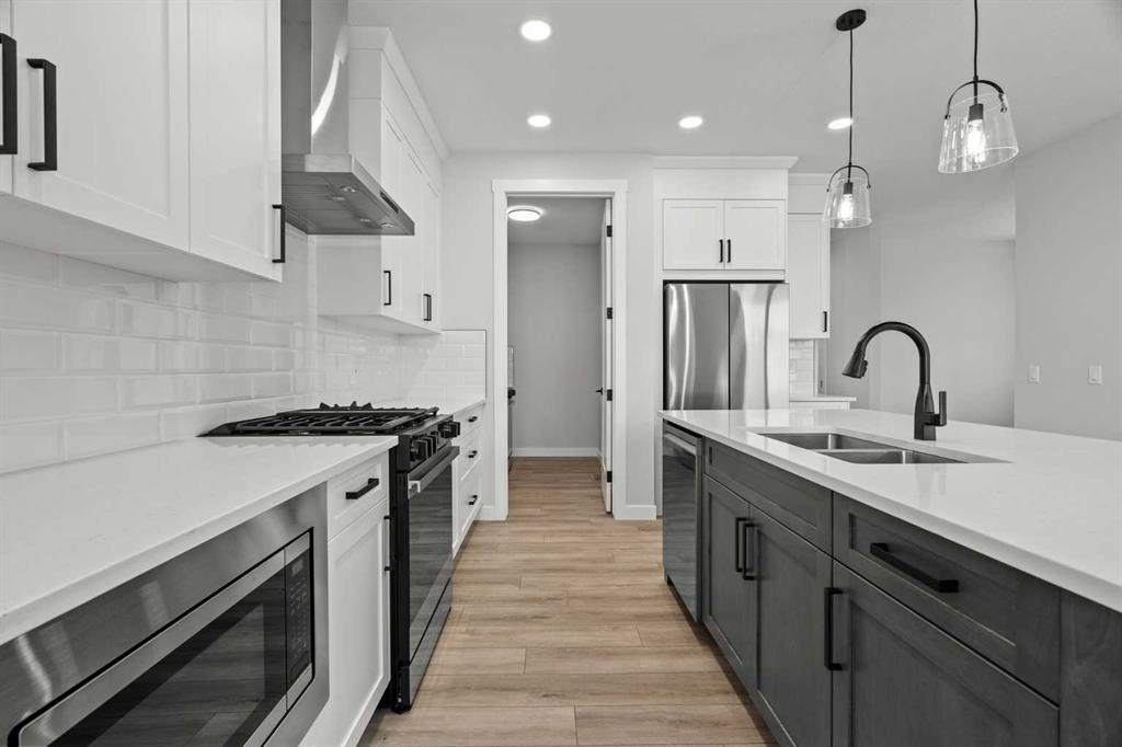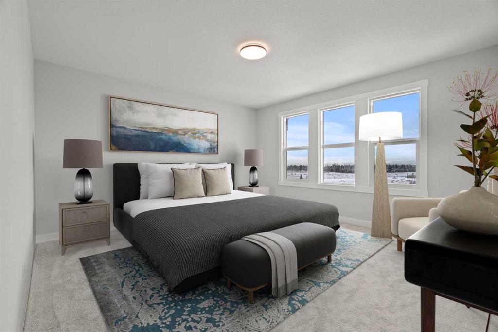 In the fully finished basement, you will find two additional bedrooms, a 3-piece bathroom with a standing shower, a large rec room, and a wet bar with plenty of cabinets, a sink, and a fridge. Walk out of your basement to a concrete patio, with an already built deck above, to enjoy the yard and mountain views. This home backs onto a pond with lots of green space and a wide range of walking and bike paths.