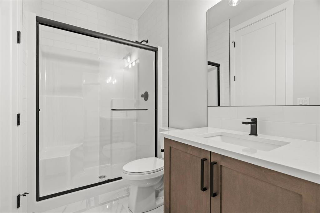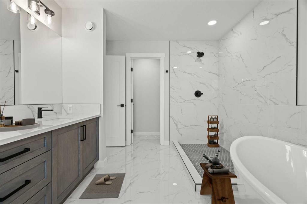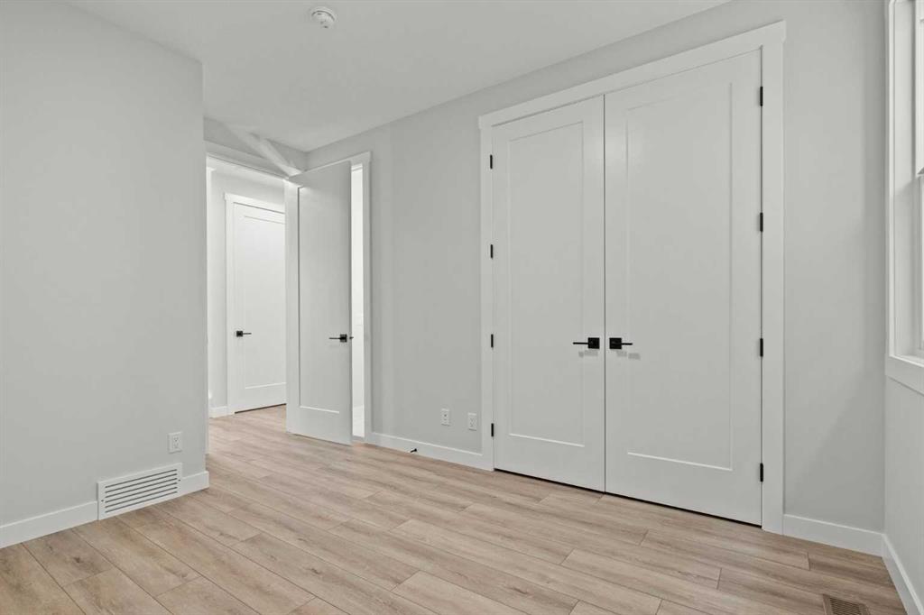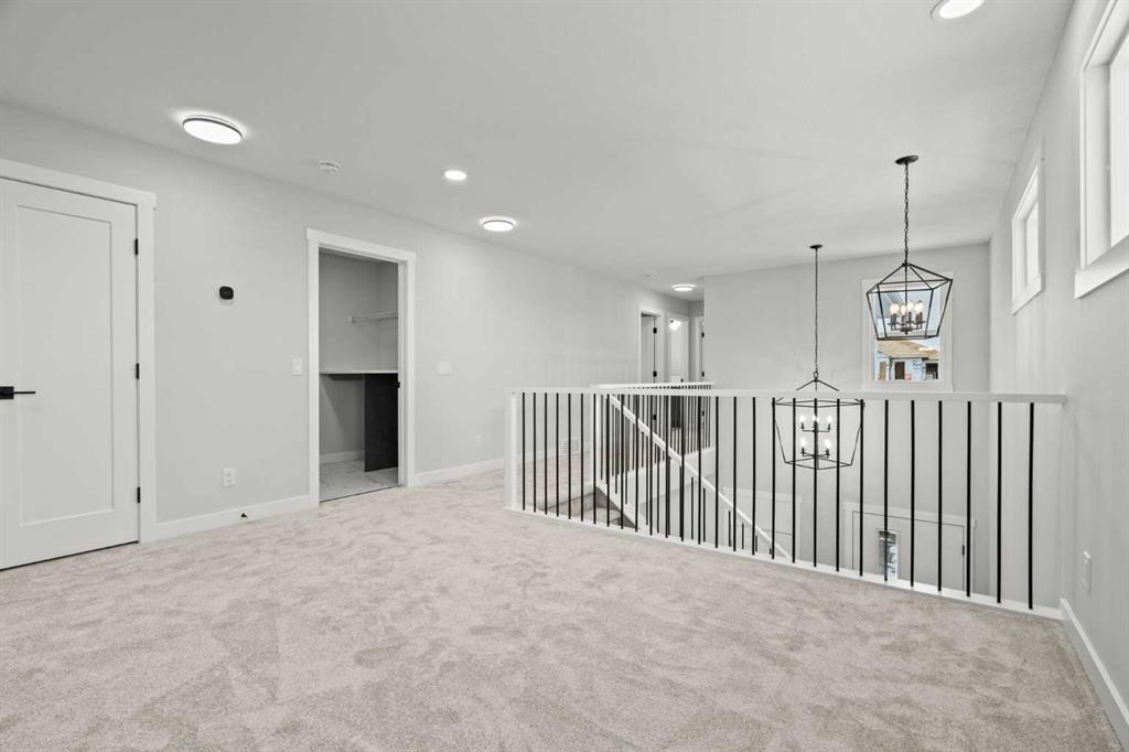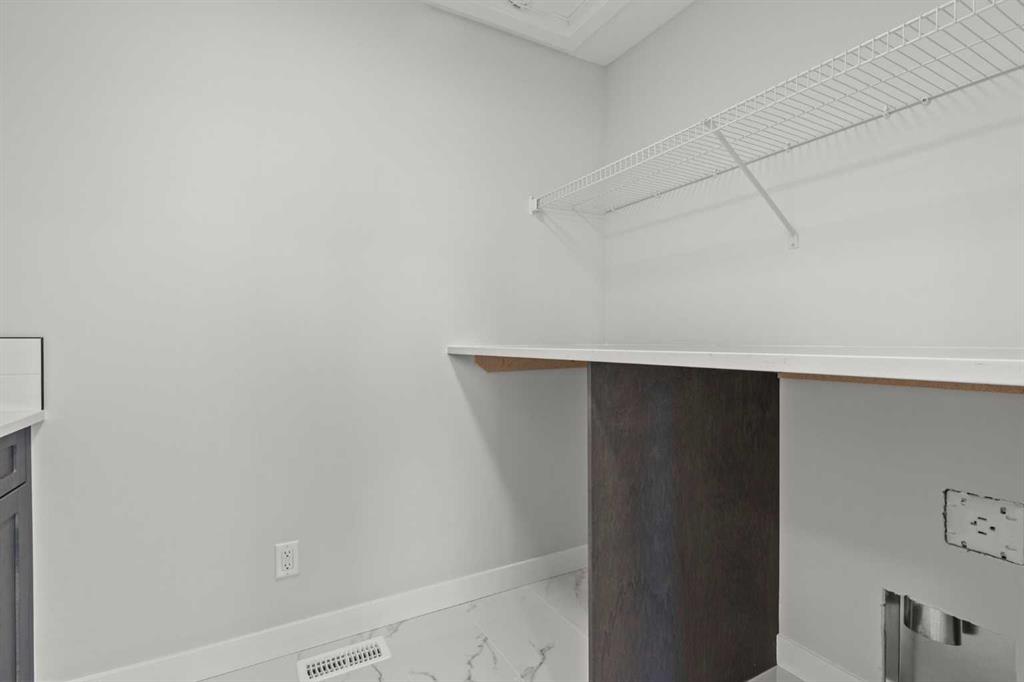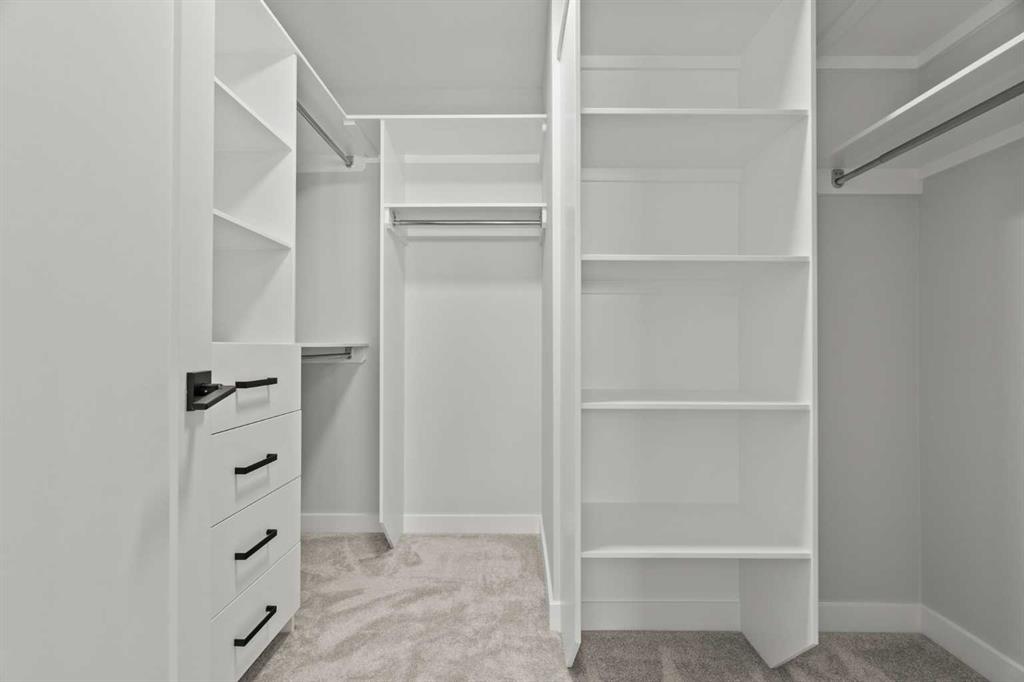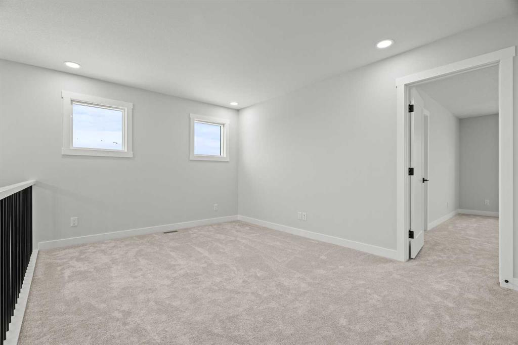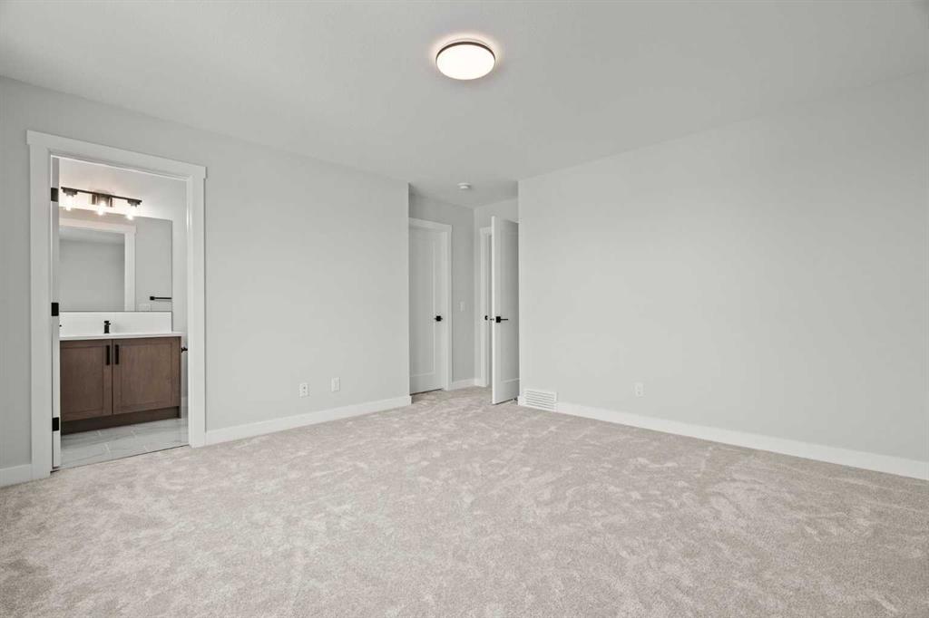 Upstairs, you’ll find two primary bedrooms, each with its own ensuite and walk-in closet. The main primary suite offers a large 5-piece ensuite with an enclosed toilet, full wall tile, and a spacious walk-in closet with upgraded MDF shelving. The second primary bedroom includes a 3-piece ensuite with a standing shower and its own walk-in closet. A third generously sized bedroom also features a walk-in closet and easy access to a nearby 4-piece bathroom. The upper floor is completed with a large bonus room and a full laundry room, finished with quartz countertops, a sink, and tiled flooring.