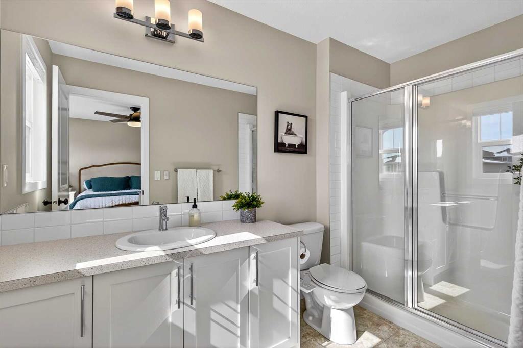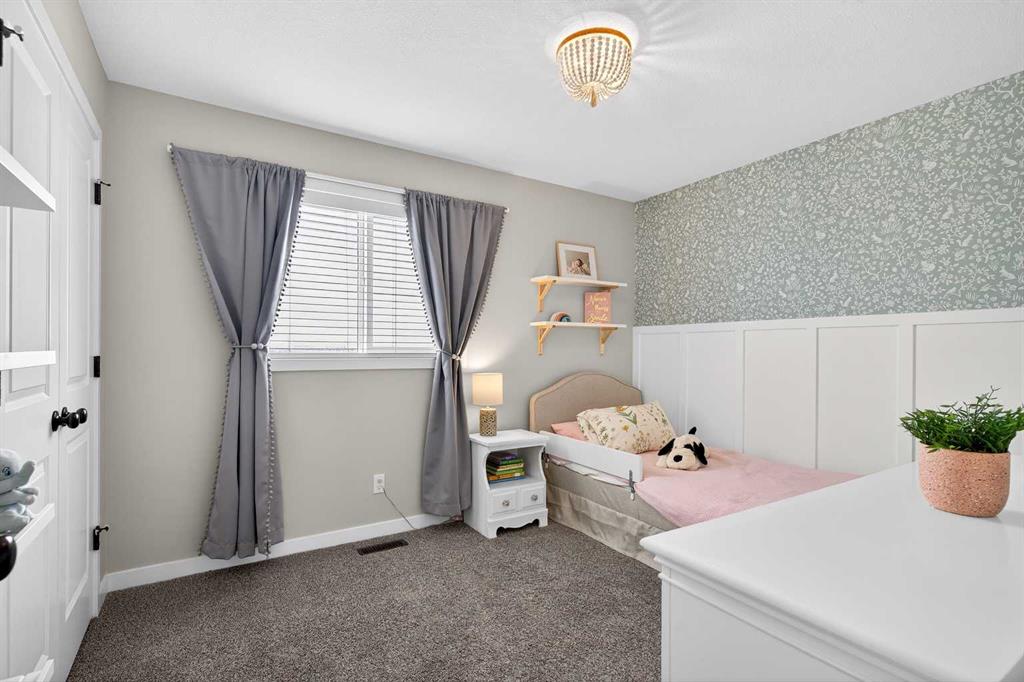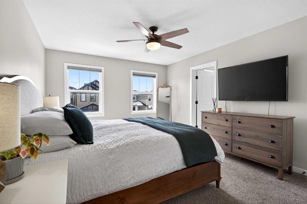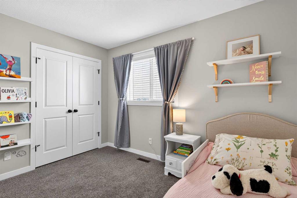 Upstairs, the bonus room sits right in the centre of the home, creating excellent separation between the primary suite and the kids’ bedrooms. The primary bedroom easily fits a king bed, features sunny windows, and a ceiling fan to keep the air moving. The ensuite includes an extra-long vanity, tidy shower, and bright window, while the walk-in closet is absolutely HUGE—you truly have to see it to appreciate it.
