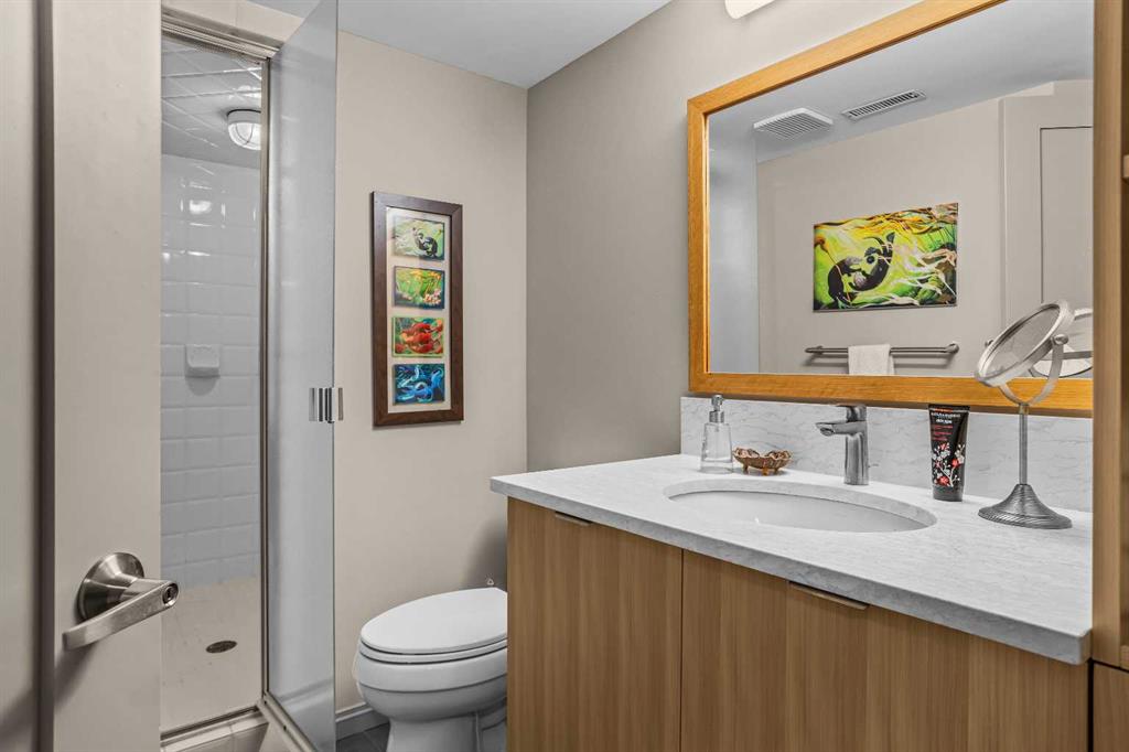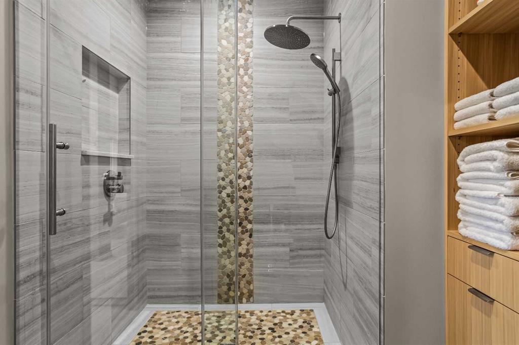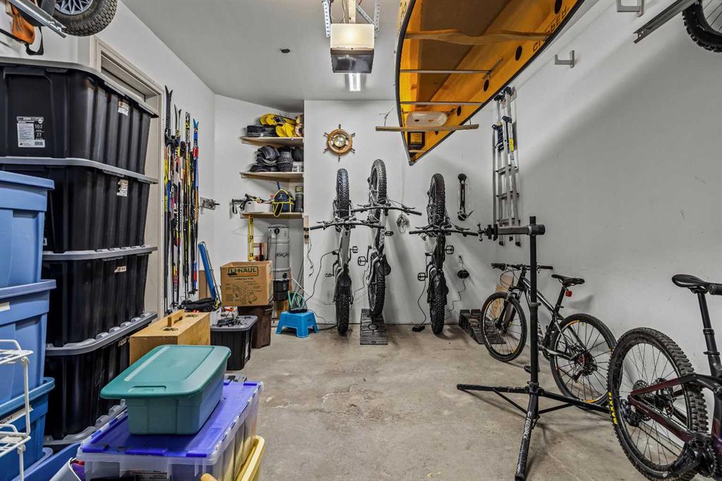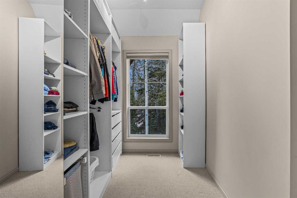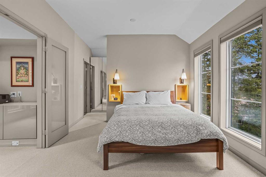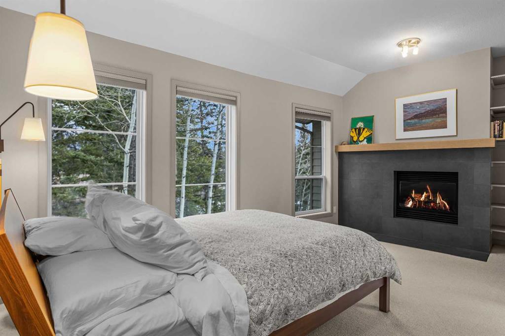 The primary suite is warm and inviting with its own gas fireplace, a walk in closet with built in organizers, and a spacious ensuite featuring a large tiled shower. The lower level offers two additional bedrooms and a large steam shower, creating a spa-like retreat after a day on the trails.