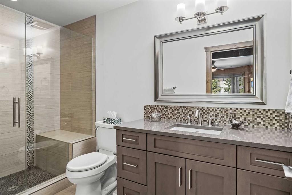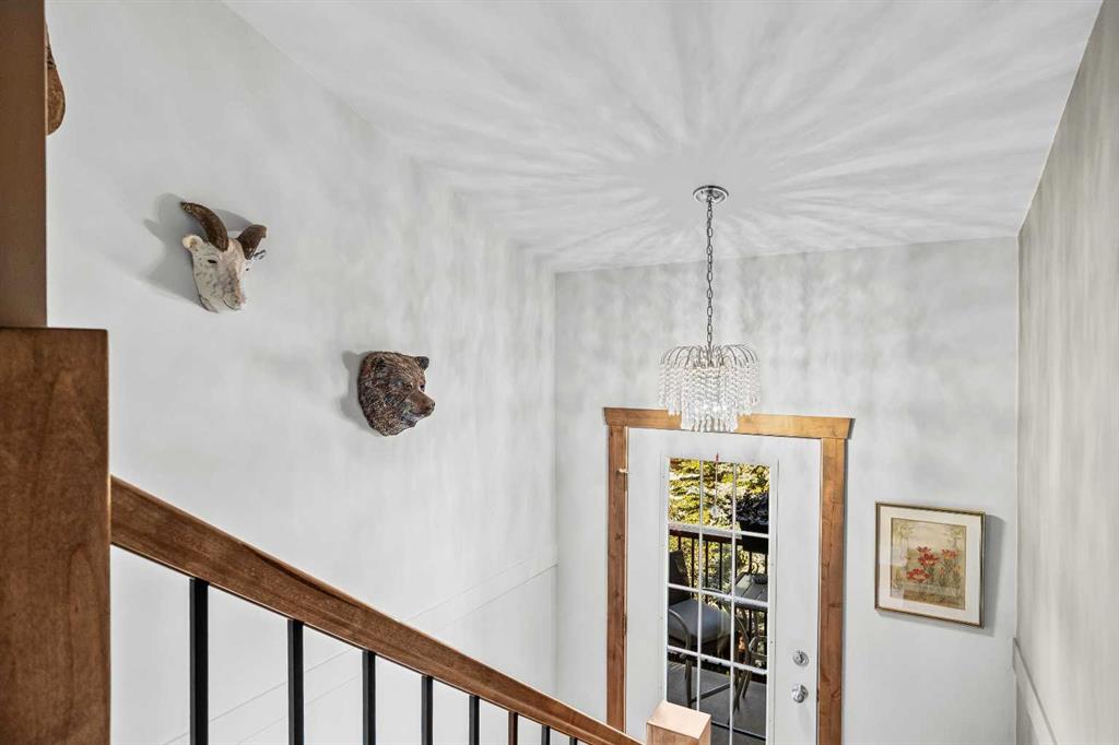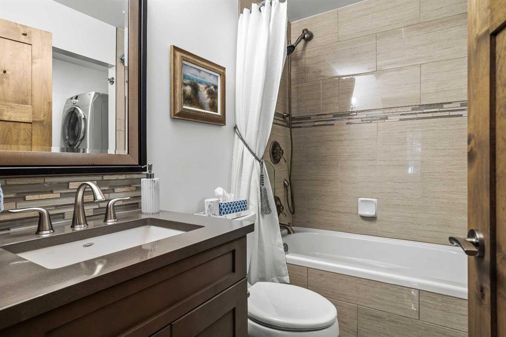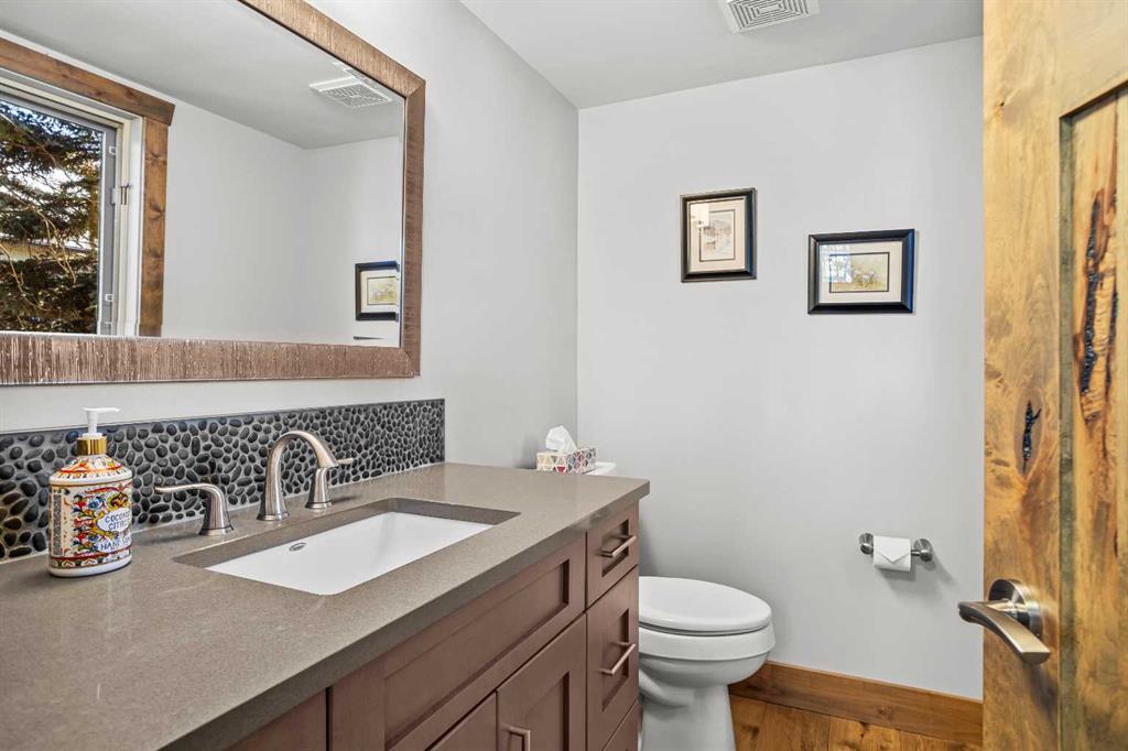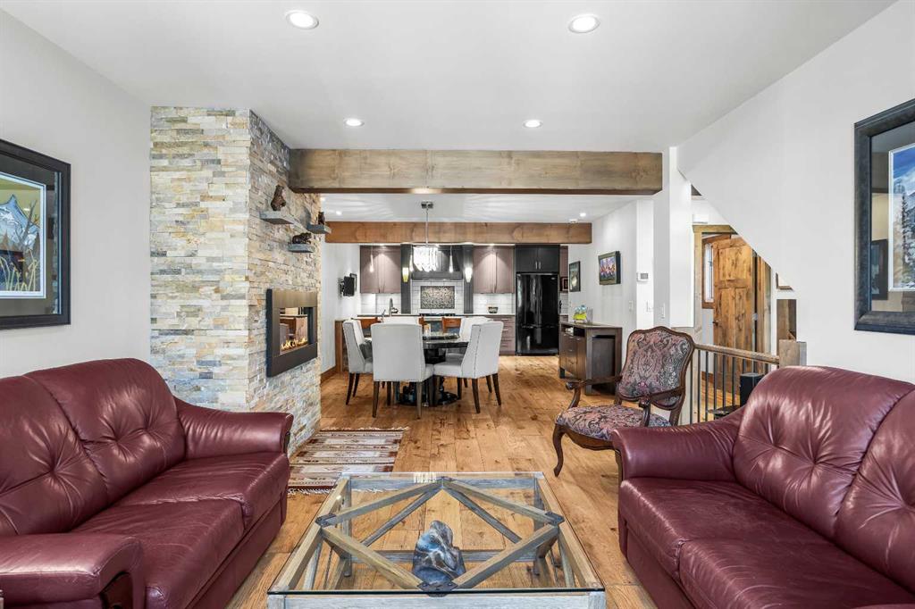 Located in desirable South Canmore. This 3 bedroom, 4 bathroom 1767 sq ft townhouse is well maintained. Welcome to a completely renovated home with meticulous woodwork, from the hickory floors on the main level to the custom knotty Adler doors and trim throughout. Open stairs to maximize the light and spaciousness. Each of the 2 bedrooms on the top floor have full bathrooms with laundry. The lower level is a media room or bedroom with full bathroom and in-floor heating, with a wet bar and a granite counter. The kitchen is professionally designed including 2 sinks, quartz countertops on the island and cabinet areas. The living room has a gas fireplace and open concept through to the dining room and kitchen. Outside there is a ground level sitting area or a cozy balcony facing west off the 2nd floor. Secured outside storage for bicycles and seasonal equipment. There is a single car garage plus a driveway to accommodate 2 cars.