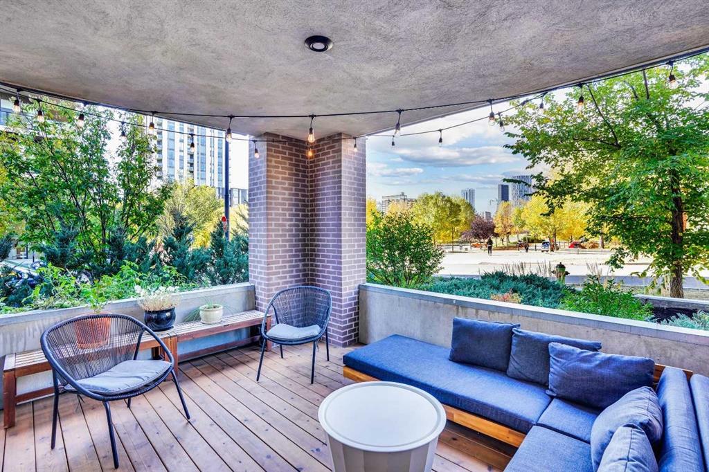 Exceptional opportunity in an ultimate inner-city location. Nestled park side in the heart of Bridgeland, across from Murdoch Park. Like new, corner unit with direct access features a great contemporary vibe. Open concept, spacious rooms and a great covered patio with lovely views of the Park and Downtown. Living is easy in this fresh and bright 2 bedroom plus den with 2 full baths. Enjoy hardwood floors, big beautiful windows, a sunny living room, large dining room and an airy kitchen with plenty of natural light. Upscale kitchen featuring quartz countertops, upgraded appliances, gas stove, pantry and a breakfast bar that comfortably seats four. Enjoy one of the largest patios in the building for your outdoor living space. A soothing color palette throughout creates a sense of balance and harmony. Radius is a concrete building with LEED platinum status offering superb soundproofing and sustainable operating costs. Amenities included in your condo fee are a concierge, a main gym, weight room, package delivery room, yoga studio, spin room, bike and ski workshop, dog wash, car wash bay, incredible roof top terrace with a BBQ area, an outdoor fireplace plus private garden plots. Other notable conveniences include underground parking with two parking stalls and an extra-large storage locker. You will love the vibrant, walkable location, with easy access to plenty of pathways, trails, 10 minute walk to downtown, the Bow River and St Patrick’s Island. Inner city at its best; quiet location, bubbling local restaurant/cafe scene, Farmer’s Market, and shopping. With such a high walking, wheeling, bicycling and transit score it would be a shame to live anywhere else.