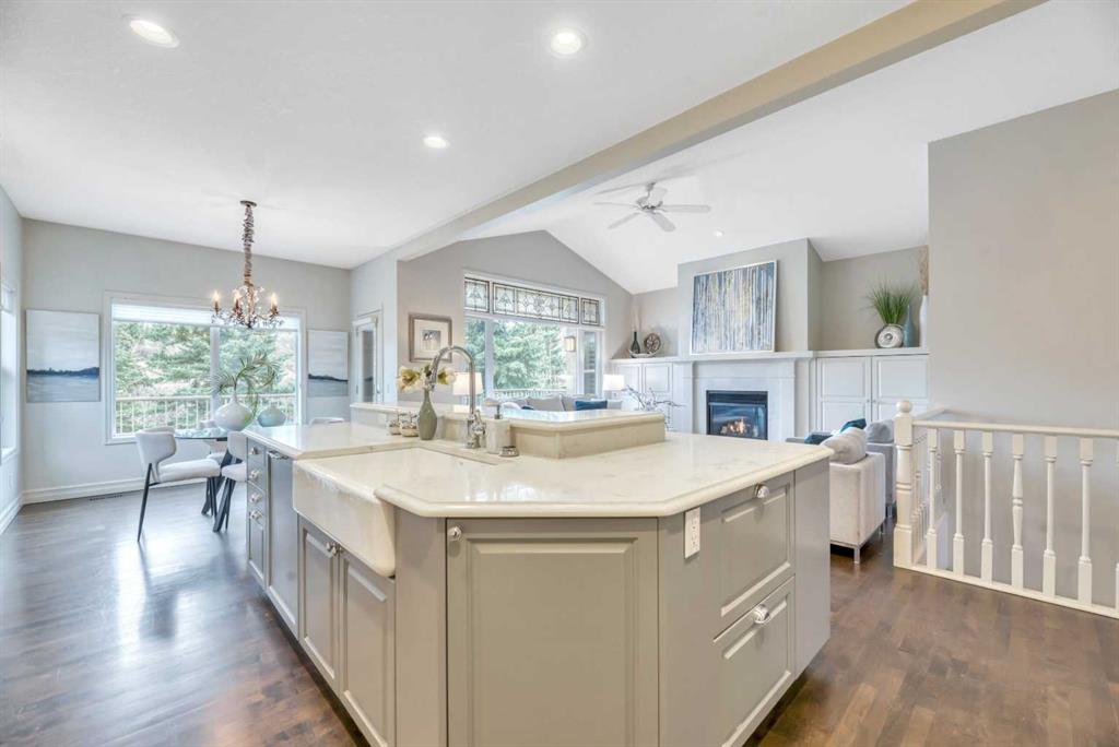 The bright, open-concept main floor is filled with natural light from expansive windows and showcases vaulted ceilings,
