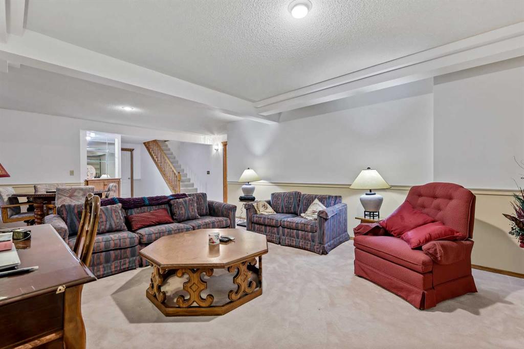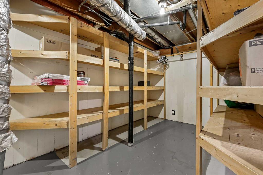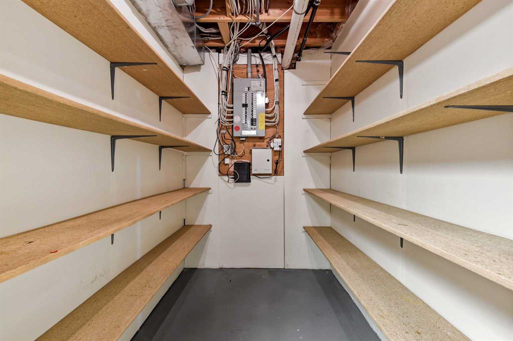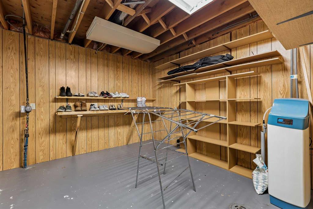 The fully developed basement includes a generous recreation room, guest suite with 4-piece bath, kitchenette, and a large storage room with wood paneling and built-in shelving. A mirrored corner wall with cabinet-style detailing adds unique character to the space.