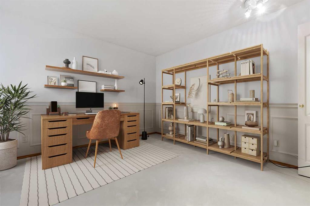 The primary suite is a relaxing retreat with a large skylight, a 5-piece ensuite including a jetted tub, walk-in tiled shower, dual sinks, and a spacious walk-in closet with built-in organizers. A bright den/home office at the front of the home is accented with detailed wall moulding and abundant natural light—ready to fit your work-from-home lifestyle or hobby space.