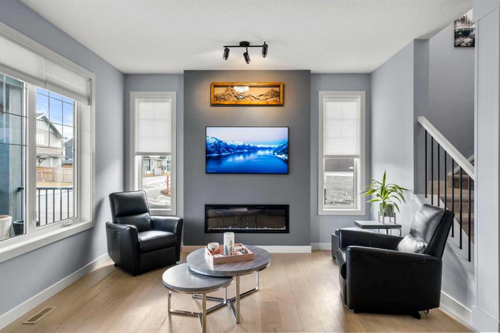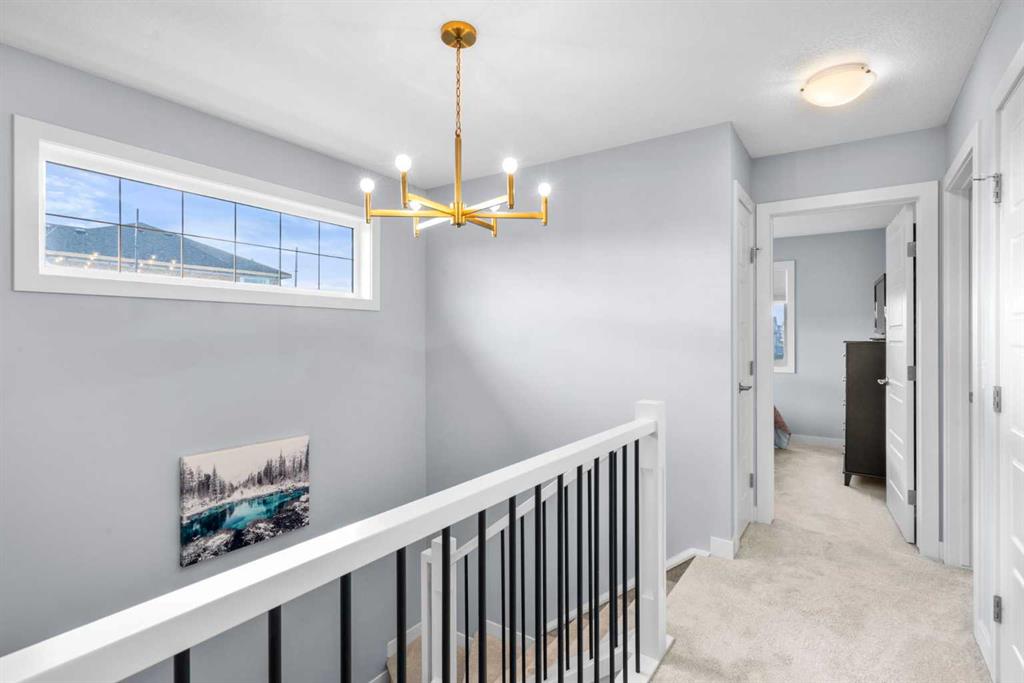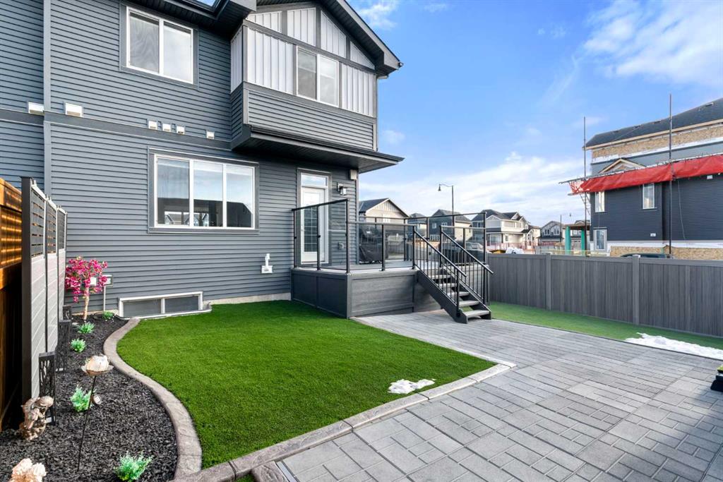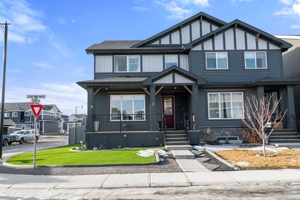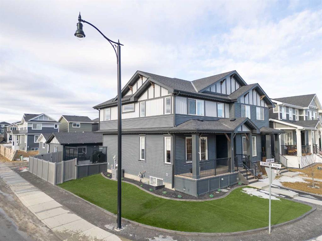 ** OPEN HOUSE SATURDAY, 17 JANUARY FROM 12-3PM** Welcome to this beautiful corner-lot duplex located in the family friendly community of Sunset Ridge. From the moment you arrive, you’re welcomed by a large covered front deck, the perfect spot to enjoy your morning coffee while soaking up the sunrise. Inside, the main level boasts 9 foot ceilings and showcases stylish engineered hardwood flooring while being filled with natural light from expansive windows. The inviting living room offers a cozy space to gather with family for movie nights, elegantly complemented by a modern electric fireplace to set the mood. The open-concept kitchen is both functional and stylish, featuring upgraded stainless steel appliances including a microwave hood fan, two-tone shaker-style cabinetry, quartz countertops, a large island with room for five seats, and a seamless flow ideal for entertaining. Upstairs, the spacious primary bedroom offers stunning mountain views and a well-appointed 4-piece ensuite with double vanities and quartz countertops which leads you to your walk in closet. Two additional bedrooms, a full bathroom, and convenient upper-level laundry complete the second floor. The basement comes with 9 foot ceilings and a bathroom rough in making it ready for the creative minds of its next owners. The attention to detail continues outdoors where the current owners spared no expense! The lot is fully landscaped with a zero-maintenance yard that truly stands out amongst the competition. The entire lot is finished with artificial turf, rubber mulch, custom cement curbing, and rubber patio stones leading to the double detached garage. The back yard is completed with an oversized, permitted vinyl deck that is perfect for entertaining, while its glass panel railing ensures uninterrupted views of the always-green backyard and the kids playing amongst it. Encircling the backyard is vinyl fencing, reinforcing the home’s thoughtfully designed, low-maintenance lifestyle. Additional features include Gemstone lighting, additional parking next to the garage, and air conditioning for year-round comfort. This exceptional home combines thoughtful interior design with extensive exterior upgrades. Don’t miss your opportunity to experience this beautiful property and envision it as your next home.