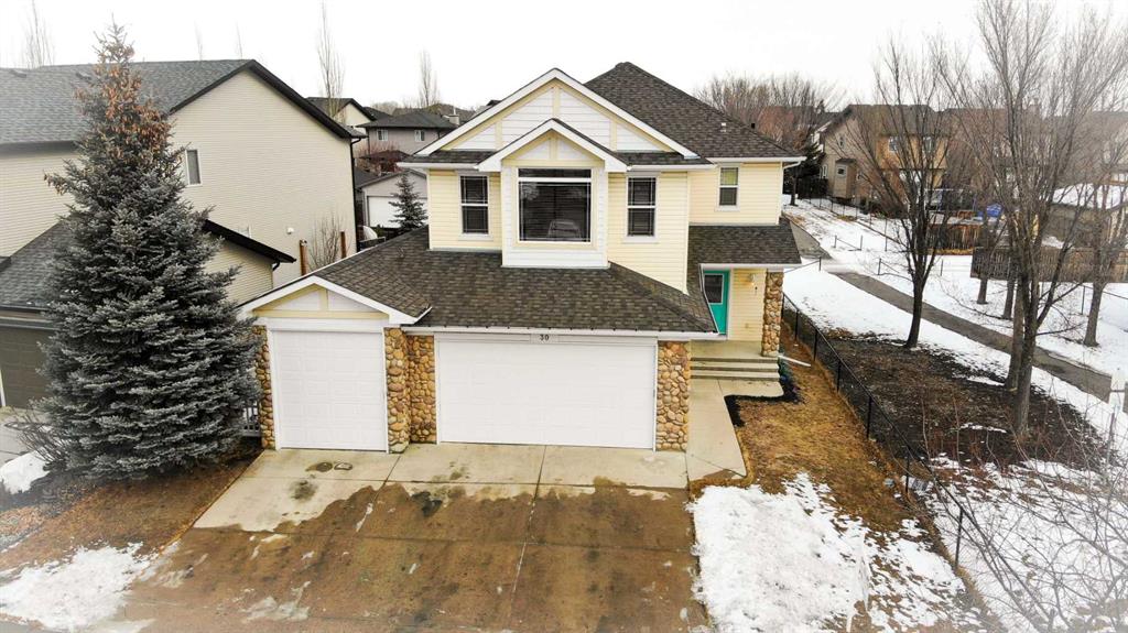 Welcome to 30 Drake Landing RD. Really awesome location in one of Okotoks best communities. This home is perfectly situated next to a walking path, as well as across the street from a great playground , not to mention the convenience of the school bus pick up almost directly in front. This large family home features close to 2500 sqft and offers really large room sizes on all levels. With 3 great bedrooms upstairs and 1 in the fully developed basement, space will not be an issue here. The main floor includes a fantastic office space adjacent to the front foyer, also a large mudroom with a nice closet and plenty of space for boots and shoes. You will love the storage in the kitchen, with full height cabinetry, large island, and stainless appliances, with an open floor plan to the dining and living room area. Perfect for entertaining,. The upper level has a perfect bonus room, with built in cabinetry, large bright windows where you can see the mountains on a clear day, as well as a fantastic ceiling fan. The size is perfect for a games room or media style space. The Primary bedroom is a fantastic size with high vaulted ceilings, and really large walk in closet. Off the primary is a full 5 piece bathroom with double vanities, large tub, and fantastic shower space. Large room sizes definitely continue into the lower level which was dully developed by the builder at the time of building so the finishing work remains congruent with the upper floors. There are 2 flex spaces separated by a gas fireplace with built in shelving. The bathroom includes a fully tiled stand up shower next to the 4th bedroom. Also to make mention is the large triple garage, which actually fits a full size truck with room to fit 2 more vehicles. This garage is a fantastic size which is a rare case in town. The rear yard has been freshly graveled with the top soil fully removed in order to accommodate some creative low maintenance landscaping ideas. Backing onto a paved lane also gives the opportunity for rear RV parking. You really do have to come see this home to experience the size and value here.