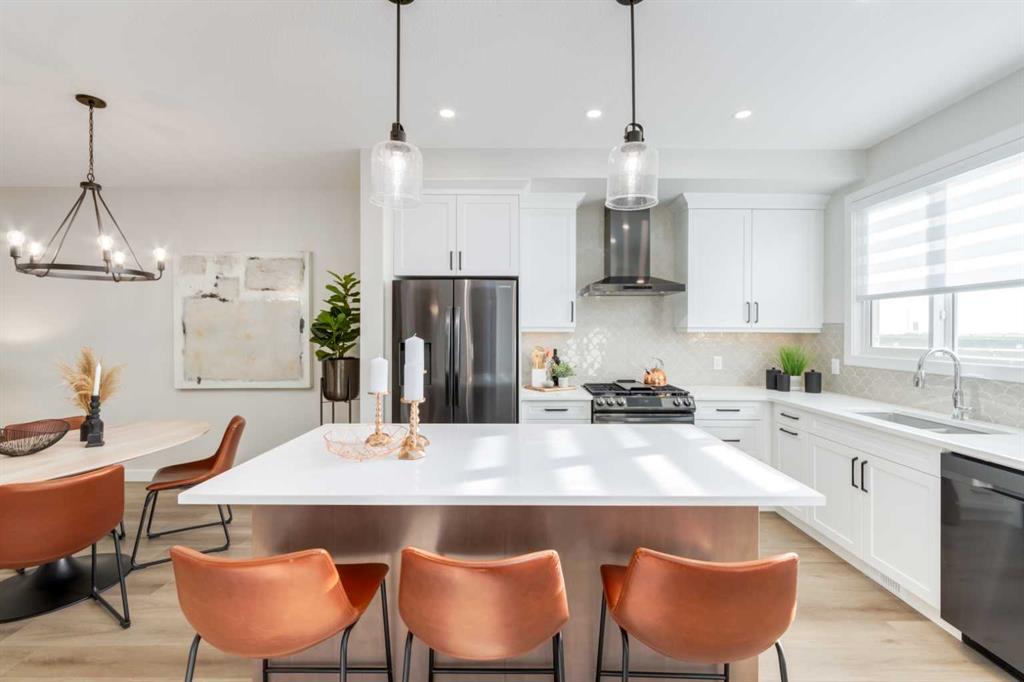 Located in the exciting new community of Tillotson in Okotoks, this home presents an incredible opportunity to take advantage of competitive pricing during the community’s launch phase. Don’t miss your chance to secure a stylish, high-quality home in one of Okotoks’ most anticipated new neighbourhoods. Step inside and discover a bright, open-concept layout designed for both comfort and entertaining, highlighted by 10’4” ceilings in the living room that create a spacious and airy feel. The main level features luxury vinyl plank flooring and luxury vinyl tile, complemented by large windows that fill the space with natural light from morning to evening. At the heart of the home, the rear kitchen overlooks the dining area and front living room, the ideal layout for entertaining friends or family. The kitchen offers a generous pantry, large island with quartz countertops, and a sleek stainless steel appliance package for modern functionality. A rear mudroom with deck access and a convenient 2-piece powder room complete this level. Upstairs, you’ll find three spacious bedrooms, two full bathrooms, upper-level laundry and linen storage. The primary suite, located at the front of the home, includes a large walk-in closet and private ensuite, while two additional bedrooms and a second full bath are positioned at the rear. Outside, both the front porch and rear deck offer inviting spaces to relax and connect with your surroundings. A two-vehicle parking pad provides ample room for a future double garage, and the side entry offers added functionality and design flexibility. Built with triple-pane windows, this home ensures energy efficiency and year-round comfort. This is your chance to own a thoughtfully designed home with high-end finishes in a growing community. Act now to take advantage of launch pricing before it’s gone! **Please note: Property is under construction and photos are take from a show home and are not an exact representation of the property for sale.