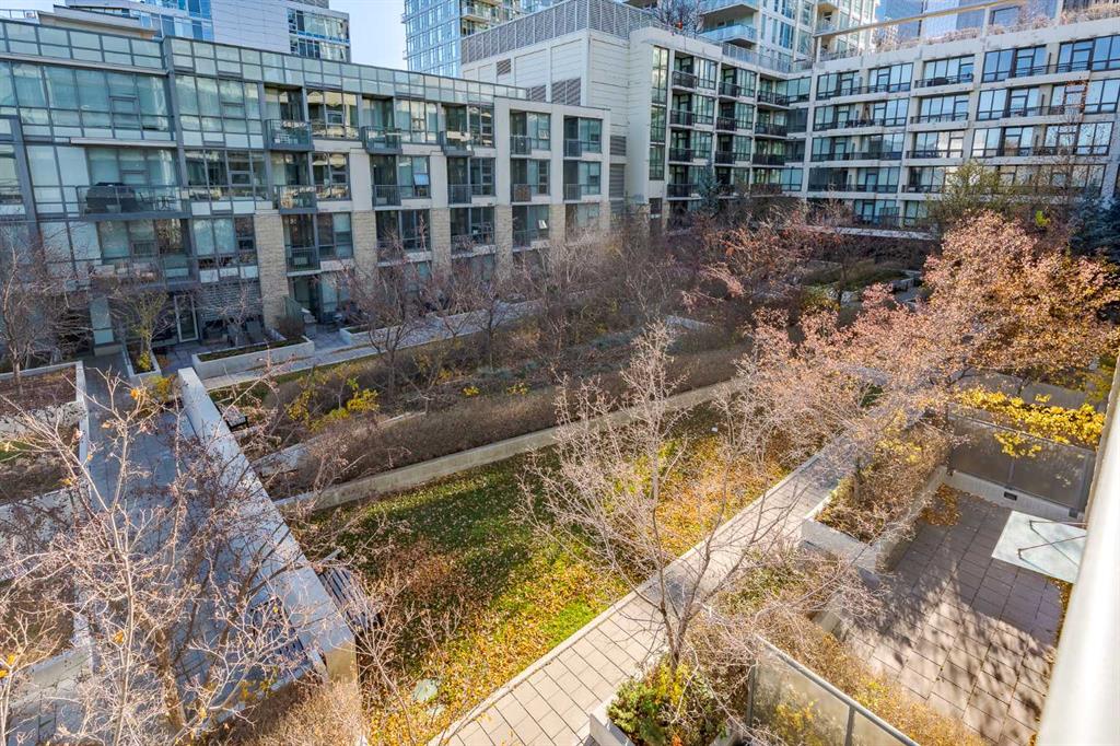 Inside, the suite offers an efficient, open floor plan with natural light and a calm outlook. Large windows frame the courtyard view and bring in consistent daylight. The living area flows to a practical kitchen (with luxury built-in appliances, quartz counters, clean lines) and a kitchen island ideal for weekday breakfasts or hosting friends. In-suite laundry and secure storage complete the functional conveniences you want in downtown living.