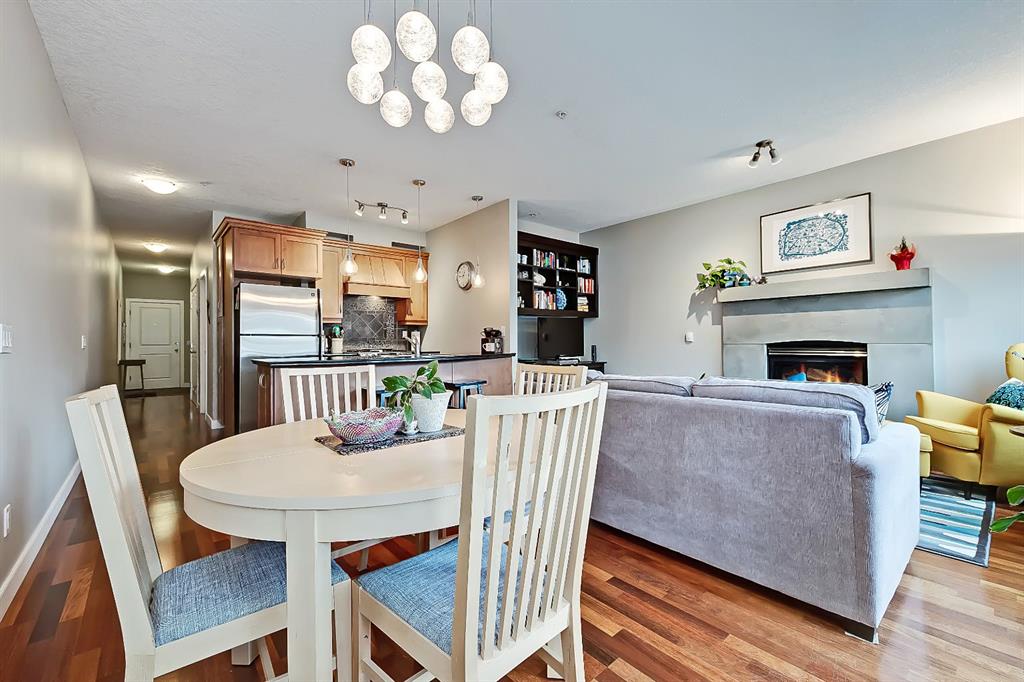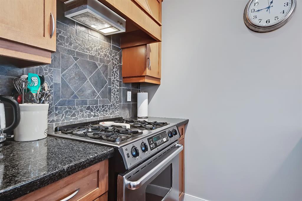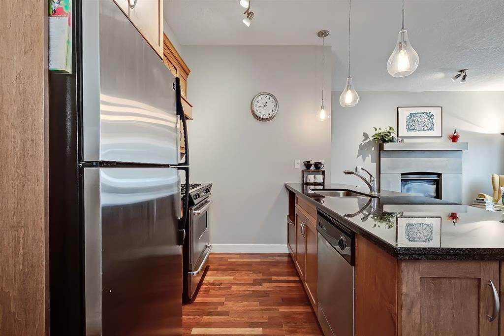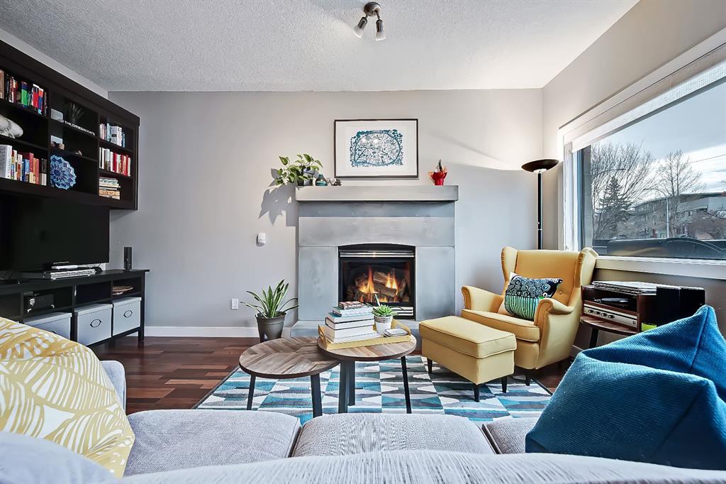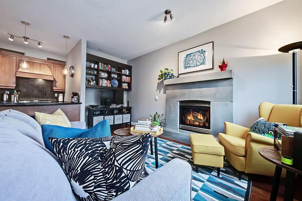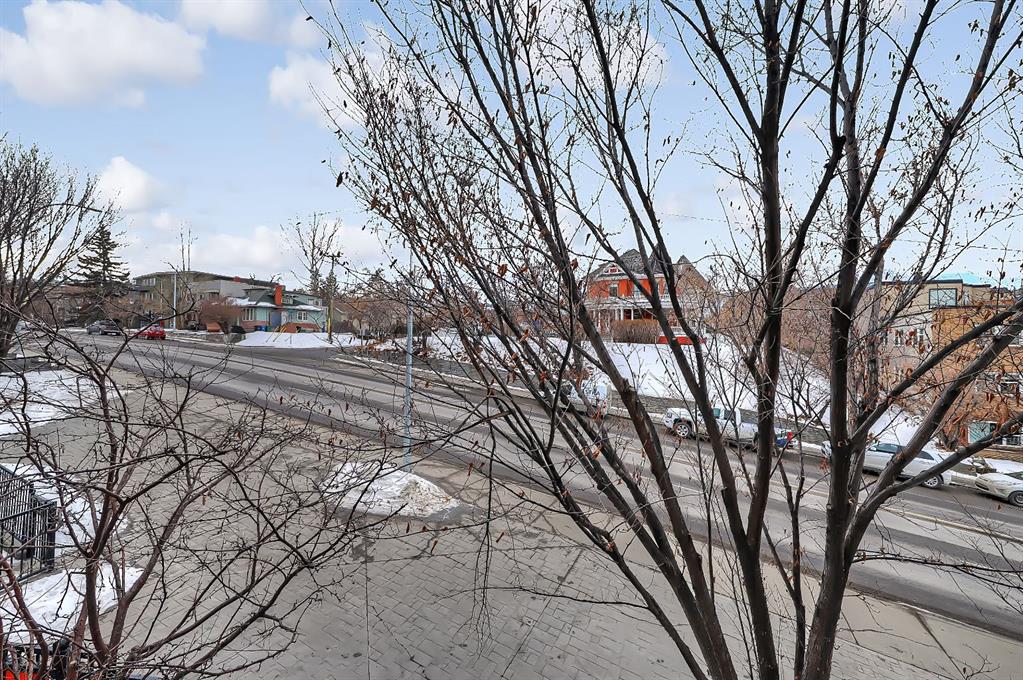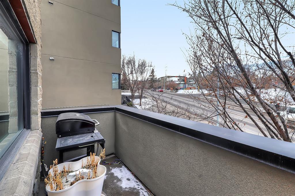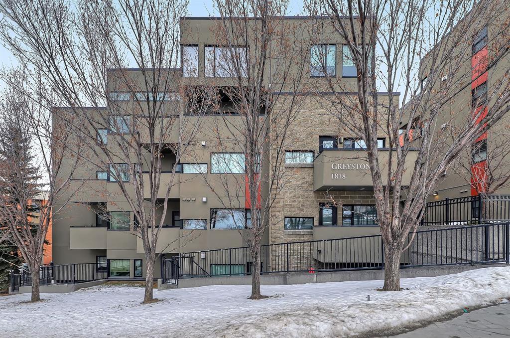 A rare opportunity to own in the exclusive GREYSTONES, perfectly positioned in the heart of Lower MOUNT ROYAL! Just steps from 17th Avenue, you’ll enjoy one of Calgary’s most vibrant & walkable lifestyles: cafés, restaurants, boutiques, live music – everything downtown offers – within easy reach…while still tucked into a quiet, well-managed building! This beautifully designed 2 bedroom, 2 bathroom condo is filled with warm WEST-facing light, creating an inviting & comfortable atmosphere throughout the main living space. Large windows and a CONCRETE MANTLE gas fireplace anchor the living area, offering the perfect place to unwind at the end of the day. Built in book case creates a corner perfect for reading or a desk would fit here easily! Open concept allows you to cook/dine/live, gaze outside at the beautiful trees in front of you (so much glass across the front of unit!) Interact with family or guests, watch TV – ALL in the same space. The deck offers extended living with MATURE trees….plus a GAS line for your BBQ! Kitchen is both functional & refined. NEW tap, NEW fridge, Granite countertops, stainless steel appliances, GAS stove & thoughtful storage. There is a bonus 2 piece bath for convenience. The primary bedroom is complete with 4 piece bath that includes a huge SOAKER TUB & separate shower, ideal for relaxing after a long day PLUS this is a feature you don’t see in inner city condos at this price point!! Custom wood shelving in closet. A second bedroom provides flexibility – use it for guests, work from home or additional living space. IN SUITE laundry. Quality IN FLOOR heating means NO baseboard heaters! TITLED PARKING (first spot through the door – makes it super easy to unload groceries etc!) BONUS – there is opportunity to “rent” a second underground spot! Rather walk or ride your bike – this is your perfect place to live! Dedicated, secure, SAFE storage space that is TRIPLE the size of normal buildings!!! With condo fees covering heat & water, this is a low-maintenance, lock-and-leave lifestyle in one of Calgary’s most sought-after inner-city locations! PET friendly & mins from the vibrant amenities of the Beltline, Mission & Marda Loop neighborhoods! CENTRALLY located. Be at airport in 25 mins, exploring the Calgary Stampede grounds in under 10 mins or hiking in Canmore within an hour! This one won’t last – call today to view!
