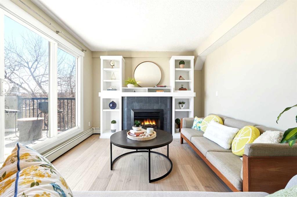 The interior has been thoughtfully updated with all-new hardwood flooring and fresh paint throughout, creating a clean and inviting space. The living area centres around a gas fireplace with stylish built-ins, and the open layout flows naturally into the dining and kitchen areas. Corner positioning means natural light pours in throughout the day.