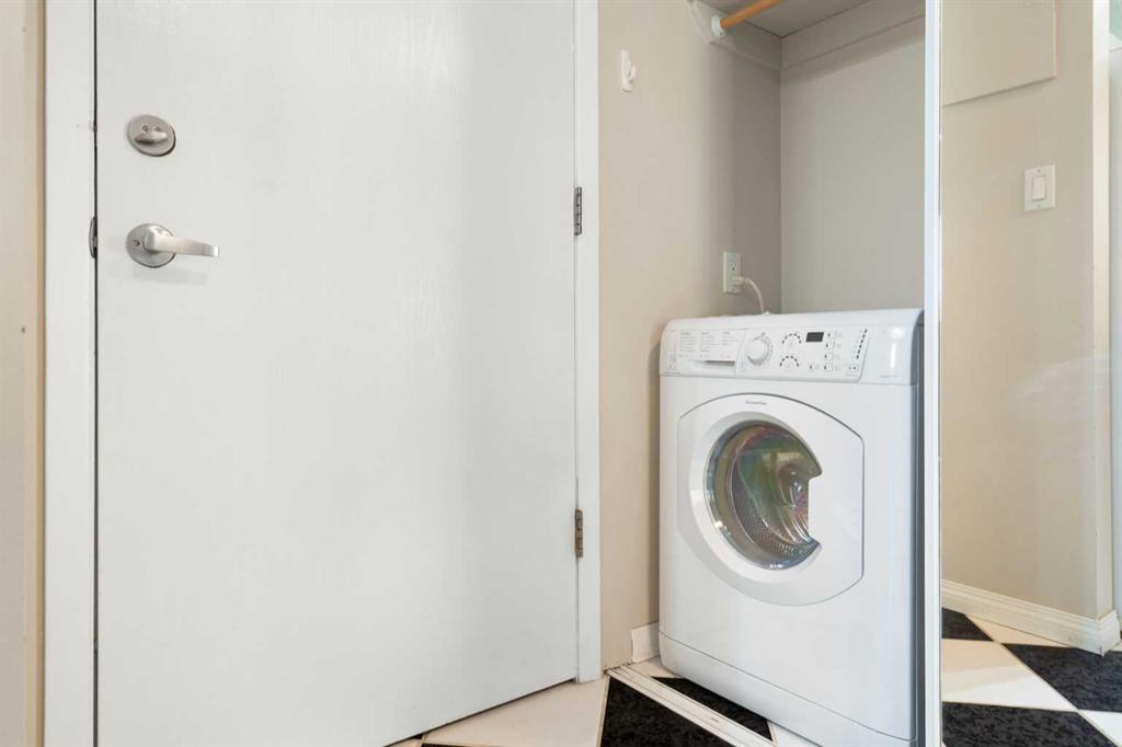 Trendy and bright top-floor walk-up condo in the heart of sought-after Sunnyside! This spacious 637 sq. ft. third-floor walk-up offers the perfect blend of inner-city living and everyday comfort. The open-concept layout features a generous living room with laminate flooring that opens to a large northwest-facing balcony—a peaceful spot surrounded by mature trees. The kitchen, accented with retro tile flooring, adjoins a cozy dining area—ideal for casual meals or entertaining friends. The primary bedroom comfortably can accommodate a Queen-sized bed, and the unit includes in-suite storage plus a convenient “all-in-one” washer/dryer. Enjoy peace of mind in this well-managed 15-unit complex. Small cats/dogs with board approval are permitted. Building is scheduled for fresh paint and new carpet in 2026. The balconies and patio doors have also have been replaced over the last 3 years. The board has been diligent about following the reserve fund study. Additional amenities include bike storage and shared laundry facilities in the basement. Assigned parking is partially covered at the rear of the building. Immediate possession is available. Walking distance LRT, bus, Bow River, biking paths, and a plethora of eateries, shops & amenities. Enjoy Inner city living at an affordable price.