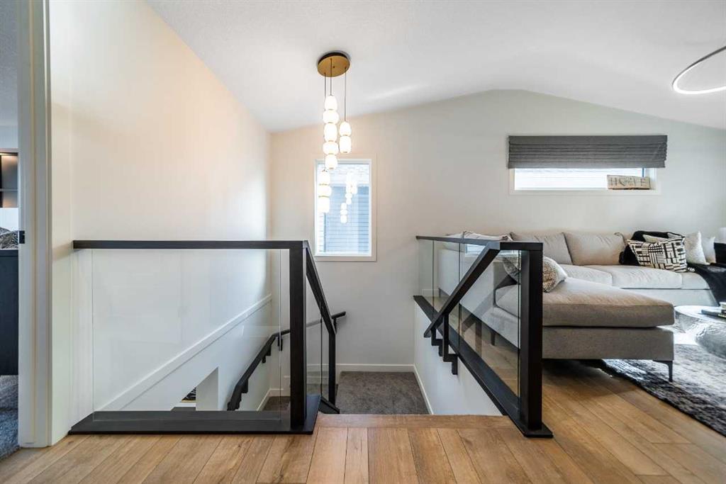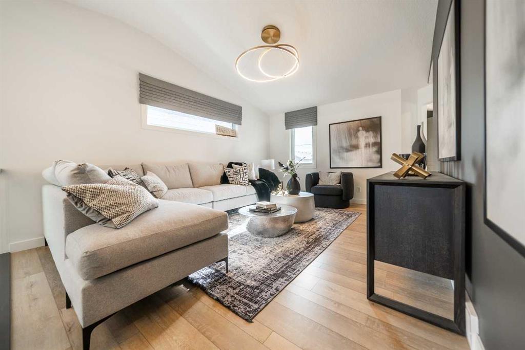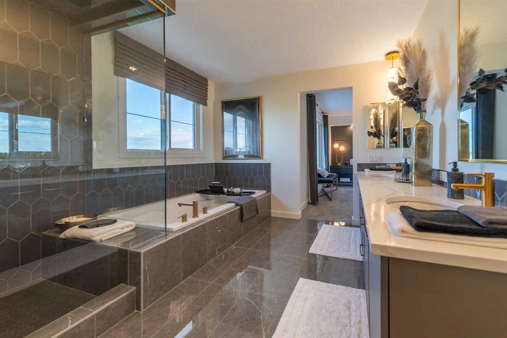 This stunning home features a walkout basement, a main floor flex room with French doors, and a full bath with a walk-in shower. Only the garages are attached, offering the feel of a detached home. Enjoy a sleek kitchen with stainless steel appliances, gas range, and a separate spice kitchen with pantry shelving. The great room boasts an electric fireplace with tile surround, and the rear deck includes a BBQ gasoline rough-in. Upstairs, find two spacious primary bedrooms with walk-in showers; the main ensuite is a luxurious 5-piece retreat. Flooded with natural light and finished with LVP flooring, tile in baths, and quartz countertops throughout.