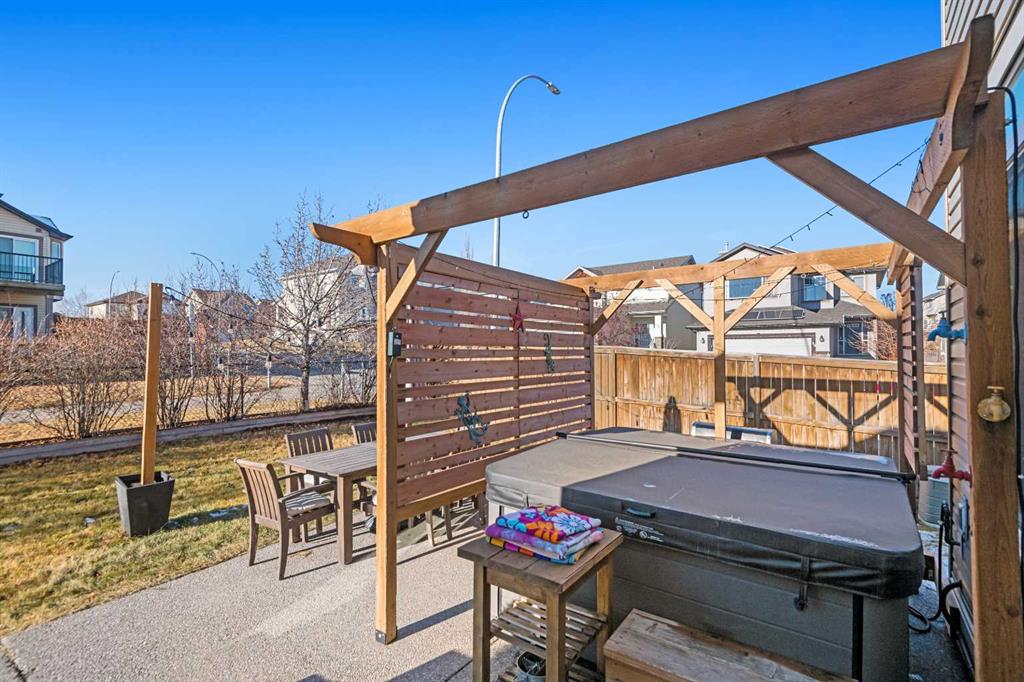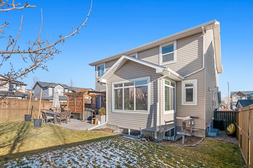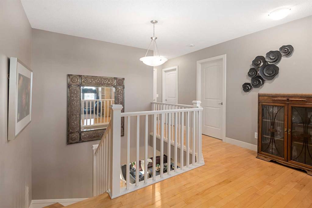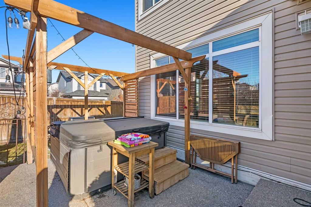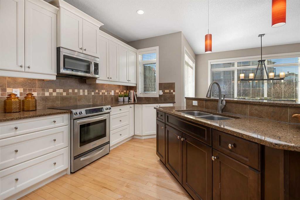 An expansive living room with large windows and gas fireplace creates a cozy space on a chilly evening. You will appreciate the white kitchen, equipped with upgraded cabinets, quartz countertops, stainless steel appliances and under-counter task lighting. There is plenty of counter space and cupboards as well as a pantry. The breakfast bar is a great place to relax over morning coffee. The adjoining dining area features more oversized windows that overlook the private backyard, where trees and shrubs offer added privacy. The backyard is great for entertaining, complete with a pergola and concrete aggregate patio. Unwind after a long day in the hot tub. The functional, thoughtfully designed main floor also features a convenient laundry room and a powder room. The second floor bonus room is bathed in natural light and features vaulted ceilings. The primary bedroom is a true sanctuary, with another vaulted ceiling, a spacious layout with large walk in closet and an 5-piece ensuite bathroom. Indulge in the double vanities with quartz counters, a double shower with a bench, and a relaxing corner soaker tub. Two additional kid-friendly bedrooms and a well-appointed 4-piece bathroom complete this level, along with extra storage options provided the linen closet and a dedicated storage closet in the main bath. The unfinished basement presents a blank canvas, offering lots of storage space and the perfect opportunity to create the additional living area of your dreams! You’ll love the impressive upgrades throughout, including crown mouldings, 9-foot ceilings, and hardwood floors. There is a new, high efficiency furnace to keep you comfortable this winter. This lovely family home has an ideal location, backing onto a walking path, and is just minutes away from schools, playgrounds, green spaces, and convenient shopping options. Experience the perfect blend of comfort, style, and functionality. Quick possession is possible – be home in time for Christmas!