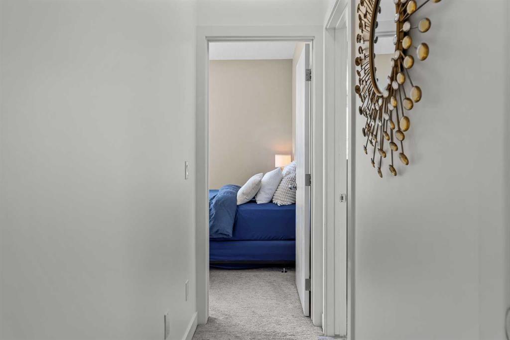 home is the open-concept kitchen and living area, where upgraded stainless steel appliances and elegant quartz countertops set the stage for culinary adventures and memorable gatherings. The kitchen seamlessly integrates with the living space, enhanced by hardwood flooring throughout the main floor and the warmth of a tile-surrounded fireplace that invites cozy evenings by the glow of dancing flames. A unique feature of this townhome is its dual outdoor retreats. The sunken patio off the dining area overlooks a quiet green space, presenting a perfect setting for alfresco dining or unwinding with incredible mountain views. A second private patio off the second bedroom provides an inviting space to savour the fresh mountain air and watch nature’s colours shift throughout the day. Additional amenities include a convenient laundry space with stacked washer and dryer, a single- car garage, and access to a community rich in pathways, hiking trails, and parks. Positioned close to world-class golf courses, ski hills, local schools, and the soon-to-be-open Gateway shopping district, this home offers not only luxurious living but also an enviable location that caters to an active, yet relaxed lifestyle. Discover a home that embodies both upscale elegance and serene comfort—a perfect haven for those who value quality, style, and a connection to nature.