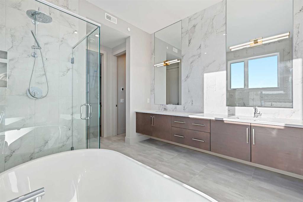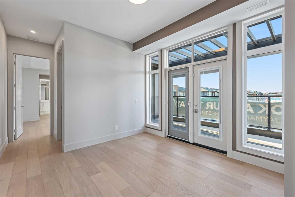 The Streams of Lake Mahogany present an elevated single-level penthouse lifestyle in our stunning Reflection Estate homes situated Lake Side on Mahogany Lake. Selected carefully from the best-selling renowned Westman Village Community, you will discover THE SPRINGS, a home created for the most discerning buyer, offering a curated space to enjoy and appreciate the hand-selected luxury of a resort-style feeling while providing you a maintenance-free opportunity to lock and leave. Step into an expansive 2000+ builders sq ft stunning home overlooking the gorgeous Mahogany Lake featuring a thoughtfully designed open floor plan inviting an abundance of natural daylight with soaring 12-foot ceilings and floor to ceiling windows. The centralized living area, ideal for entertaining, offers a Built-in ULTRA JennAir appliance package with a 42” – 24.2 Cu Ft., Built-In, paneled, french door refrigerator with Obsidian black interior and built-in icemaker plus water with surround refrigerator Armoire Kit. Additionally, 24” cabinet panel ready dishwasher with stainless steel interior, 36” Professional-Style gas range top, Faber built-in cabinet hood fan, 30” combination wall oven plus microwave and Silhouette Emmental 24″ Bev. Center; all nicely complemented by a Mountain Mist Elevated Colour Palette. All feature stunning Quartz countertops. You will enjoy two beautiful bedrooms, a generous central living area, with the Primary Suite featuring a spacious 5-piece oasis-like ensuite with dual vanities, a large soaker tub, a stand-alone shower, and a generous walk-in closet. The Primary Suite and main living area step out to a 35 ft x 17 ft terrace with a lovely view of the stunning Lake. Yours to enjoy and soak in every single day. To complete the package, you have a sizeable office area adjacent to the spacious laundry room and powder room, which open onto another expansive 25ft terrace, and a double-attached heated garage with a full-width, length driveway. Custom additions to the home include under-cabinet lighting in the kitchen, A/C, a laundry room with a convenient folding counter, a coffee bar, an office space, and more. Jayman’s standard inclusions feature their trademark Core Performance, which includes 4 Solar Panels used to power common spaces, Built Green Canada Standard with an Energuide rating, UVC Ultraviolet light air purification system, high-efficiency heat pump for air conditioning, forced air fan coil hydronic heating system, active heat recovery ventilator, Navien-brand tankless hot water heater, triple pane windows and smart home technology solutions. Enjoy Calgary’s largest lake, with 21 more acres of beach area than any other community.