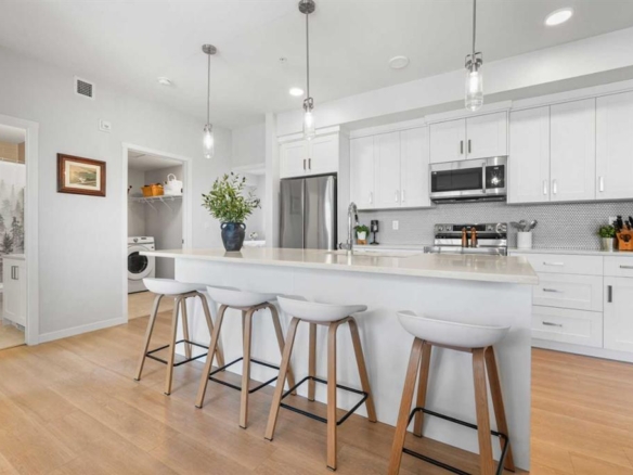 SUBSTANTIALLY REDUCED . WHAT A LOCATION ! Just one block from Calgary’s river pathways and walking distance to Downtown. This large exquisite apartment offers a sophisticated retreat with downtown views. Thoughtfully designed for those seeking elegance and comfort in this spacious unit. The attention to detail enhanced with custom finishes are showcased throughout this home. From the open foyer featuring stunning barn doors, through to the expansive kitchen with quartz counters and seamlessly flows to living and dinning area that expansive nature is wonderful for hosting those memorable events at home. The inviting living room has large bright east facing windows with motorized Zebra blinds, a central remote controlled gas fireplace cased in stone with a large mantle perfect for relaxing and has sliding doors to an oversized balcony that has new composite tiles for comfort. The Primary bedroom offers a spa like experience with access to the balcony. The room can be bright or darkened for your relaxation needs. There is a large walk in custom closet, an updated en suite bathroom . The second bedroom/office which is also a generous size, a large laundry room / storage / hobby area. Additional features of this home are new triple head Daiken air conditioning units which come with a life warranty with an annual mtc fee, a secondary storage area, new engineered hardwood floors, updated faucets, updated lighting, motorized blinds. The concrete construction ensures a noise free environment and layout gives a feel of privacy from neighbors. The building has underground parking, a recently updated lobby, exercise room and social room with wet bar and pool table that is available for booking larger groups, an recently update exterior entrance. Please note that dogs are only permitted if either a service animal or companion status.