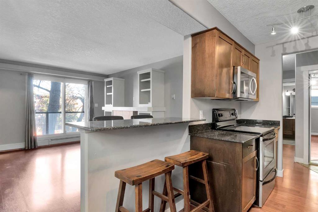 A rare opportunity to own as first time homebuyer, downsizer, or investor in an exceptional and unbeatable location, a 2 bed/1 bath with 731sqft of developed space offered in the heart of Sunnyside! A large living space with fire-place and built-in shelving, leading to a large North facing balcony. Featuring a functional kitchen with Granite Counter–tops, stainless steel appliances, and an adjacent island-eat up breakfast bar. 2 spacious rooms and a full 4-piece bathroom completes this floor. This apartment provides in-suite laundry, a separate storage locker for securing any extra belongings or seasonal items, and a covered assigned parking stall – ensuring a convenient place to park your vehicle! Enjoy quick access by foot to Trendy Restaurants/Cafes, Groceries, and Downtown Calgary, Public transit, Famous Protected Parks, and the River pathways. More than just the property itself, this condo captures a lifestyle of Kensington culture and charm. ~~ Very pet friendly with board approval ~~