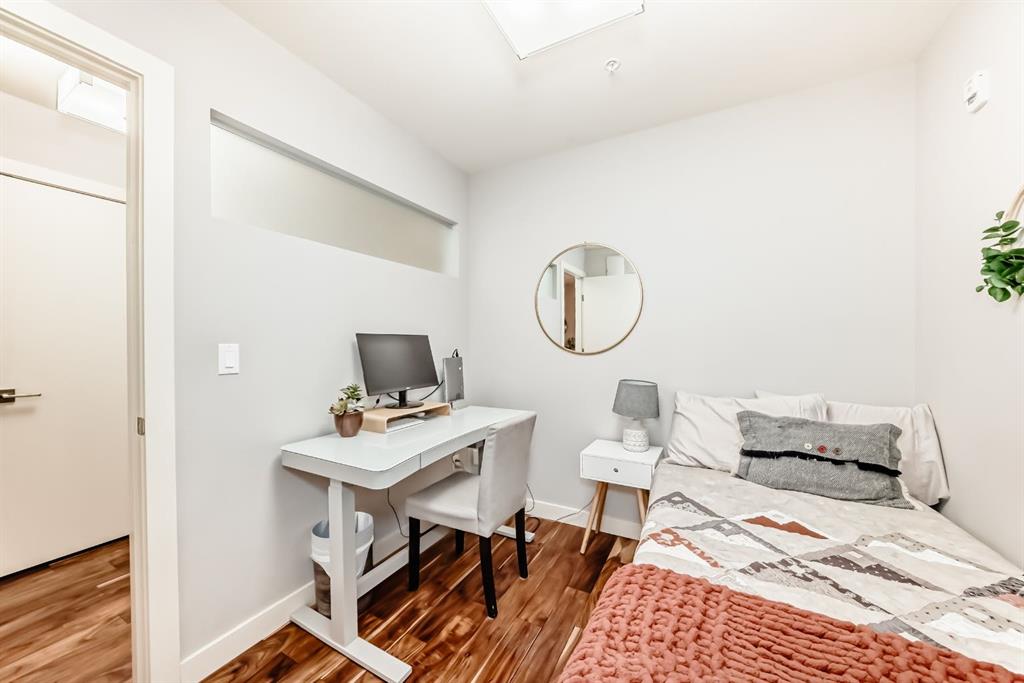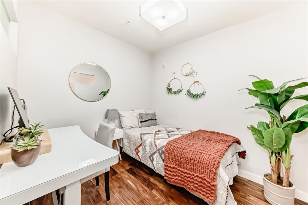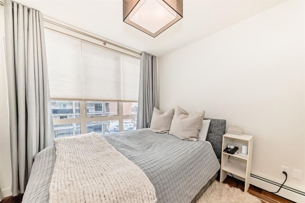 “” OPEN HOUSE: SUNDAY, JUNE 15, 11:00 AM – 1:00 PM. “”. Excellent professional and or investor condo ((short term rentals allowed) in a prime area of Connaught/Beltline. Sunny south unit direction with air conditioning ($10000 option). Two bedroom, two full bathrooms (Ensuite and guest bathrooms), spacious living room, kitchen with dining, eating bar area, upgrade features include: quartz countertops, engineered hardwood flooring, spacious open plan, 9 foot ceilings, in suite laundry, spacious deck, one rear lot parking stall, beside rear access door. Bedroom 2 fits a bed. No exterior window and closet is in hallway. Extra storage locker in parkade area Location is close to everything downtown: restaurants, coffee shops, etc. but location is still quiet at night – away from the noise of the nightlife.