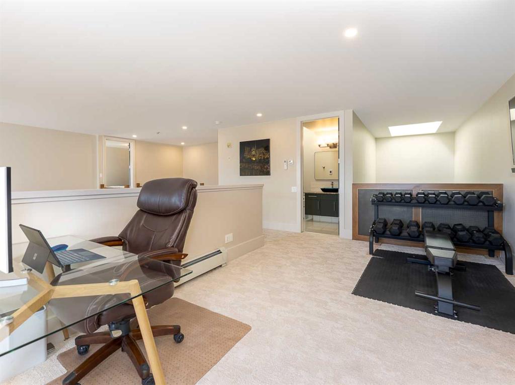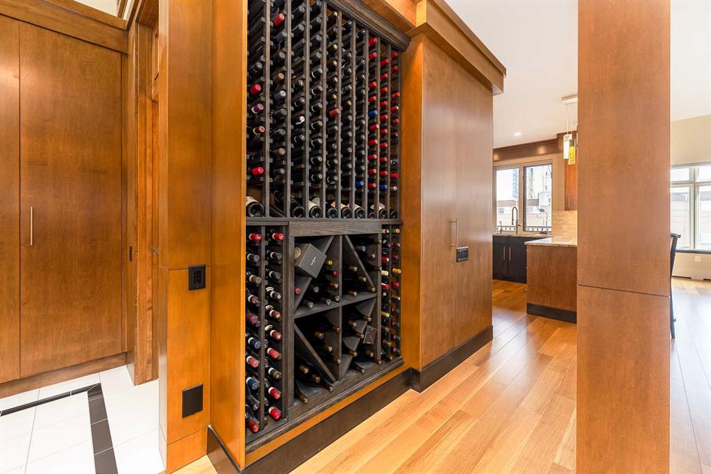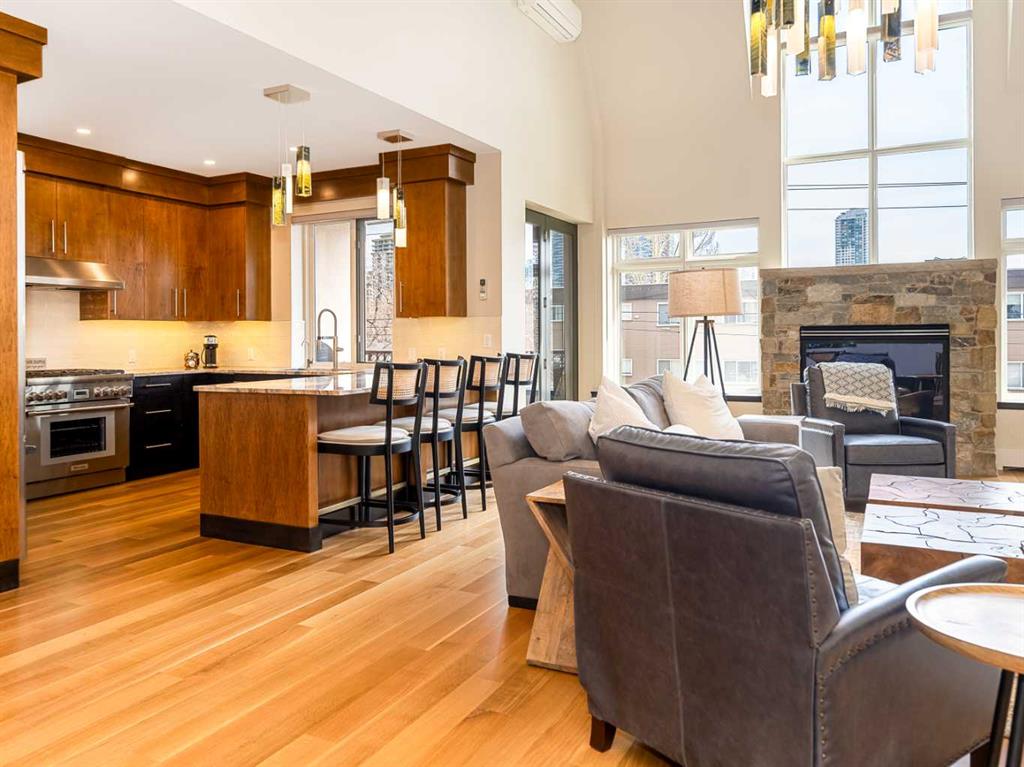 Luxury and sophistication converge in this meticulously renovated penthouse in the heart of Hillhurst. Just steps from Kensington’s vibrant shops and restaurants, the Bow River pathways, and the downtown core, this exceptional residence offers an elevated urban lifestyle. Situated in the boutique 12-unit Villagio building, constructed with superior ICF for outstanding soundproofing and energy efficiency, the home features a semi-private elevator that opens directly to the unit’s entrance. A grand foyer with soaring ceilings and an overhead skylight sets the tone as you enter this impressive two-level residence. The open-concept design is highlighted by dramatic 18-foot ceilings and a stunning south-facing wall of windows that fills the space with natural light. The central living room showcases a custom stone gas fireplace and a striking imported 120-piece hand-blown glass chandelier. Patio doors lead to one of two south-facing outdoor spaces, ideal for relaxing or entertaining. The chef’s kitchen is a true showpiece, featuring premium appliances including a Thermador dual-fuel gas range, Sapphire dishwasher, Viking refrigerator, and built-in microwave. Hand-selected quartzite countertops complement the space, while imported custom light fixtures add refined character. Adjacent to the kitchen, the dining area features a custom wine display with oak racking and a built-in buffet complete with a wine fridge and quartzite counters. A distinctive custom light fixture adds warmth and elegance to the space. The main-level primary retreat offers built-in cabinetry and a luxurious spa-inspired ensuite with dual sinks, Hansgrohe fixtures, quartzite countertops, a steam shower, and a custom cast-iron slipper tub. The suite is completed by a spacious walk-in closet. A powder room and convenient laundry area complete the main floor. The upper level features a second bedroom with access to a large in-suite storage room, a three-piece bathroom, and a versatile flex space ideal for a home office. A catwalk overlooking the living area below leads to patio doors that open onto the second south-facing patio, creating another private outdoor retreat. Extensive renovations throughout the home include new quarter-sawn engineered oak flooring on the main level, newer carpeting upstairs, modern railings overlooking the living room, fresh paint, and new remote-controlled window coverings. Comfort is enhanced by a newly installed Fujitsu mini-split four-zone inverter system, providing flexible climate control with independent heating, cooling, or fan settings for individual areas. The unit also includes two titled parking stalls, both generously sized to accommodate a full-size truck. This remarkable penthouse must be experienced in person to be fully appreciated.
