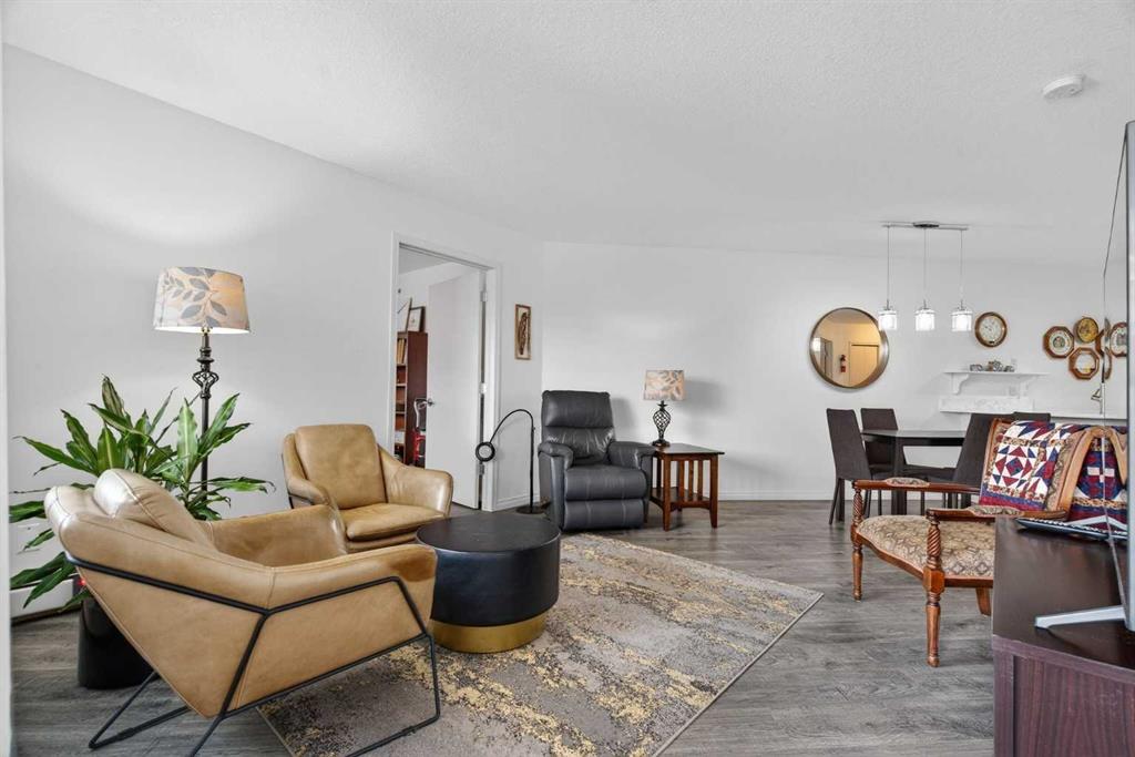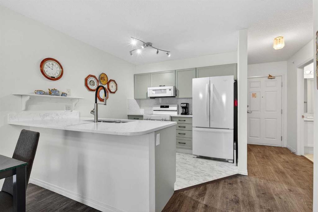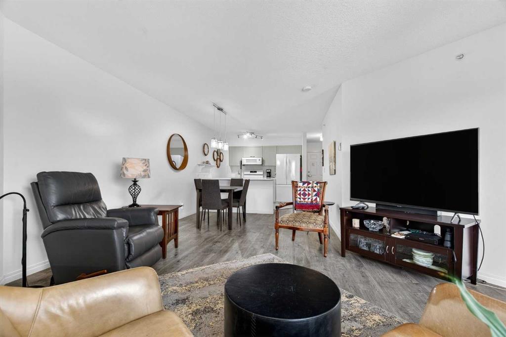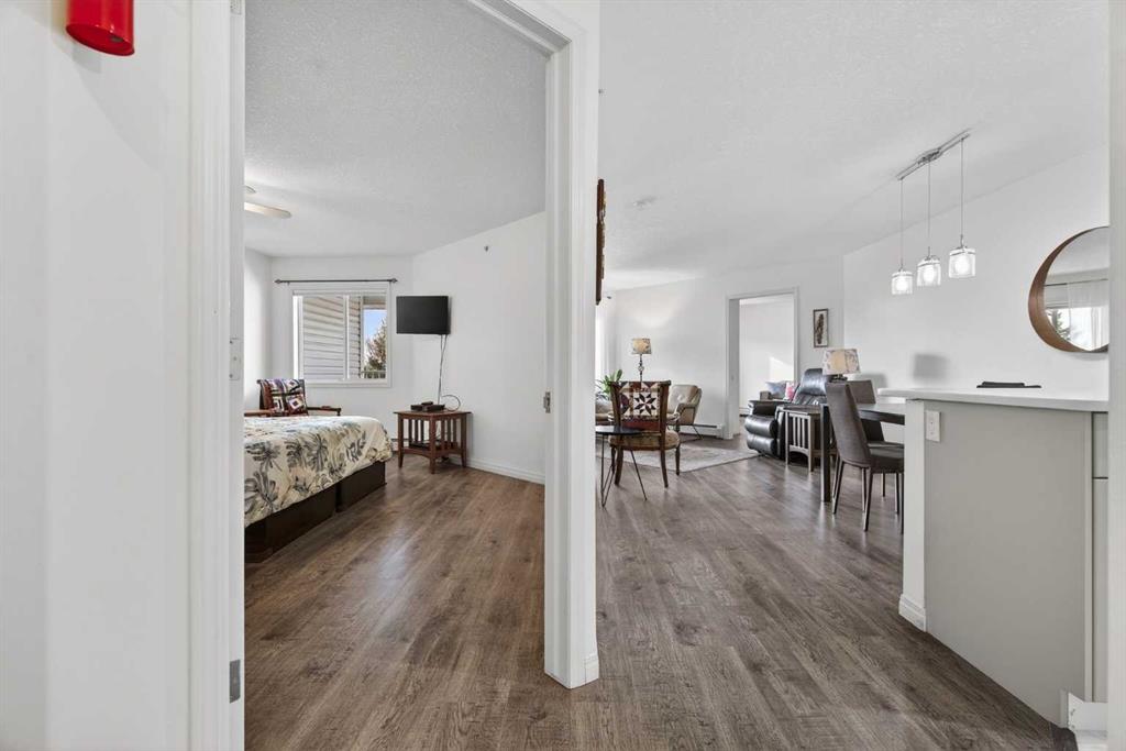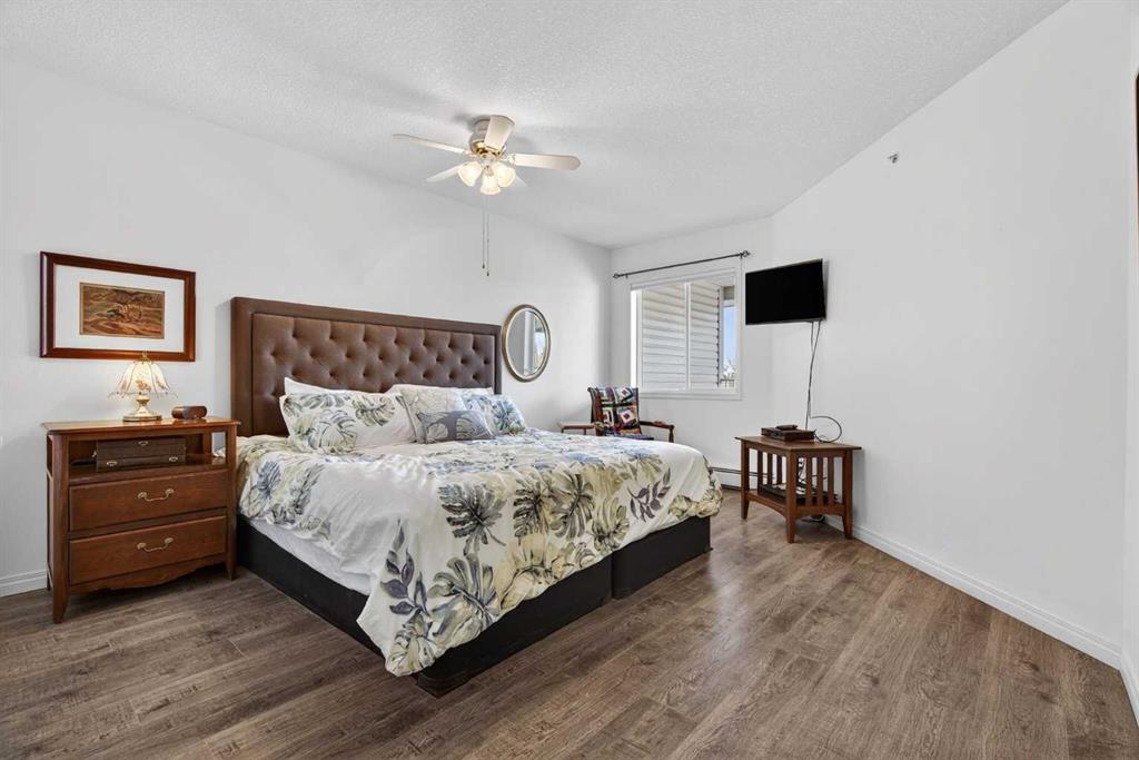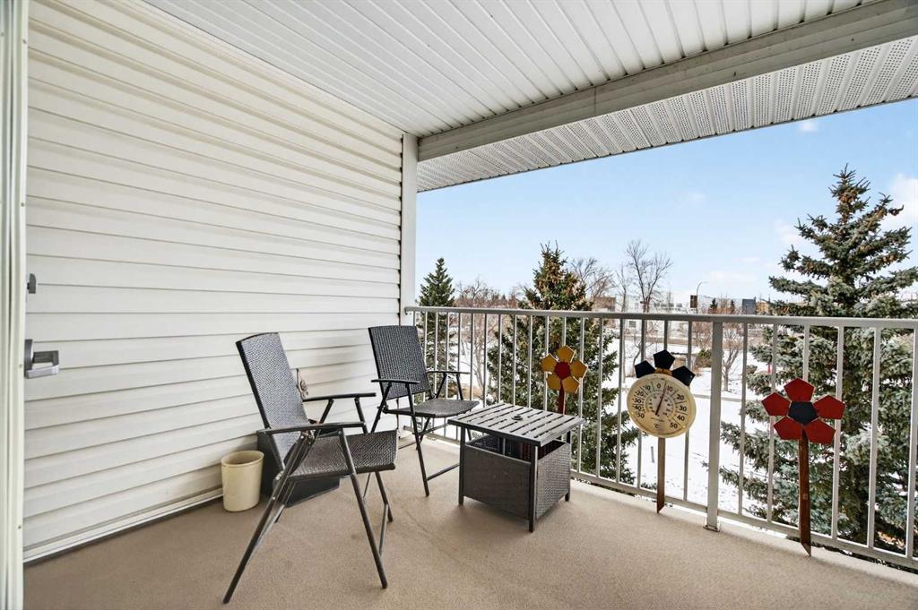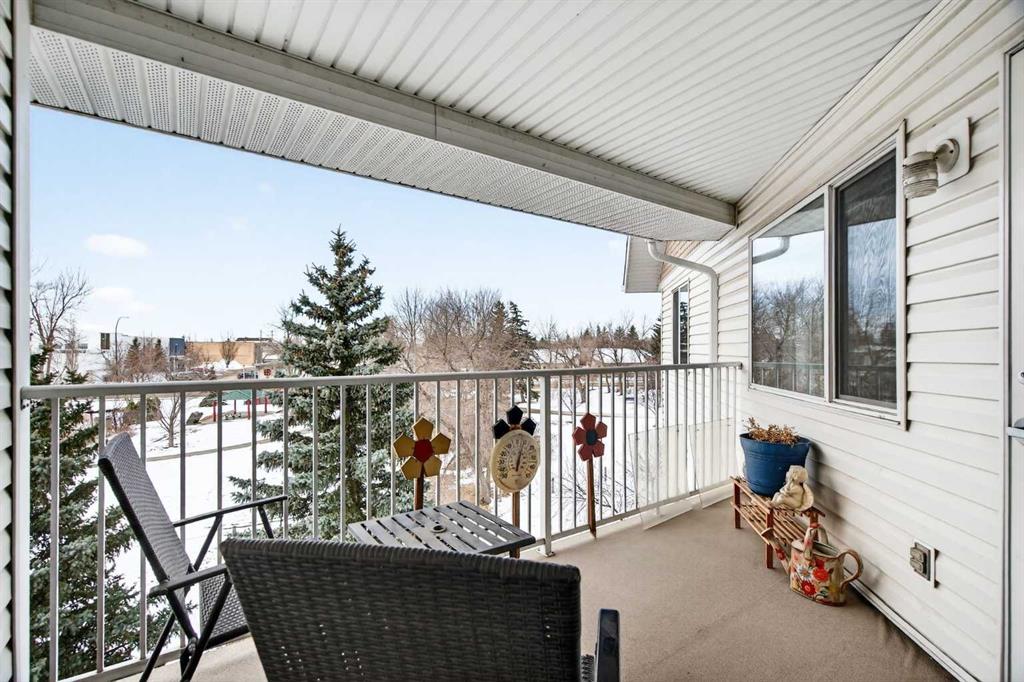 TOP FLOOR – 2 BED and 1 BATH FACING THE PARK. Welcome to Strathmore’s amazing 55+ ADULT COMMUNITY- LAMBERT VILLAGE – a sought after centrally positioned complex that enjoys a 10/10 walkability score plus SCORES OF AMENITIES WITHIN THE BUILDING. This TOP FLOOR APARTMENT enjoys over 885 sq ft of LIVING SPACE with a balcony that overlooks the quiet private green space. An OPEN FLOOR PLAN design that maximizes the SOUTHWEST facing windows that overlook the GREEN SPACE & PARK; home to our native wildlife. Easy care LAMINATE FLOORING flows throughout the unit and highlight the airiness and spacious layout. The kitchen features UPDATED CABINETRY overlaid with SLEEK QUARTZ countertops, NEW APPLIANCES and a double stainless sink. Enjoy the comfort and ease of serving dinner or informal meal times at the EAT UP COUNTER. Flowing from the step saving kitchen is an OVERSIZED LIVING ROOM that easily accommodates a sofa and easy chair for larger gatherings. King sized furniture is doable in the oversized primary retreat that boasts a huge double closet and ample space to add an armchair. The 2ND BEDROOM is spacious and also overlooks the quiet park behind. There is a 3 pc bath that has a beautiful walk in shower with a large seating area. An exceptionally spacious vanity for toiletries and towels has been updated as well with quartz counters. There is additional storage in the washroom for linens too. IN-SUITE LAUNDRY is located adjacent to the washroom and also features extra storage for brooms and mops. There is also additional storage down the hall for your seasonal items at no additional charge. The fitness room is just steps away. An assigned parking stall is located close to the front door. LAMBERT VILLAGE offers an on-site HAIR SALON, WELLNESS ROOM, MEDIA/GAMES/REC ROOMS, CRAFT AND WORKSHOP AREAS, WELL STOCKED LIBRARY and a fully equipped kitchen for resident gatherings or private family party’s. A PRIVATE GUEST SUITE is available for overnight guests for a nominal fee with pre registration through the office and is located within steps of this unit for ease of your your company. For the active retiree, there is on site RV PARKING and additional visitor parking. CALL TODAY to view your new home; surrounded by beautiful parks, walking paths, Kinsmen Park and Lake. YOU WON’T BE DISAPPOINTED! Condo fee includes, parking, snow removal, water, sewer, trash, heat, cable TV, grounds maintenance, interior maintenance of the common areas plus all the amenities. Call your favorite realtor today to view this move in ready home.