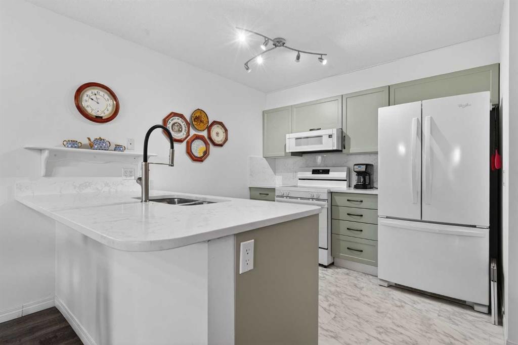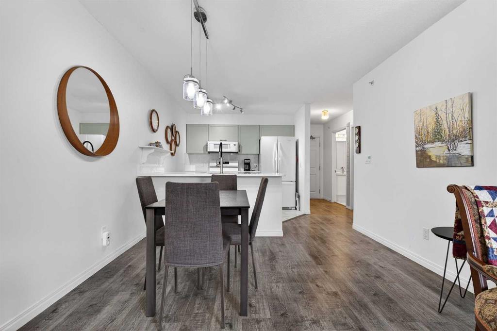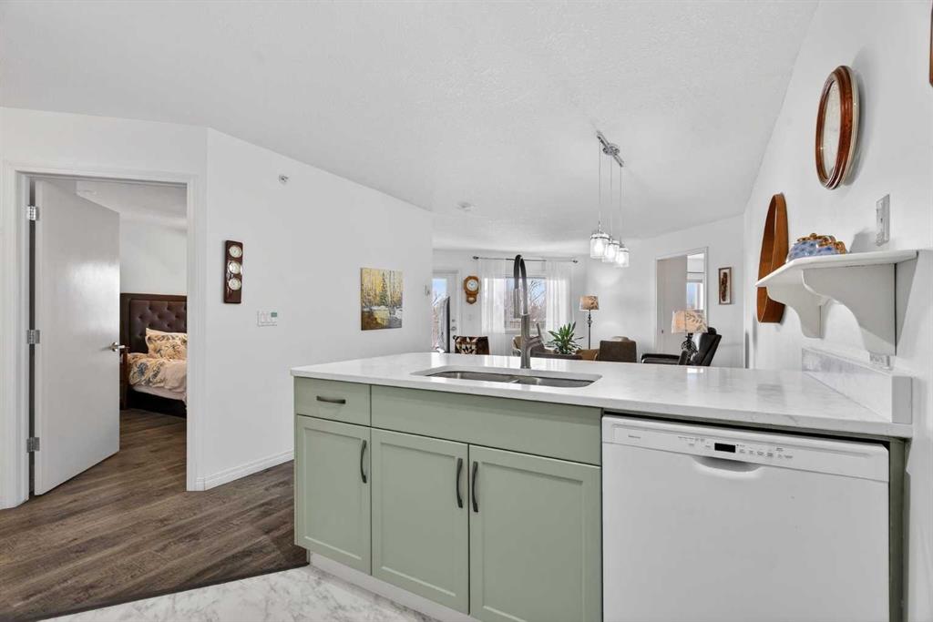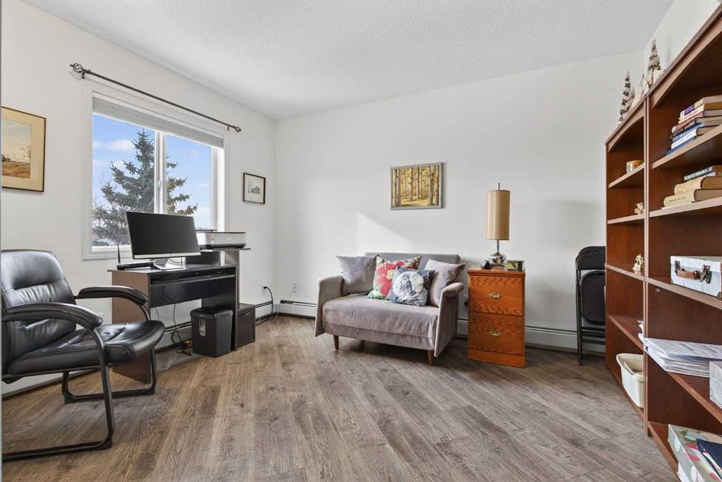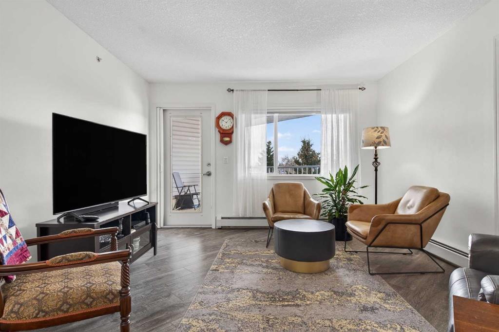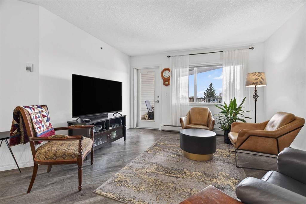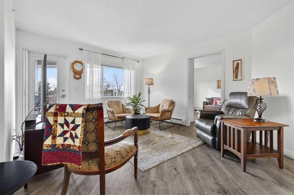 TOP FLOOR – 2 BED and 1 BATH FACING THE PARK. Welcome to Strathmore’s amazing 55+ ADULT COMMUNITY- LAMBERT VILLAGE – a sought after centrally positioned complex that enjoys a 10/10 walkability score plus SCORES OF AMENITIES WITHIN THE BUILDING. This TOP FLOOR APARTMENT enjoys over 885 sq ft of LIVING SPACE with a balcony that overlooks the quiet private green space. An OPEN FLOOR PLAN design that maximizes the SOUTHWEST facing windows that overlook the GREEN SPACE & PARK; home to our native wildlife. Easy care LAMINATE FLOORING flows throughout the unit and highlight the airiness and spacious layout. The kitchen features UPDATED CABINETRY overlaid with SLEEK QUARTZ countertops, NEW APPLIANCES and a double stainless sink. Enjoy the comfort and ease of serving dinner or informal meal times at the EAT UP COUNTER. Flowing from the step saving kitchen is an OVERSIZED LIVING ROOM that easily accommodates a sofa and easy chair for larger gatherings. King sized furniture is doable in the oversized primary retreat that boasts a huge double closet and ample space to add an armchair. The 2ND BEDROOM is spacious and also overlooks the quiet park behind. There is a 3 pc bath that has a beautiful walk in shower with a large seating area. An exceptionally spacious vanity for toiletries and towels has been updated as well with quartz counters. There is additional storage in the washroom for linens too. IN-SUITE LAUNDRY is located adjacent to the washroom and also features extra storage for brooms and mops. There is also additional storage down the hall for your seasonal items at no additional charge. The fitness room is just steps away. An assigned parking stall is located close to the front door. LAMBERT VILLAGE offers an on-site HAIR SALON, WELLNESS ROOM, MEDIA/GAMES/REC ROOMS, CRAFT AND WORKSHOP AREAS, WELL STOCKED LIBRARY and a fully equipped kitchen for resident gatherings or private family party’s. A PRIVATE GUEST SUITE is available for overnight guests for a nominal fee with pre registration through the office and is located within steps of this unit for ease of your your company. For the active retiree, there is on site RV PARKING and additional visitor parking. CALL TODAY to view your new home; surrounded by beautiful parks, walking paths, Kinsmen Park and Lake. YOU WON’T BE DISAPPOINTED! Condo fee includes, parking, snow removal, water, sewer, trash, heat, cable TV, grounds maintenance, interior maintenance of the common areas plus all the amenities. Call your favorite realtor today to view this move in ready home.