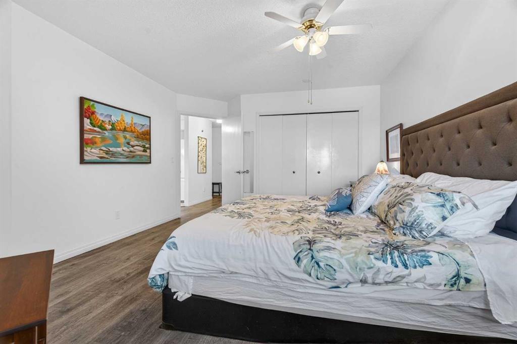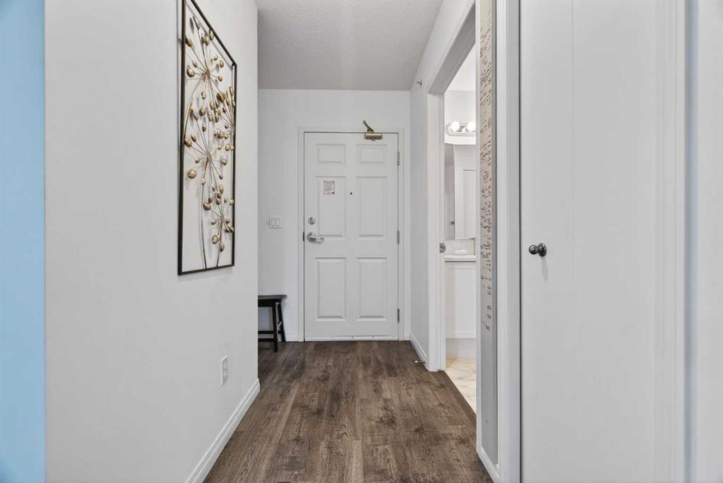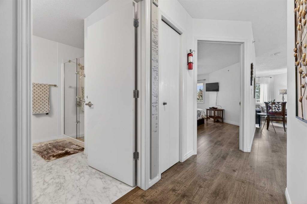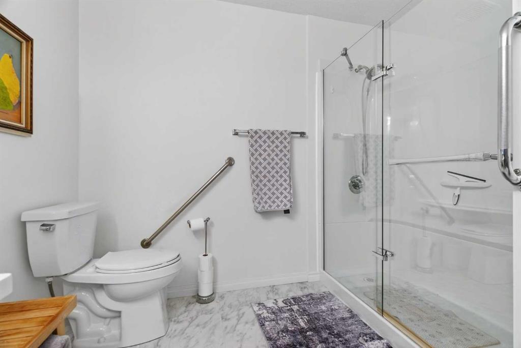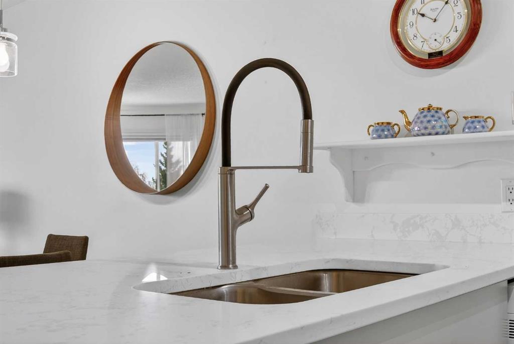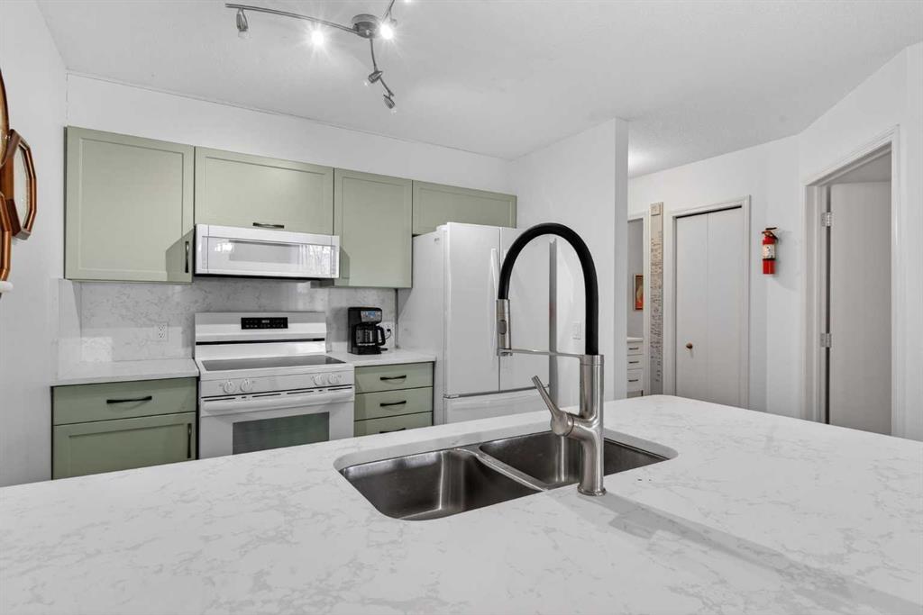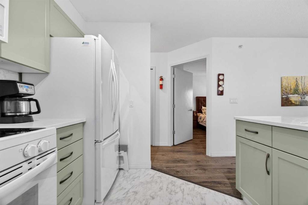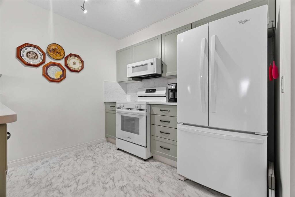 TOP FLOOR – 2 BED and 1 BATH FACING THE PARK. Welcome to Strathmore’s amazing 55+ ADULT COMMUNITY- LAMBERT VILLAGE – a sought after centrally positioned complex that enjoys a 10/10 walkability score plus SCORES OF AMENITIES WITHIN THE BUILDING. This TOP FLOOR APARTMENT enjoys over 885 sq ft of LIVING SPACE with a balcony that overlooks the quiet private green space. An OPEN FLOOR PLAN design that maximizes the SOUTHWEST facing windows that overlook the GREEN SPACE & PARK; home to our native wildlife. Easy care LAMINATE FLOORING flows throughout the unit and highlight the airiness and spacious layout. The kitchen features UPDATED CABINETRY overlaid with SLEEK QUARTZ countertops, NEW APPLIANCES and a double stainless sink. Enjoy the comfort and ease of serving dinner or informal meal times at the EAT UP COUNTER. Flowing from the step saving kitchen is an OVERSIZED LIVING ROOM that easily accommodates a sofa and easy chair for larger gatherings. King sized furniture is doable in the oversized primary retreat that boasts a huge double closet and ample space to add an armchair. The 2ND BEDROOM is spacious and also overlooks the quiet park behind. There is a 3 pc bath that has a beautiful walk in shower with a large seating area. An exceptionally spacious vanity for toiletries and towels has been updated as well with quartz counters. There is additional storage in the washroom for linens too. IN-SUITE LAUNDRY is located adjacent to the washroom and also features extra storage for brooms and mops. There is also additional storage down the hall for your seasonal items at no additional charge. The fitness room is just steps away. An assigned parking stall is located close to the front door. LAMBERT VILLAGE offers an on-site HAIR SALON, WELLNESS ROOM, MEDIA/GAMES/REC ROOMS, CRAFT AND WORKSHOP AREAS, WELL STOCKED LIBRARY and a fully equipped kitchen for resident gatherings or private family party’s. A PRIVATE GUEST SUITE is available for overnight guests for a nominal fee with pre registration through the office and is located within steps of this unit for ease of your your company. For the active retiree, there is on site RV PARKING and additional visitor parking. CALL TODAY to view your new home; surrounded by beautiful parks, walking paths, Kinsmen Park and Lake. YOU WON’T BE DISAPPOINTED! Condo fee includes, parking, snow removal, water, sewer, trash, heat, cable TV, grounds maintenance, interior maintenance of the common areas plus all the amenities. Call your favorite realtor today to view this move in ready home.