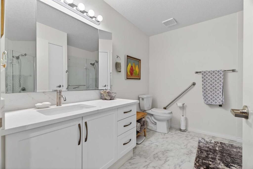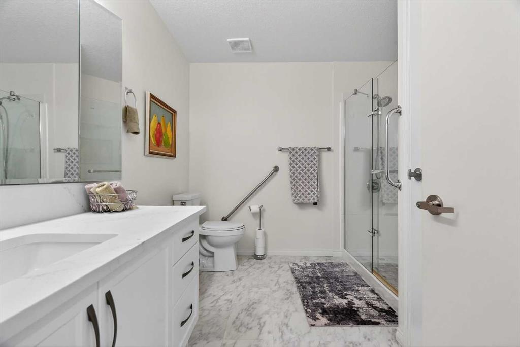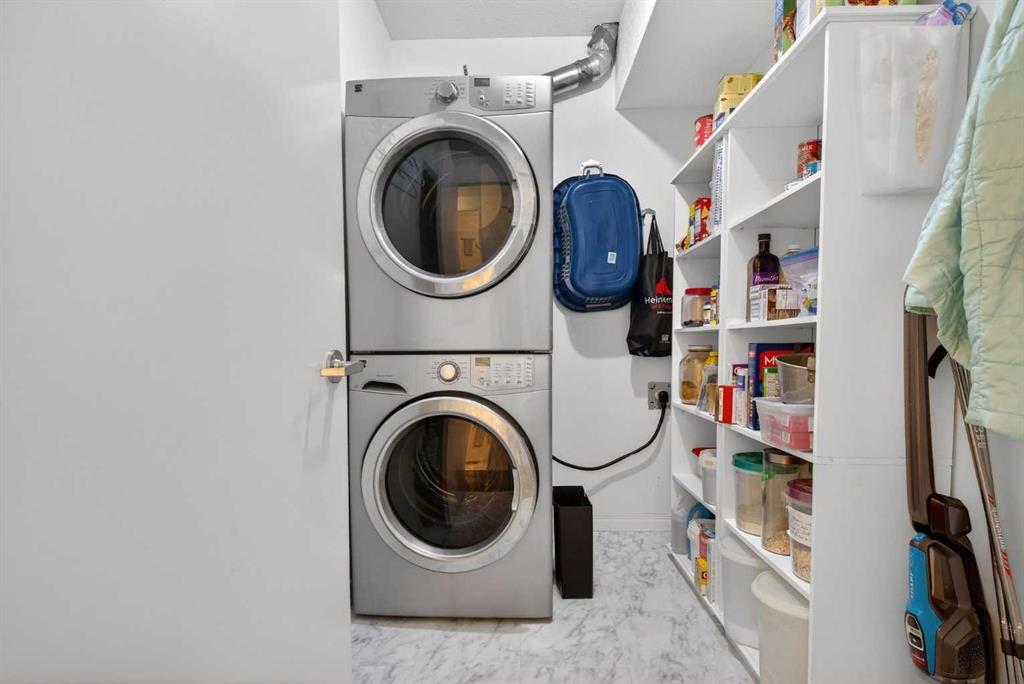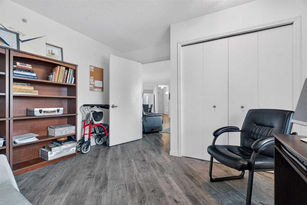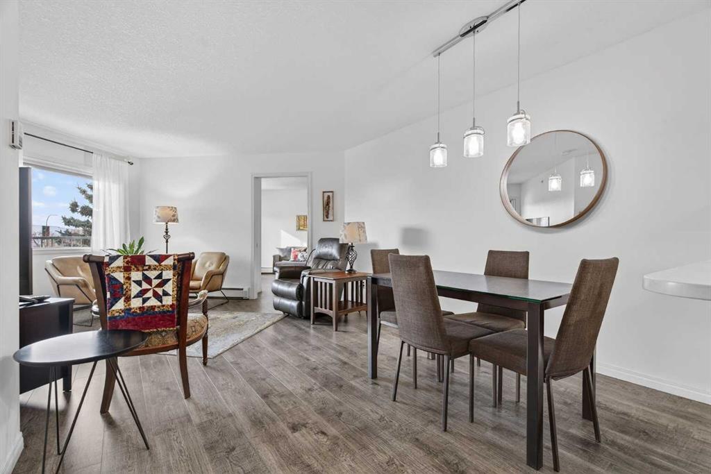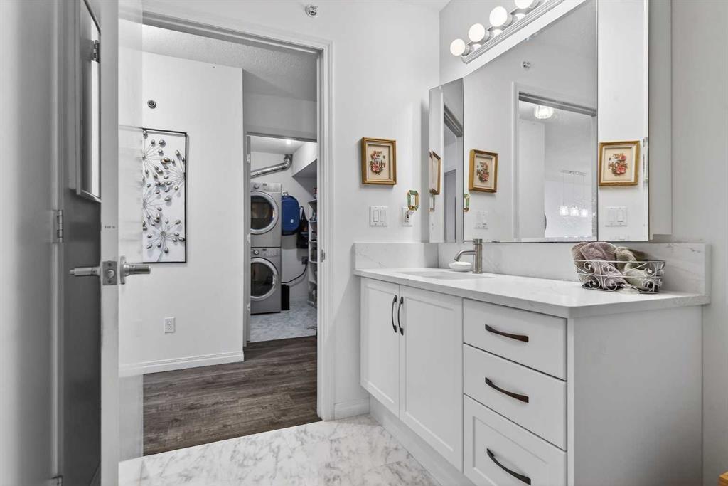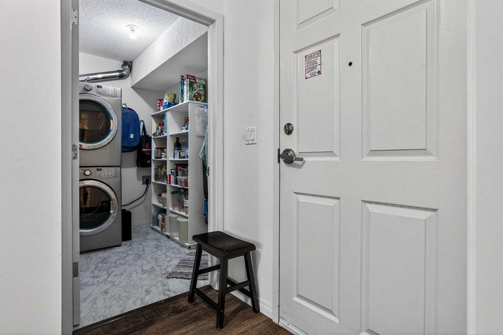 TOP FLOOR – 2 BED and 1 BATH FACING THE PARK. Welcome to Strathmore’s amazing 55+ ADULT COMMUNITY- LAMBERT VILLAGE – a sought after centrally positioned complex that enjoys a 10/10 walkability score plus SCORES OF AMENITIES WITHIN THE BUILDING. This TOP FLOOR APARTMENT enjoys over 885 sq ft of LIVING SPACE with a balcony that overlooks the quiet private green space. An OPEN FLOOR PLAN design that maximizes the SOUTHWEST facing windows that overlook the GREEN SPACE & PARK; home to our native wildlife. Easy care LAMINATE FLOORING flows throughout the unit and highlight the airiness and spacious layout. The kitchen features UPDATED CABINETRY overlaid with SLEEK QUARTZ countertops, NEW APPLIANCES and a double stainless sink. Enjoy the comfort and ease of serving dinner or informal meal times at the EAT UP COUNTER. Flowing from the step saving kitchen is an OVERSIZED LIVING ROOM that easily accommodates a sofa and easy chair for larger gatherings. King sized furniture is doable in the oversized primary retreat that boasts a huge double closet and ample space to add an armchair. The 2ND BEDROOM is spacious and also overlooks the quiet park behind. There is a 3 pc bath that has a beautiful walk in shower with a large seating area. An exceptionally spacious vanity for toiletries and towels has been updated as well with quartz counters. There is additional storage in the washroom for linens too. IN-SUITE LAUNDRY is located adjacent to the washroom and also features extra storage for brooms and mops. There is also additional storage down the hall for your seasonal items at no additional charge. The fitness room is just steps away. An assigned parking stall is located close to the front door. LAMBERT VILLAGE offers an on-site HAIR SALON, WELLNESS ROOM, MEDIA/GAMES/REC ROOMS, CRAFT AND WORKSHOP AREAS, WELL STOCKED LIBRARY and a fully equipped kitchen for resident gatherings or private family party’s. A PRIVATE GUEST SUITE is available for overnight guests for a nominal fee with pre registration through the office and is located within steps of this unit for ease of your your company. For the active retiree, there is on site RV PARKING and additional visitor parking. CALL TODAY to view your new home; surrounded by beautiful parks, walking paths, Kinsmen Park and Lake. YOU WON’T BE DISAPPOINTED! Condo fee includes, parking, snow removal, water, sewer, trash, heat, cable TV, grounds maintenance, interior maintenance of the common areas plus all the amenities. Call your favorite realtor today to view this move in ready home.