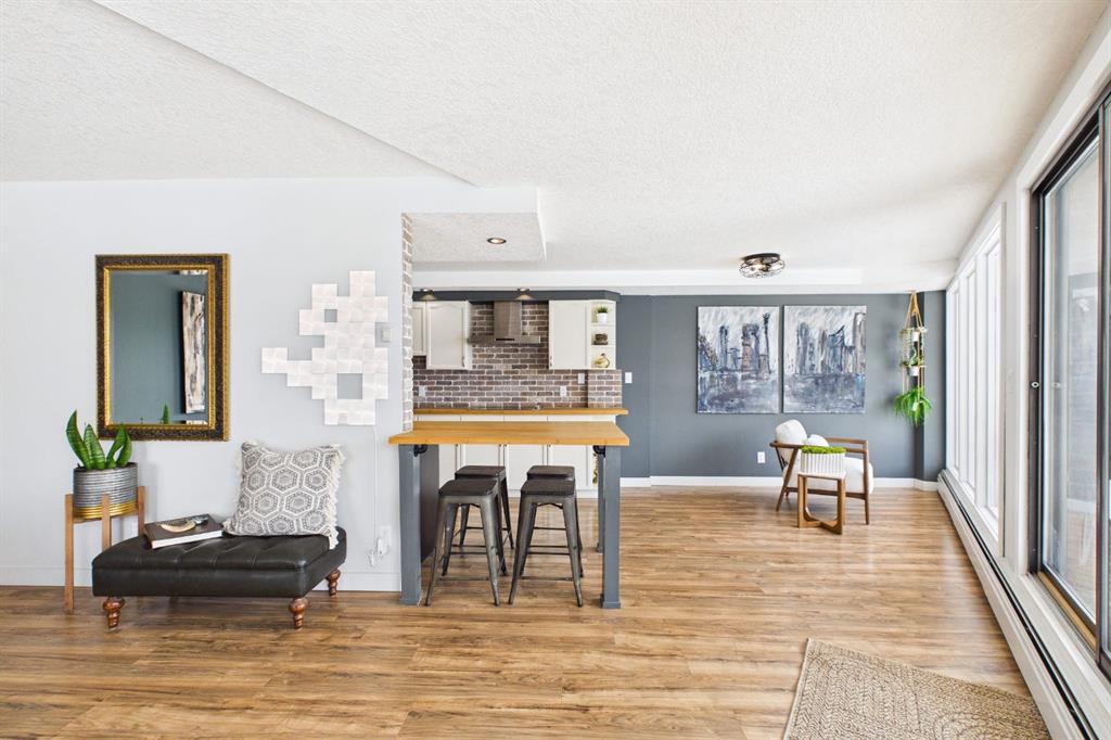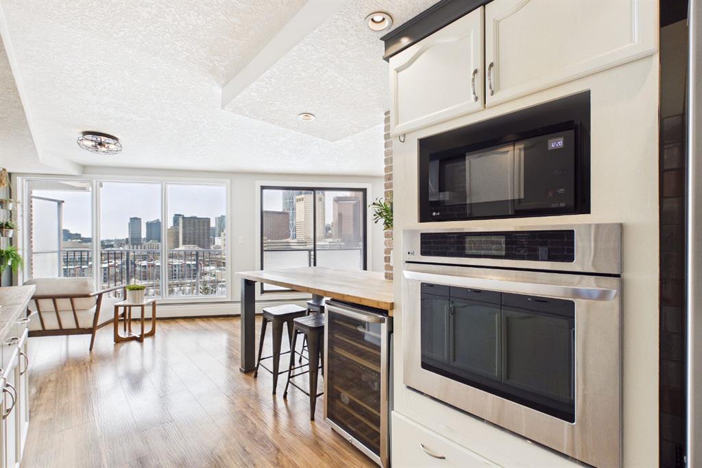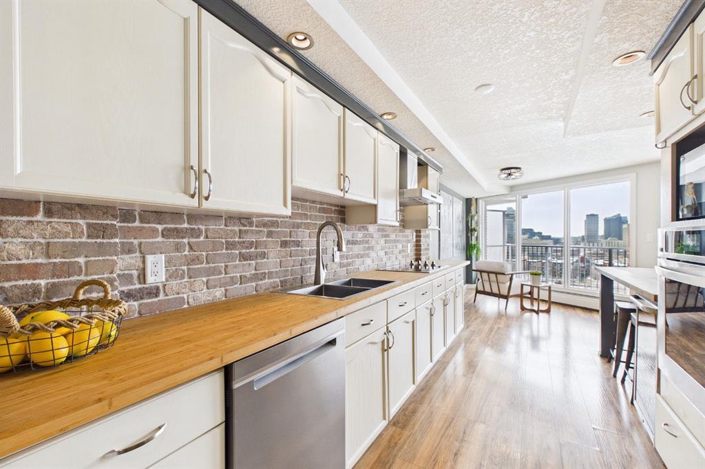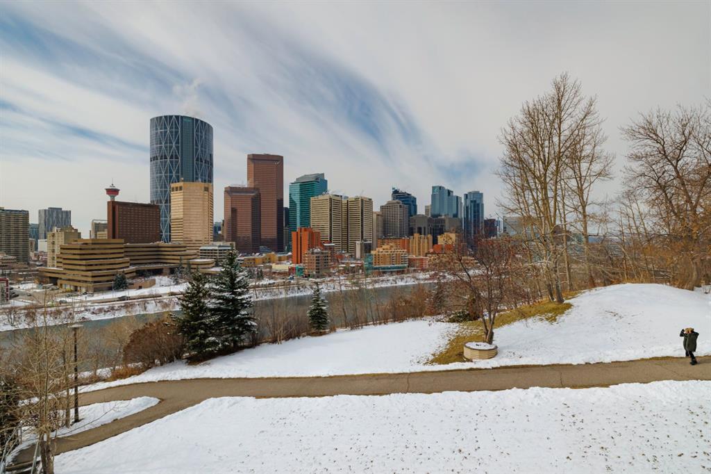 Experience elevated urban living in this stunning, updated one-bedroom sanctuary located in the prestigious Holly Park building of Crescent Heights. Boasting breathtaking panoramic views of the Bow River and the downtown skyline, this residence radiates pride of ownership through its modern finishes and unique, entertainer-friendly layout. Sun-drenched living and dining areas feature warm laminate flooring and expansive windows that open onto a massive wrap-around balcony, while the renovated kitchen impresses with custom tile work, bamboo countertops, and sleek built-in appliances. The generous primary suite offers a wall-to-wall closet and seamless access to the four-piece bath, but the true hidden gem is the ultimate convenience of same-level parking—your vehicle is located just across the hall. Beyond your front door, enjoy amazing amenities including an indoor pool, sauna, fitness centre, squash courts, and library all within walking distance of the city’s best biking trails and the downtown core.