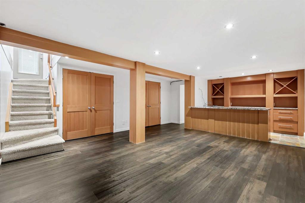 The primary suite provides a comfortable retreat, complete with custom closets and warm, relaxing tones. Downstairs, the fully developed basement extends the living space with a large family area and an impressive wet bar with dual wine racks and display shelving — an ideal spot to unwind or host friends.