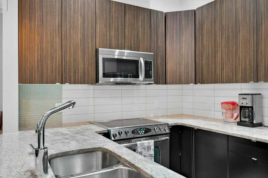 Welcome to this beautifully designed 2-bedroom + den, 2-bathroom home that blends luxury, comfort, and convenience in one of the quietest buildings in the area. From the moment you step inside, the impressive 10 & 11-ft ceilings create a bright, spacious, and elevated feel throughout the open-concept layout. The modern kitchen offers excellent functionality with a large pantry, premium finishes, and plenty of room for cooking and entertaining family and friends. The living area extends seamlessly to your private balcony, perfect for enjoying a morning coffee or simply unwinding at the end of the day. Both bathrooms are thoughtfully upgraded with in-floor heating, providing year-round comfort. The home also includes custom blackout blinds, ideal for privacy and restful nights, along with central heating and air conditioning with in-unit controls for personalized comfort in every season. A dedicated laundry room with extra storage adds convenience, while the building itself enhances your daily living with an exceptionally quiet atmosphere, a separate storage unit, and a titled parking stall. You’ll also appreciate the added security and service of a Monday–Friday concierge (9 am–5 pm). Perfectly appointed and impeccably maintained, this upscale condo offers a rare blend of luxury features and everyday practicality—truly a rare opportunity.