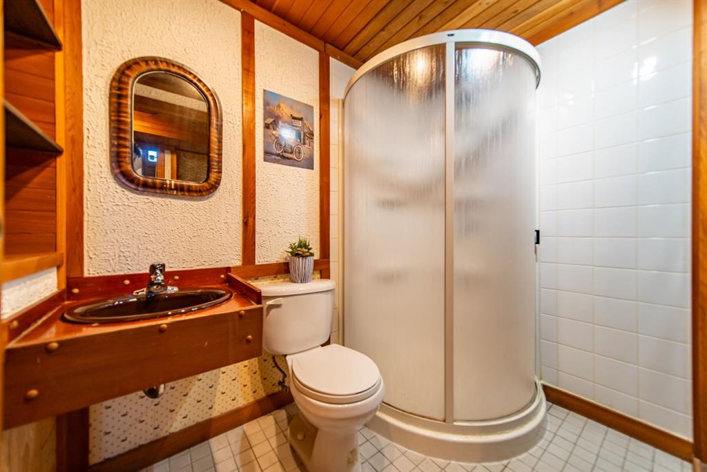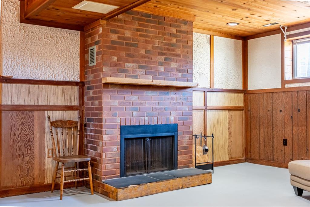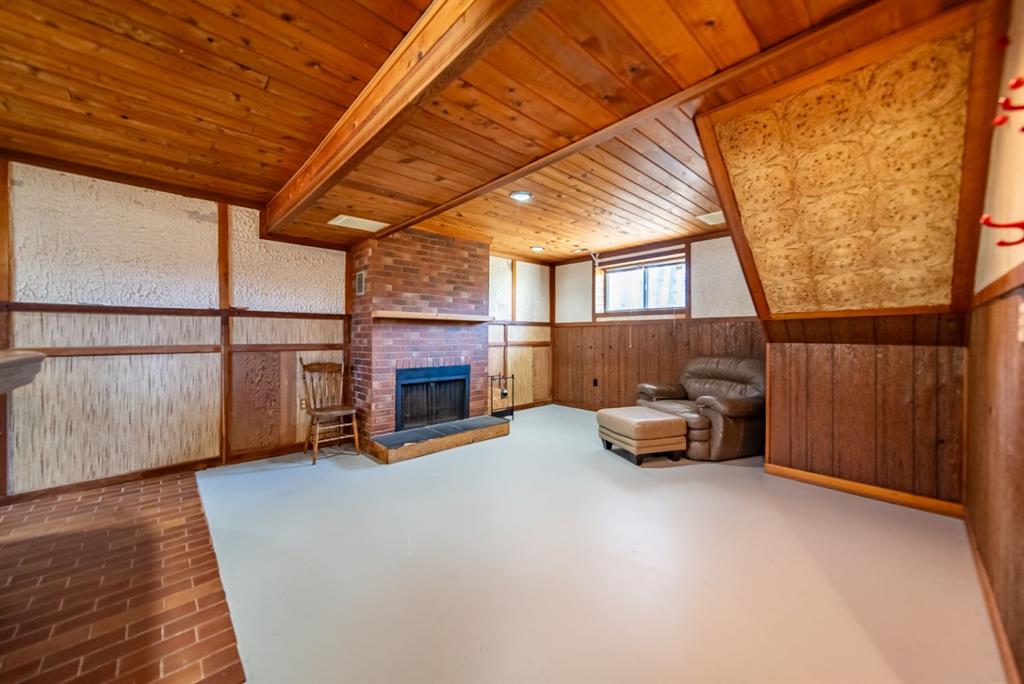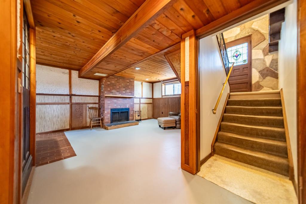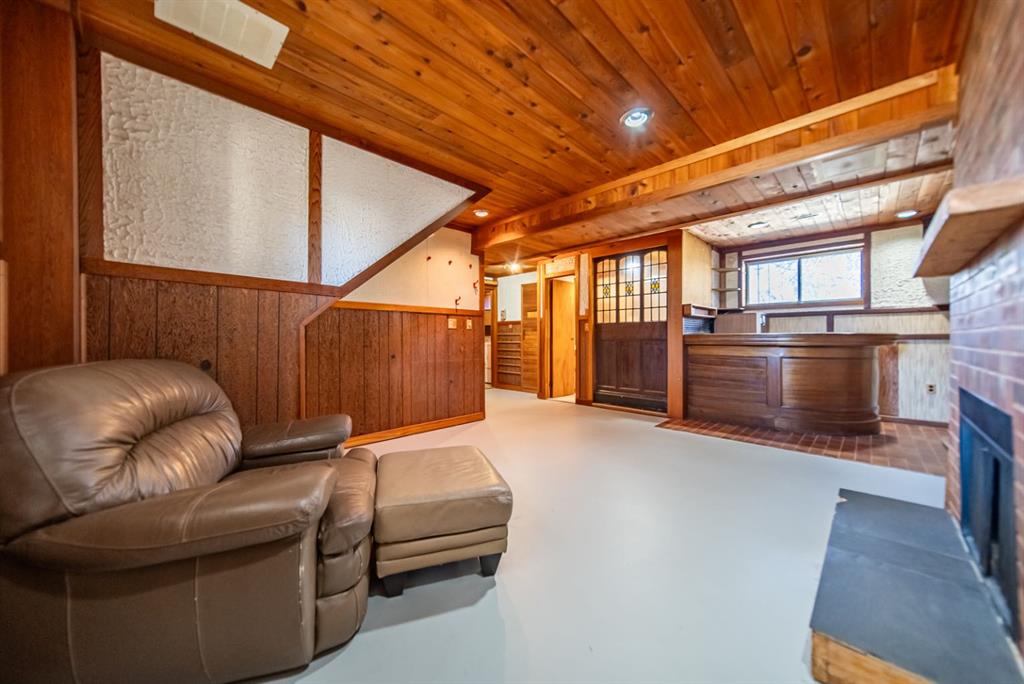 The lower level is where this home truly surprises you. A generous rec room with a brick woodburning fireplace, tongue and groove wood ceiling, and a built-in bar complete with sink and bar fridge. A striking stained glass feature wall anchors the bar area. A cedar sauna rounds out a lower level built for entertaining and unwinding.