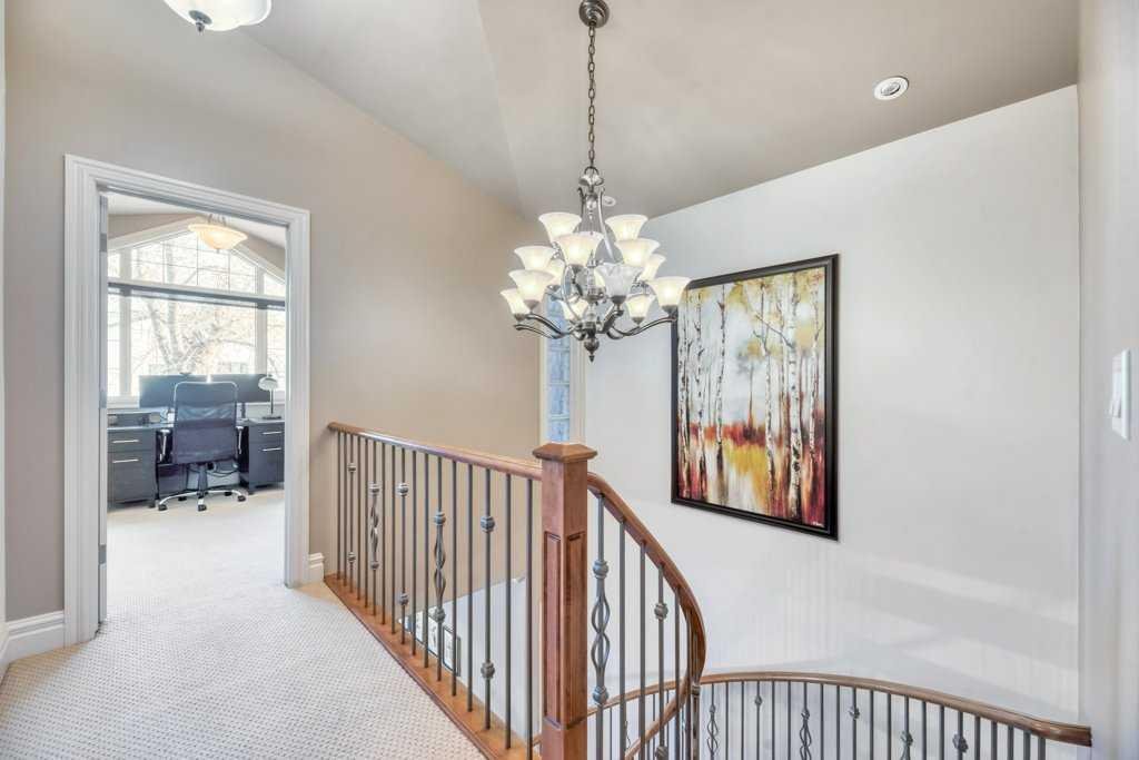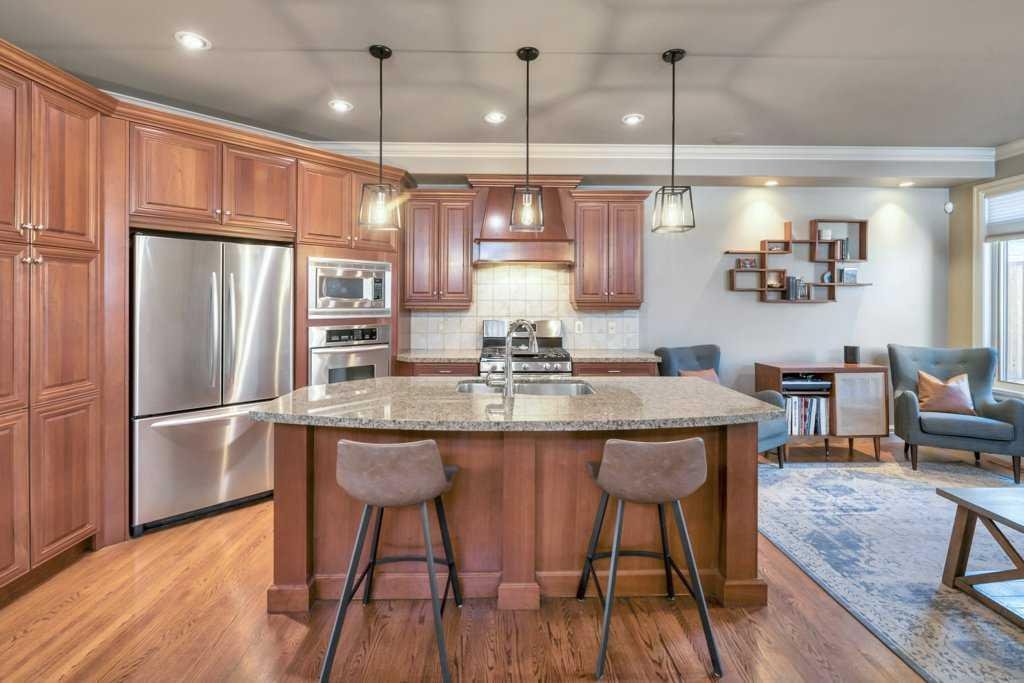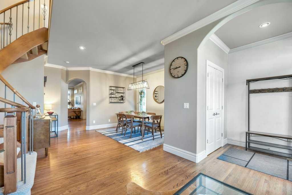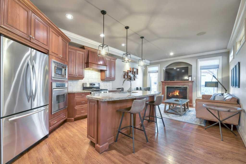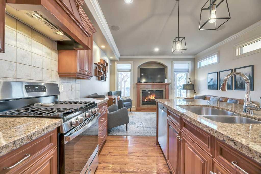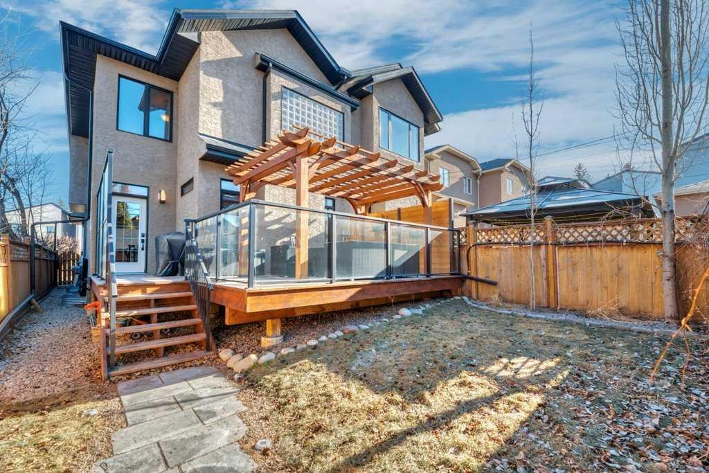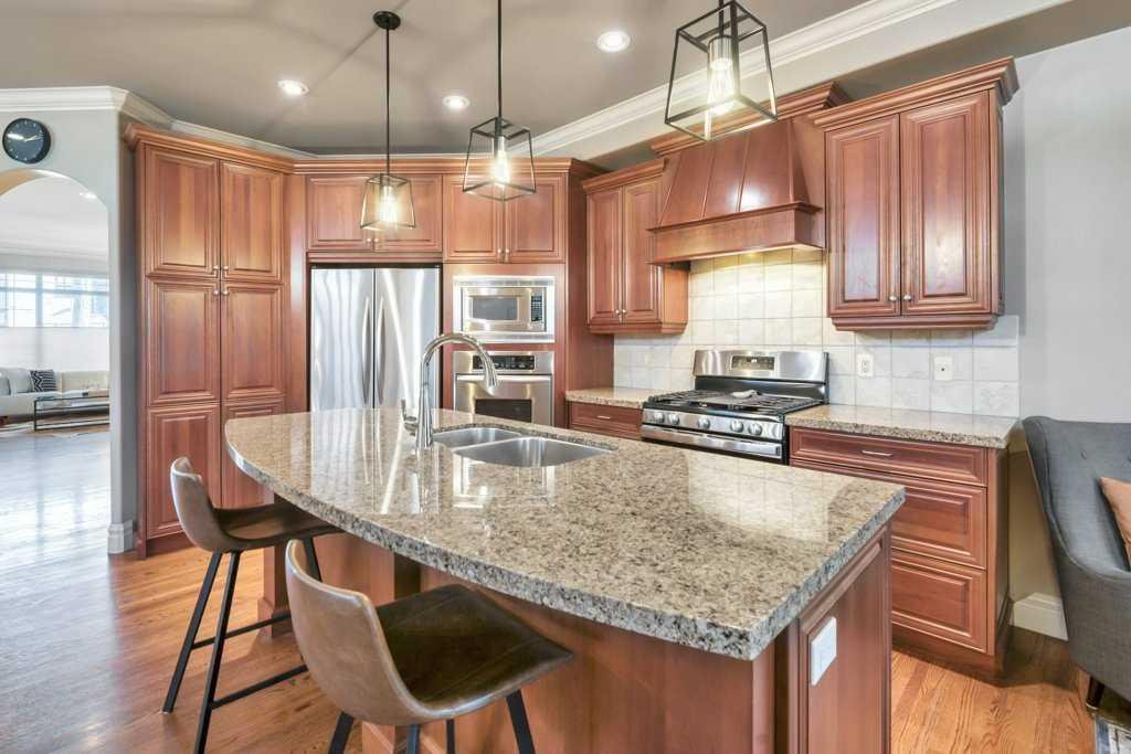 This beautifully crafted custom home showcases timeless architecture, refined finishes, and a highly functional layout, ideally situated on a quiet street with convenient access to schools, parks, and transit. Designed for both elegant entertaining and comfortable everyday living, this residence offers an exceptional balance of style and substance. The inviting foyer opens to formal living and dining areas highlighted by gleaming hardwood floors and soaring 9-foot ceilings, setting a sophisticated tone throughout the open-concept main level. The chef-inspired kitchen is a standout, featuring granite countertops, an oversized central island, stainless steel appliances including a new gas range (2023), wall oven, and tiled backsplash. The kitchen flows seamlessly into the dining nook and family room with fireplace, creating an ideal space for hosting or relaxed evenings at home. A striking curved staircase leads to the vaulted upper level, where the king-sized primary retreat offers a true executive escape. The spa-inspired ensuite features double sinks with granite counters, a soaker tub, a large separate tiled shower, and a three-sided fireplace shared with the bedroom. A generous walk-in closet completes this private sanctuary. Two additional well-appointed bedrooms and a full 4-piece bathroom complete the upper floor. The fully developed basement extends the living space with a bright family and recreation room, an additional spacious bedroom, and a full bathroom—ideal for guests, a home office, or extended living. A newer mudroom addition (2022) leads to a professionally designed deck with pergola, also completed in 2022, offering an elegant outdoor setting for entertaining and relaxation. The landscaped yard, paved lane, and double detached garage provide both functionality and convenience. Meticulously maintained with extensive upgrades, this home reflects true pride of ownership, including new shingles, downspouts, and gutter guards (June 2025), a new electrical panel and wiring (Nov 2025), updated main-floor lighting (Apr 2021), and new upstairs and basement bathroom fixtures (July 2024). A complete list of improvements is available in the Supplements. An exceptional opportunity for the discerning buyer seeking quality, comfort, and quiet sophistication—book your private showing today.