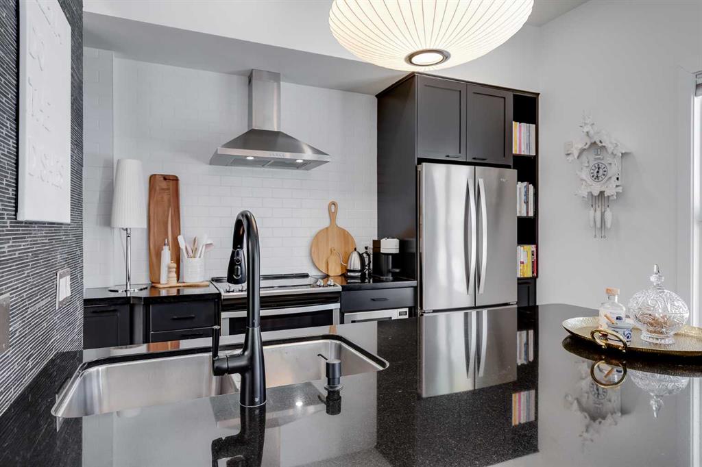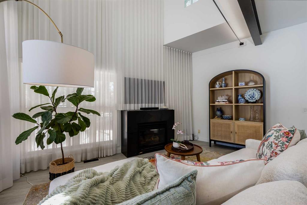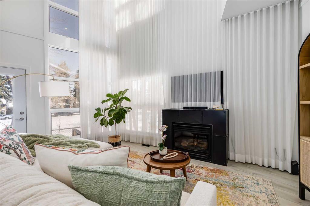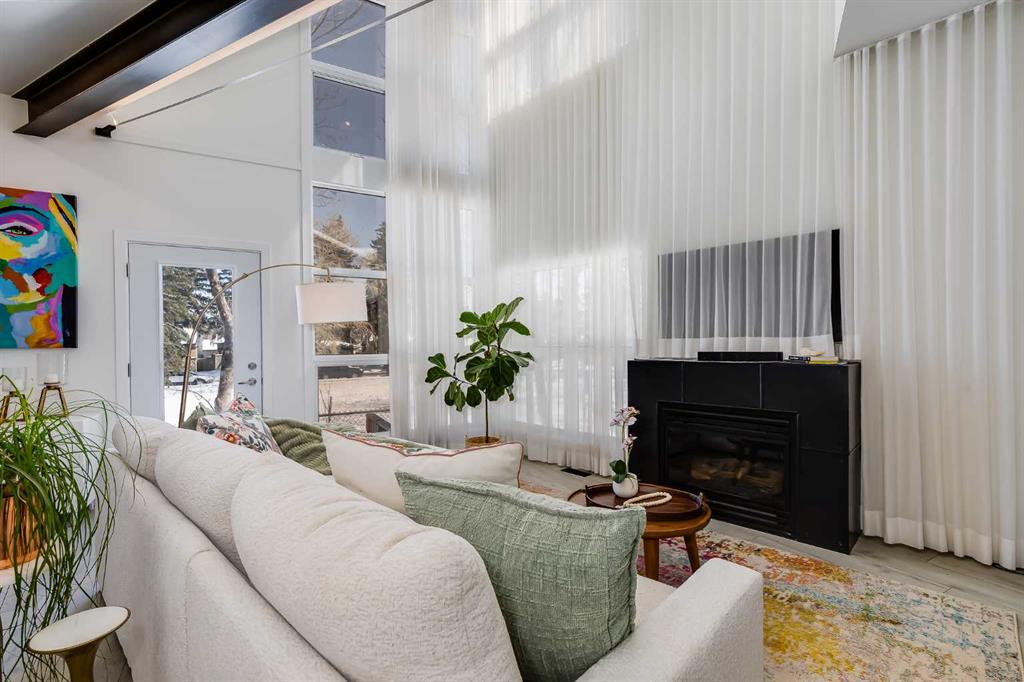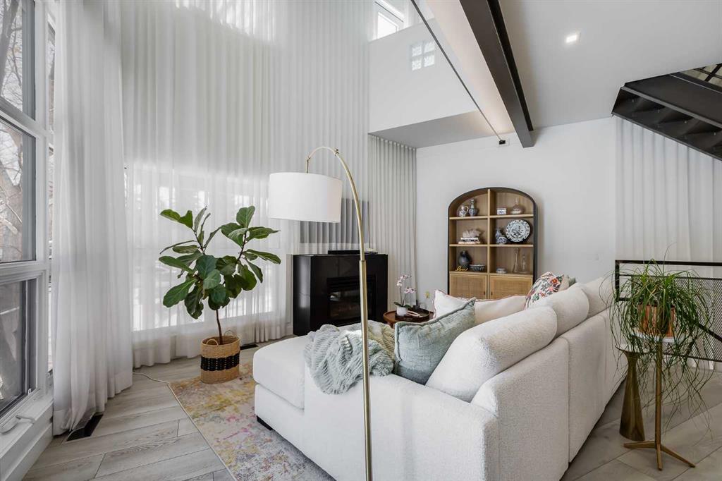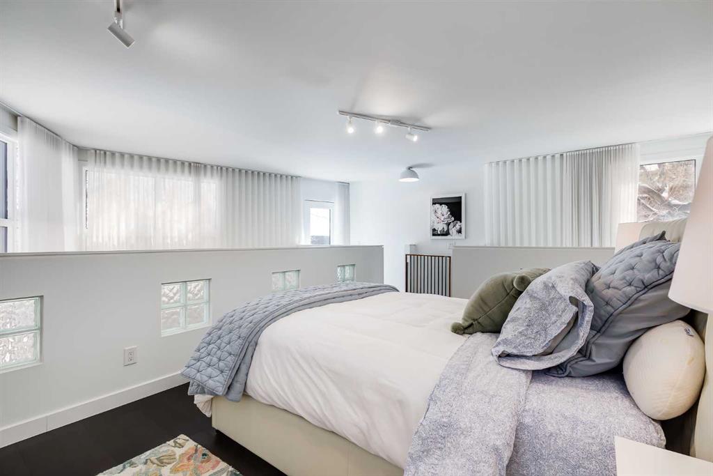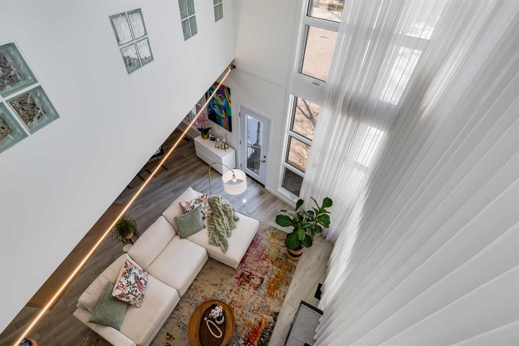 This distinctive end-unit townhouse in the sought-after community of Inglewood offers a rare opportunity for those seeking a flexible live/work environment, with the ability to operate a business subject to board approval, or simply enjoy a unique place to call home. With over 2,100 square feet of developed living space, this is the largest residence within an exclusive 12-unit complex, tucked along a quiet, tree-lined street just steps from the neighborhood’s well-known shops, restaurants, and amenities. The exterior presents a modern blend of stucco and corrugated metal siding, complemented by oversized, energy-efficient reflective windows. Inside, over $80,000 in renovations enhance both form and function. The main floor opens with a generous entryway and continues into an open-concept layout grounded by wide-plank vinyl flooring. Soaring 18-foot ceilings, expansive windows, and full-height drapery bring in natural light and add dimension, while subtle industrial elements, including exposed steel features, contribute to the home’s architectural character. The kitchen is both practical and refined, featuring black cabinetry, granite countertops, a stylish backsplash, stainless steel appliances, and a large island with seating. Adjacent dining and living areas provide a comfortable setting for everyday living or hosting, with designer lighting over the dining space and a gas fireplace anchoring the living room. Full-height windows frame views of the surrounding greenspace and park, creating a strong connection to the outdoors. A two-piece powder room completes this level. Upstairs, the entire loft is dedicated to the primary retreat, offering a private and spacious layout with cork flooring underfoot, a large walk-in closet, and a five-piece ensuite with dual sinks, a deep soaker tub, and an oversized glass-enclosed shower with bench seating. The upper balcony extends the living space outdoors, with ample room for seating and elevated views through the surrounding trees. The fully developed basement adds further flexibility with a spacious recreation area suited for a media room, office, or fitness space. A full wall of built-in shelving provides both storage and display, while additional pot lighting ensures the space is well-lit into the evening. A spacious den and a three-piece bathroom offer privacy for guests or extended use, along with additional storage. Outside, the property backs directly onto greenspace and a park, creating a natural extension of the home’s living space. A private yard offers room for a BBQ and easy access to outdoor areas. Park conveniently in any of the ample stalls at your front door or in a titled stall within the heated garage. Located in one of Calgary’s most established inner-city neighborhoods, this home is within walking distance to boutique shopping, dining, cafés, and local breweries. The Bow River pathways are just minutes away, and you’ll enjoy quick access to downtown by car or public transit. Check out the 3D Tour!